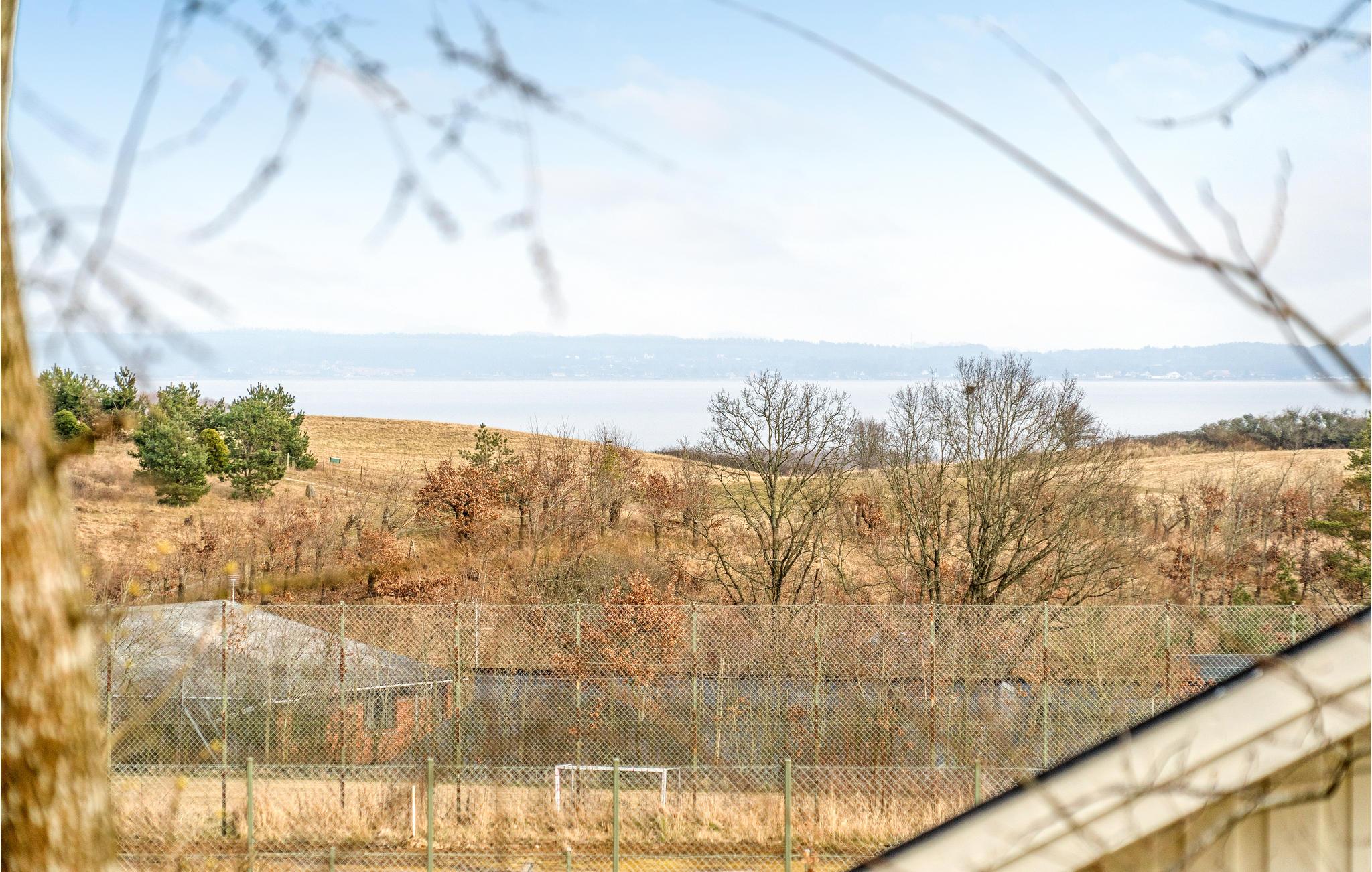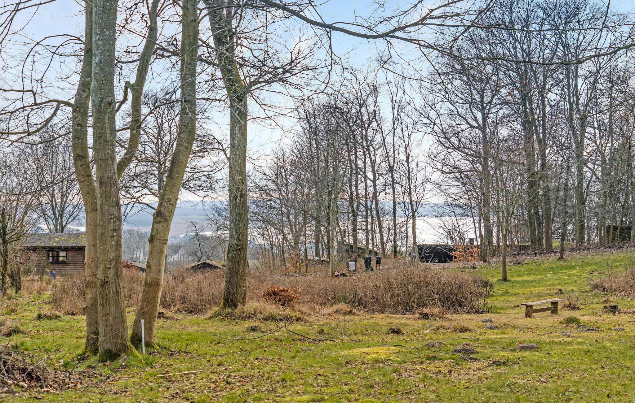Lyst og indbydende feriehus med en smuk, dyb udsigt til Helgenæs og Begtrup Vig fra den ugenerede have.