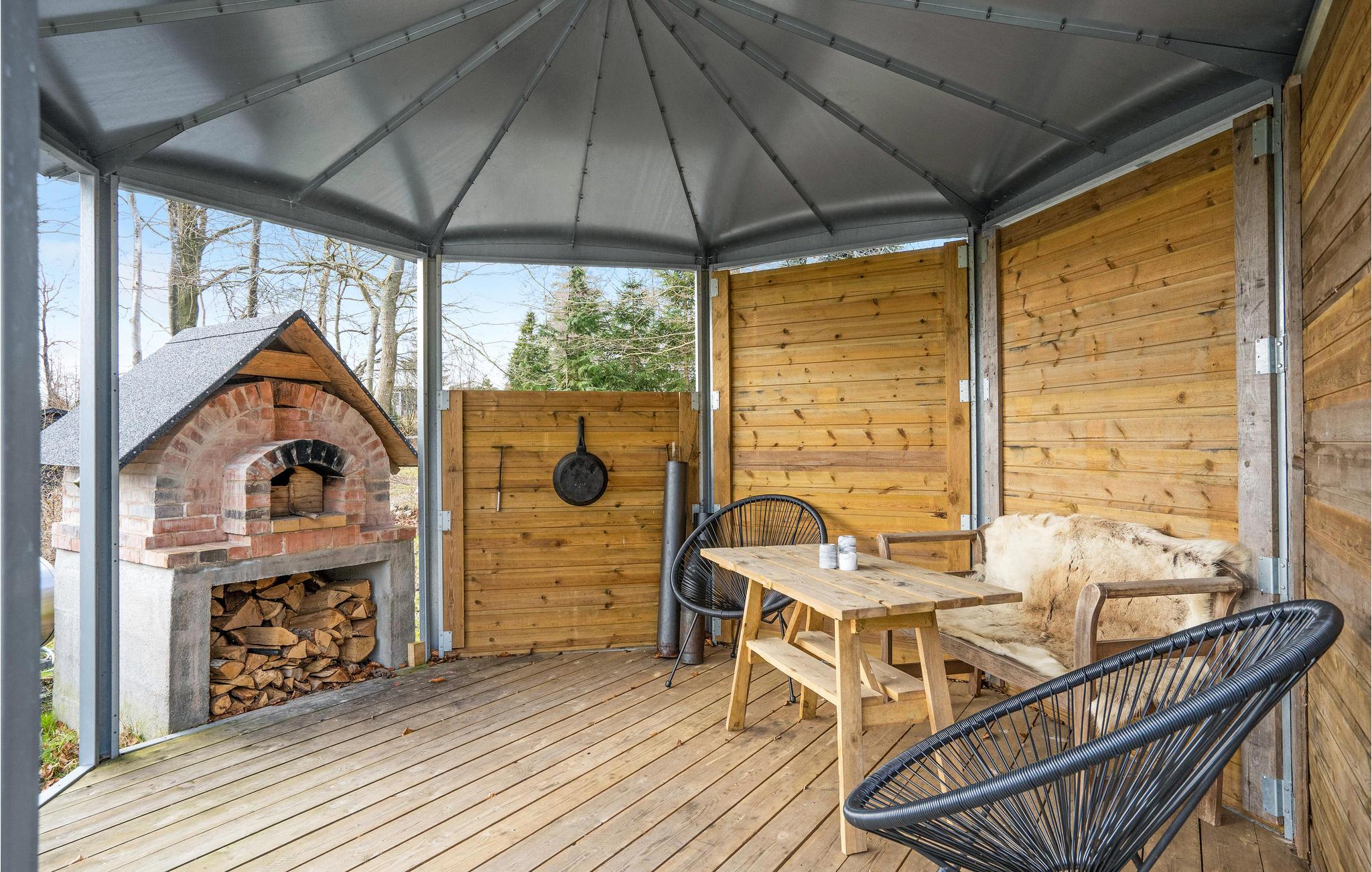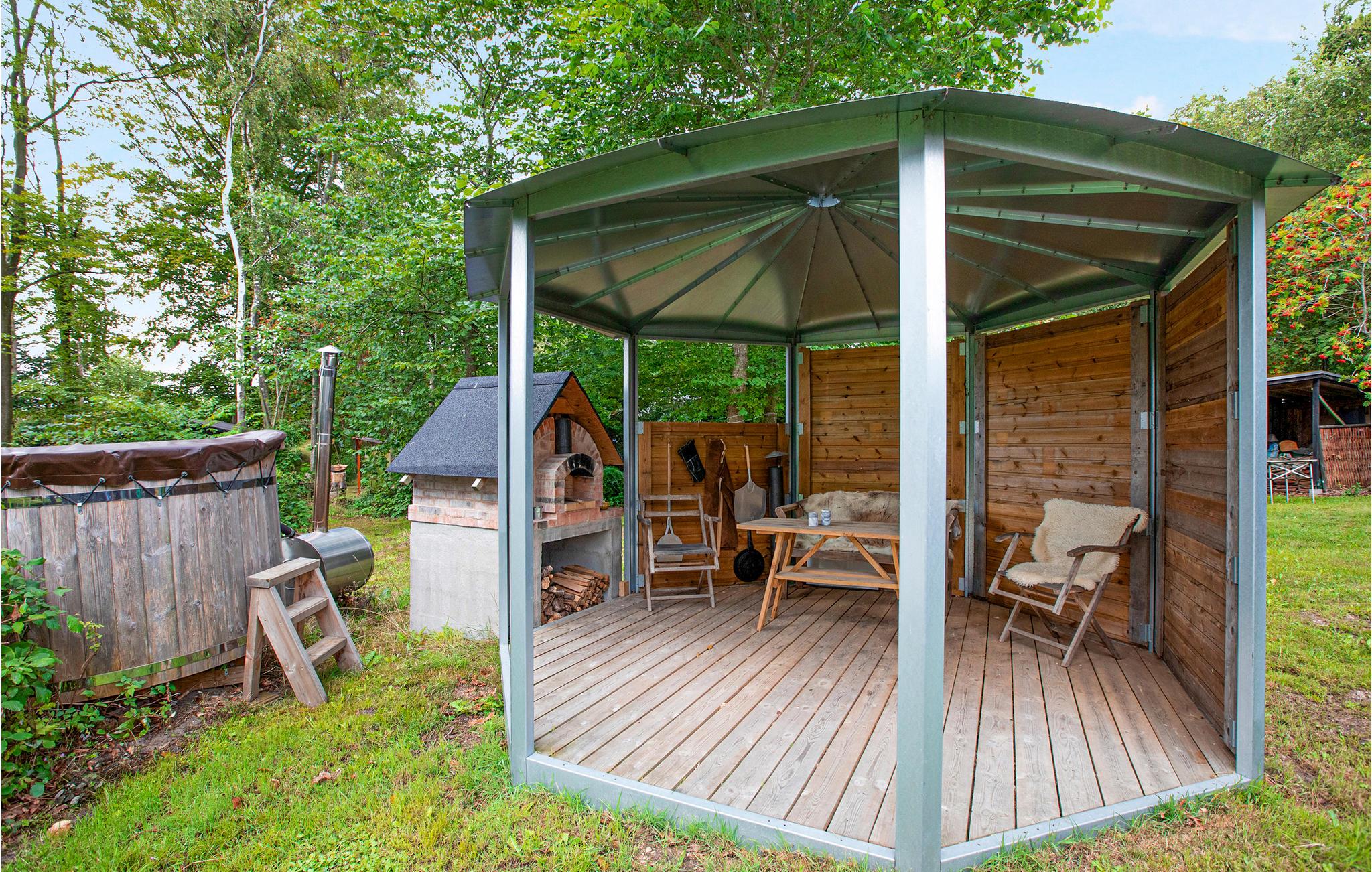 Rundt om huset løber en stor solterrasse med flere gode kroge. Endvidere byder haven på en skøn pavillon med stenovn, hvor I kan tilberede de lækreste pizzaer på de lange, lyse sommeraftener. På grunden er også et shelter, som børnene kan bruge til leg eller I kan snuppe en nat i det fri. Endelig er der et bålsted med tilhørende madlavningsudstyr og en kulgrill. Ideelle rammer for familien, der holder af natur og udeliv.