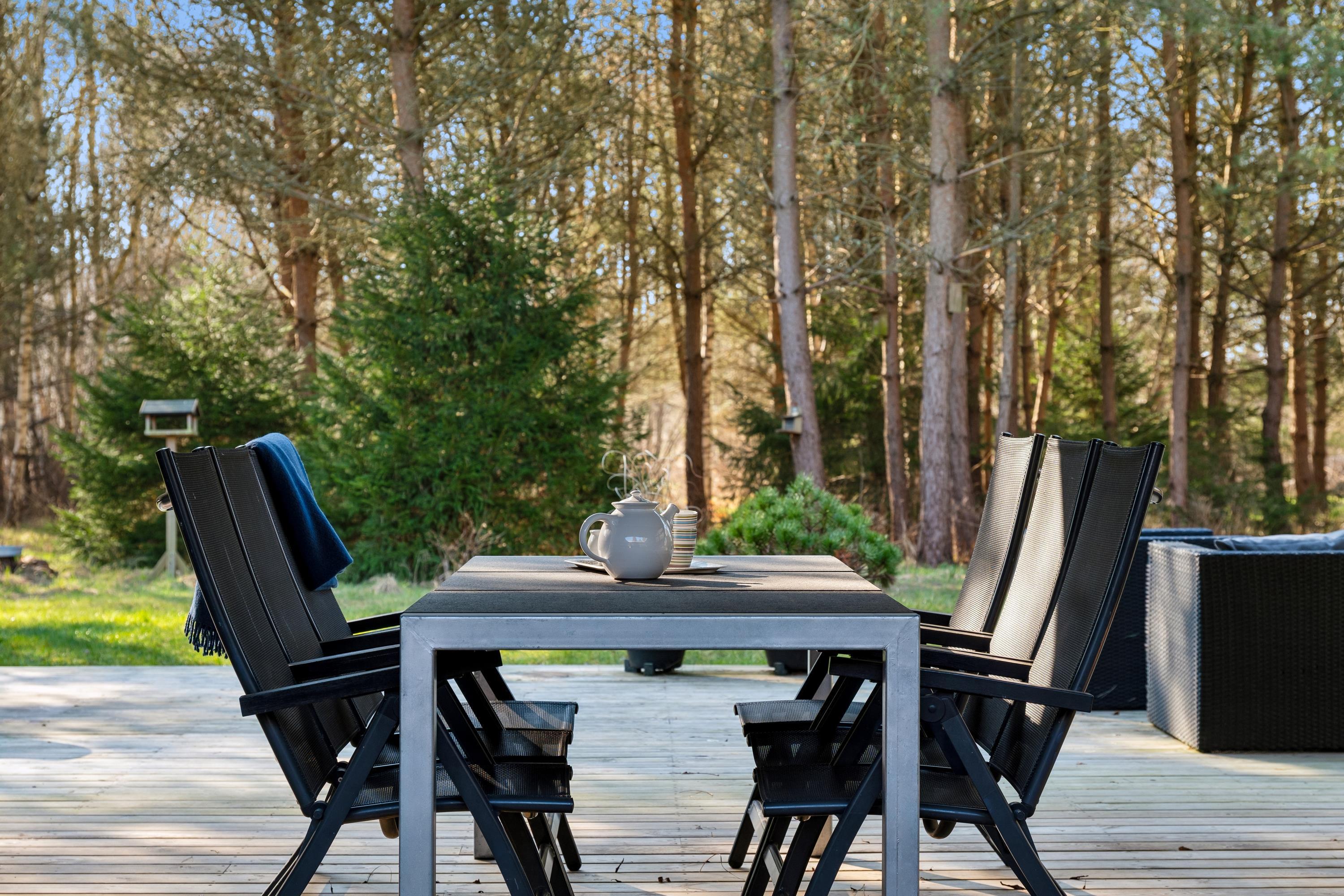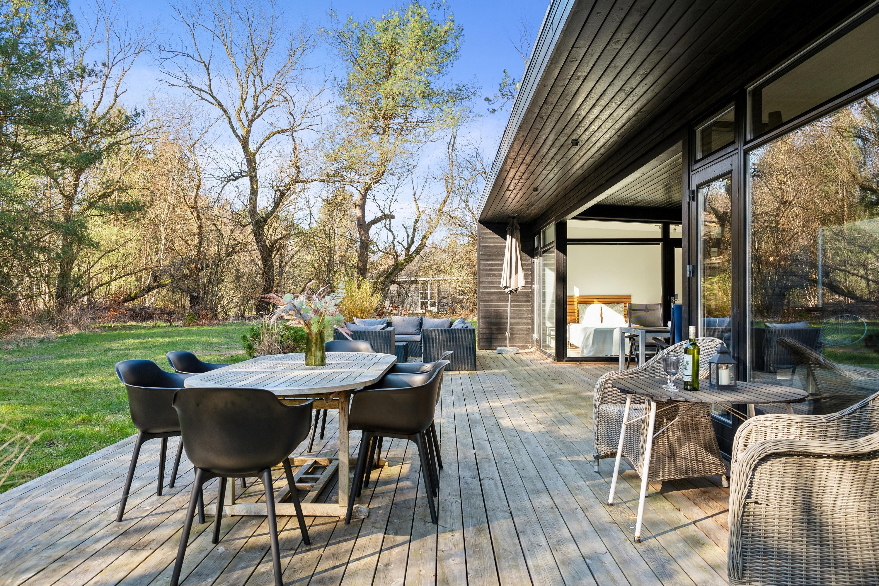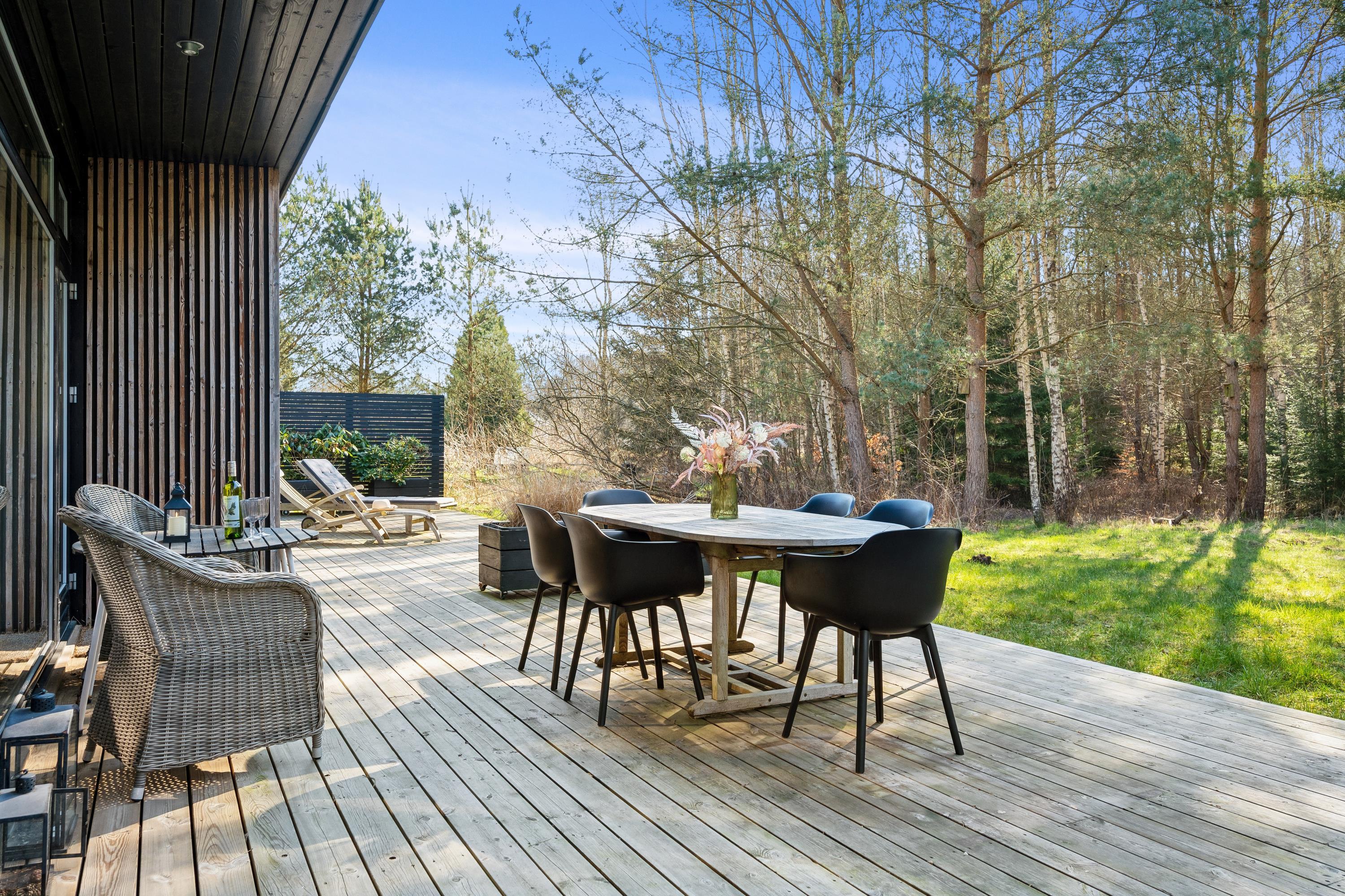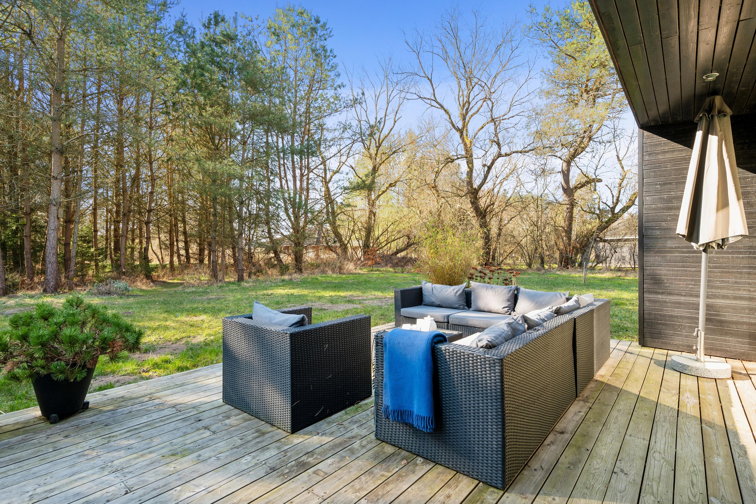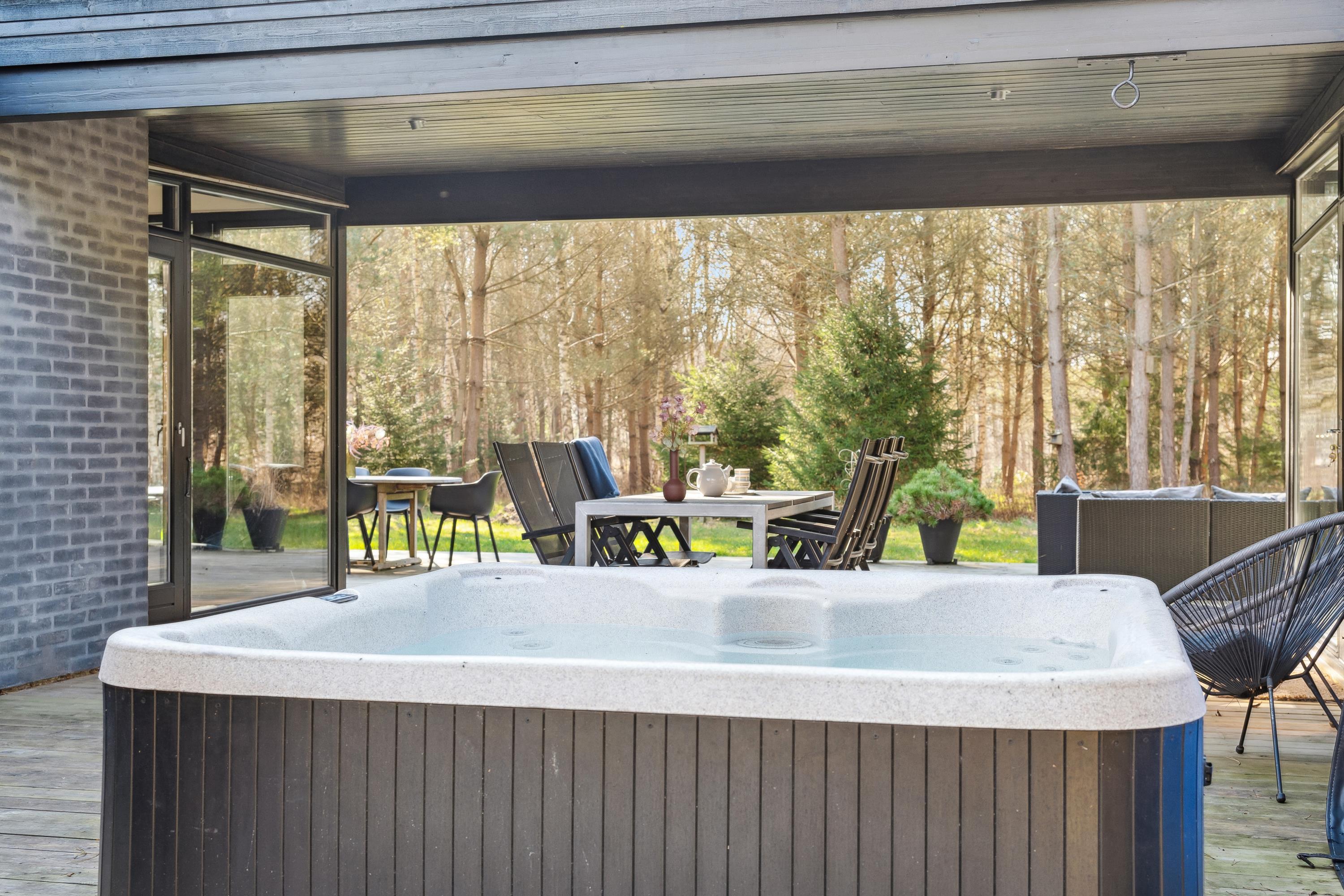 I skovens dybe stille ro bliver man budt velkommen til dette helt unikke feriehus. Huset er beliggende på en 6000 m2 stor naturgrund med masser af plads til udendørs leg og hygge. Her finder man en dejlig lys og indbydende stue, hyggeligt møbleret med gode møbler, pejs og varmepumpe. Flot køkken med en dejlig spiseafdeling. Sovepladserne finder man i tre gode værelser, alle med udgang til terrasse. Flot badeværelse med adgang til sauna, vaskemaskine og tørretumbler og her finder man også et nedsænket spa-bad, hvor der er mulighed for at ligge og kigge ud i haven. Fra stuen er der udgang til stort overdækket terrasseareal med havemøbler og hvor man finder den lækre udendørs-spa. Her finder man også husets flotte møblerede anneks med en god dobbeltseng og eget badeværelse. Rigtig velegnet til nogle større børn eller et hold bedsteforældre som har brug for at trække sig tilbage i fred og ro. Der er masser af åben terrasser også og her finder man også gode havemøbler og liggestole. Et virkelig flot feriehus, velegnet til to familier eller en større familie.