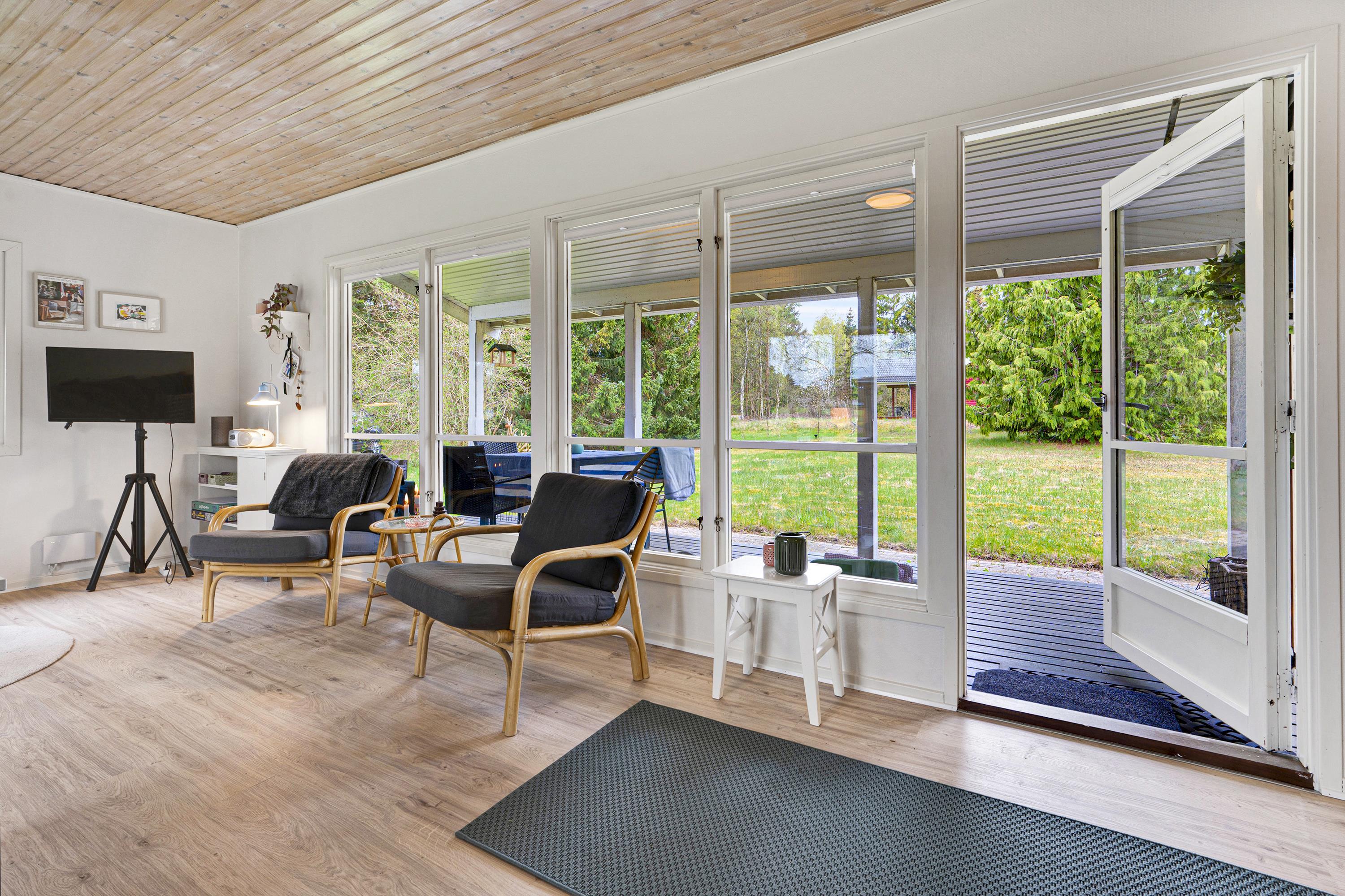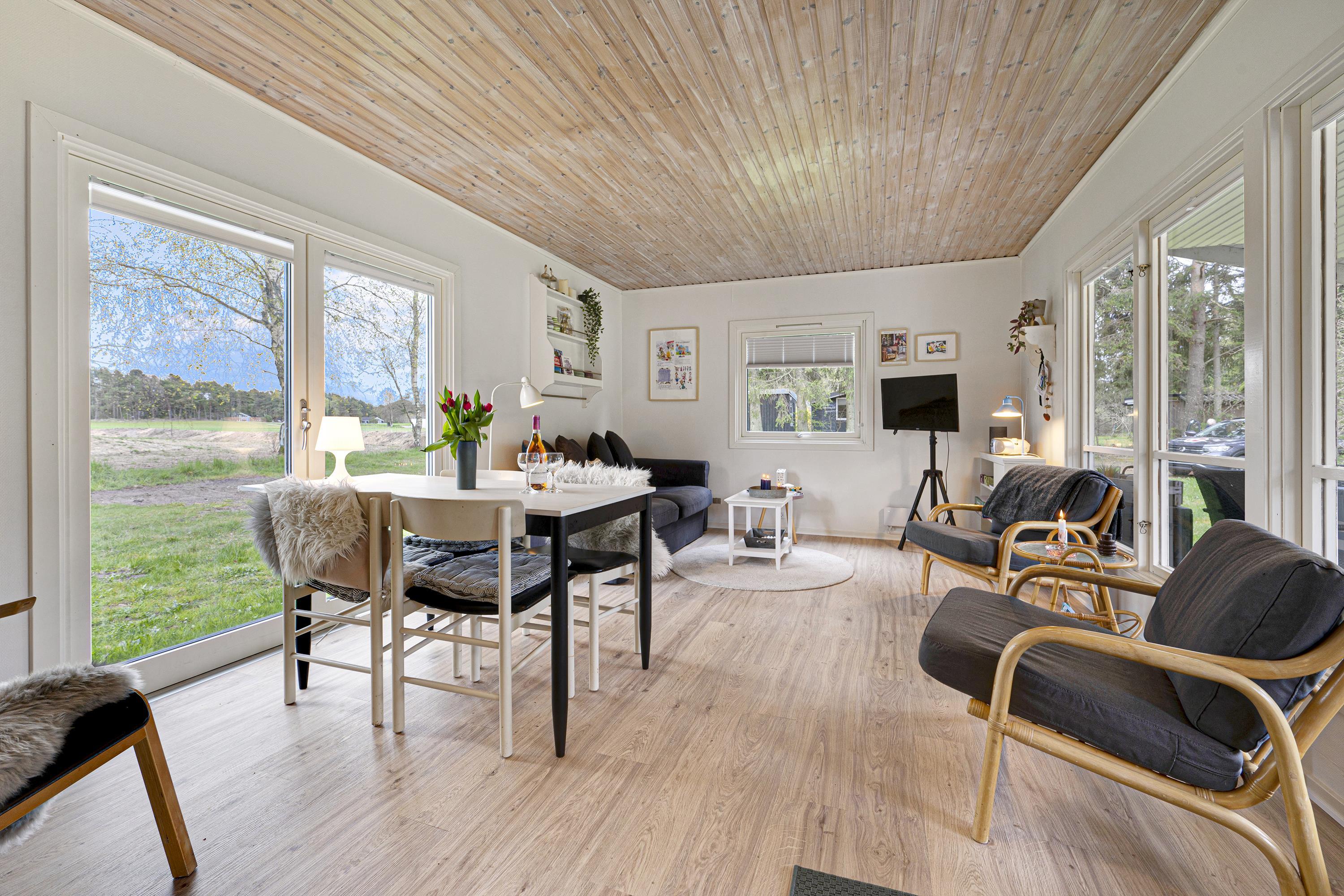 Den lyse stue i åben forbindelse med køkken har panoramavinduer og udgang til terrasse. Her er spiseplads til 6 personer, sofamøblement, lænestole og fladskærms-TV med chromecaster – bemærk, at der ingen kanaler er tilkoblet, alt indhold skal streames fra PC eller andet medie. Desuden er her CD-afspiller og radio. Nyt, lille men velindrettet køkken med keramiske kogeplader, ovn, køle-/fryseskab samt opvaskemaskine. Godt, nyt badeværelse med bruseniche og skabsarrangement. Husets 6 sovepladser fordeler sig på 2 lyse soveværelser med dobbeltseng samt en dobbelt sovesofa i stuen. Til de mindste er der barnestol. Huset har varmepumpe med aircondition, og der er internetadgang.