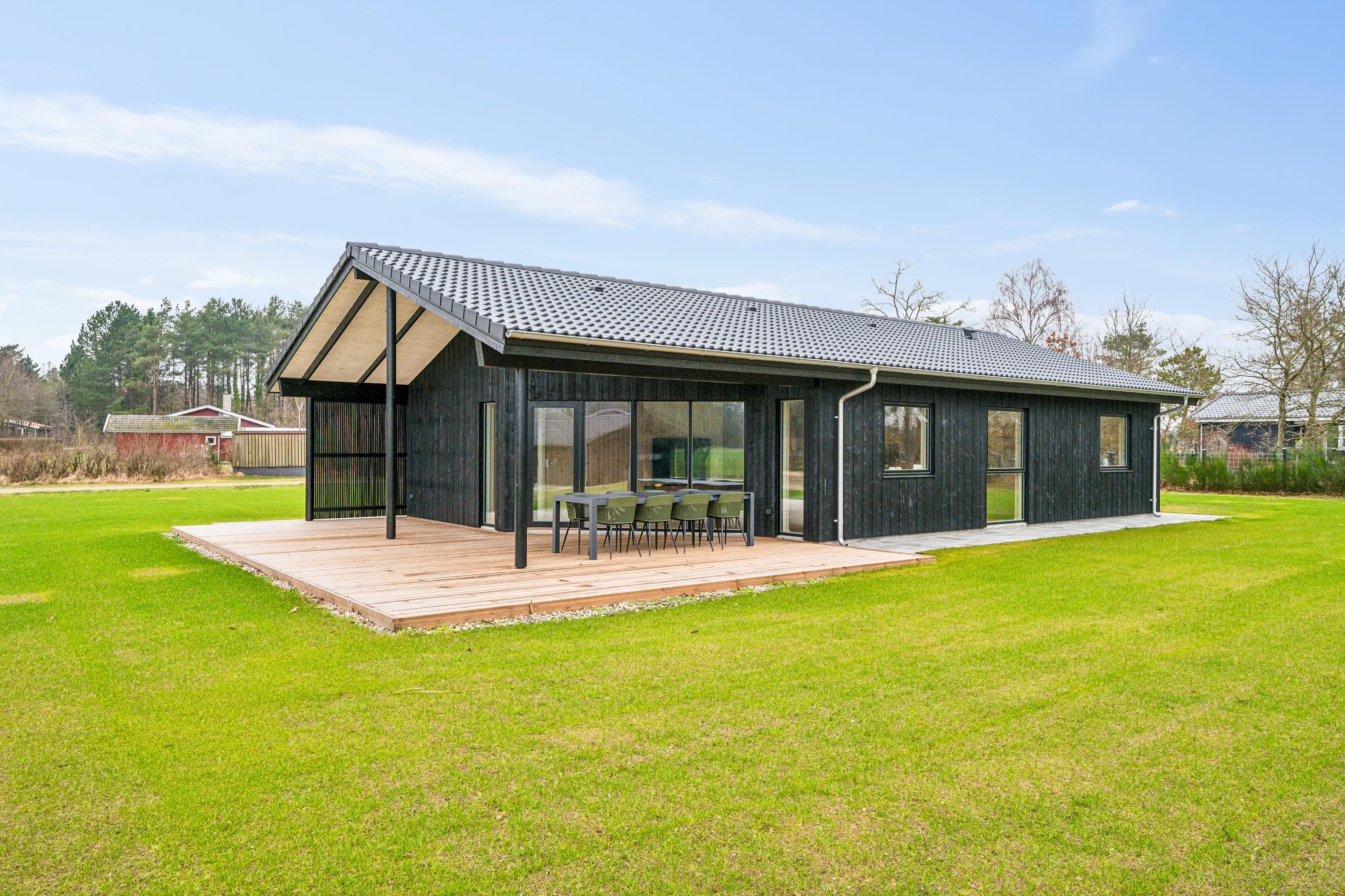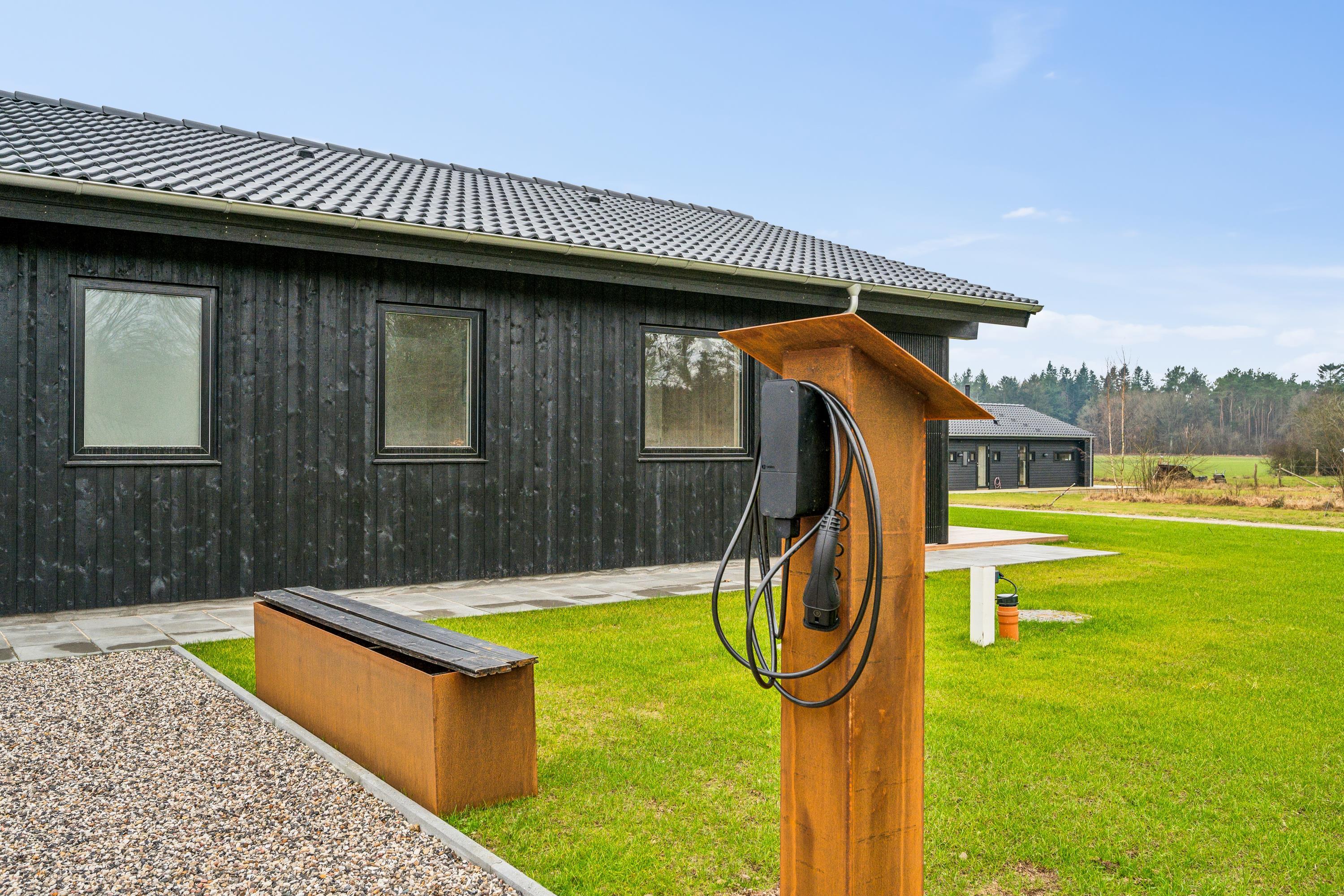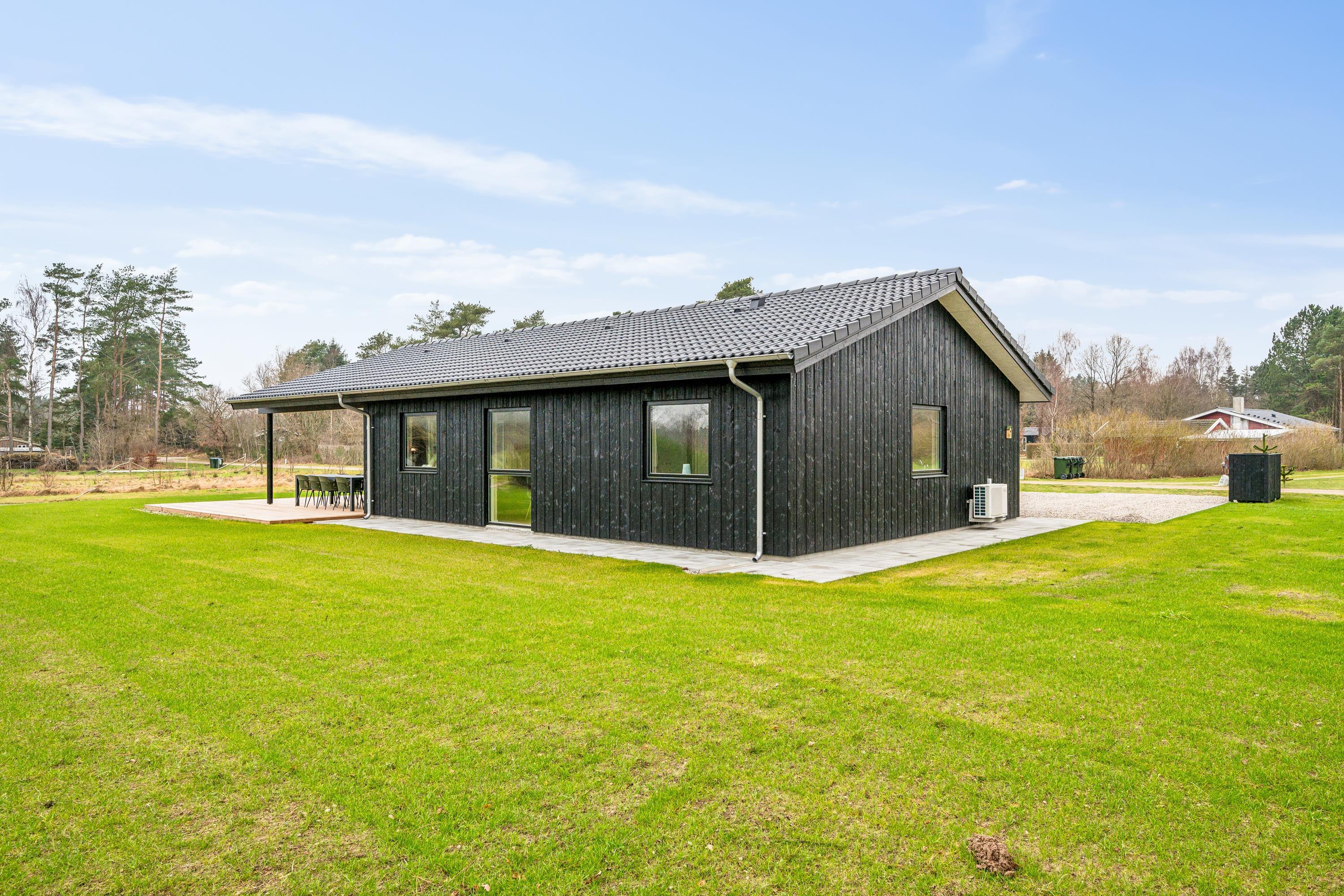 Flot nyopført feriehus nær Ebeltoft med 4 værelser, terrasse, varmepumpe og el-ladestander i fredelige omgivelser.
