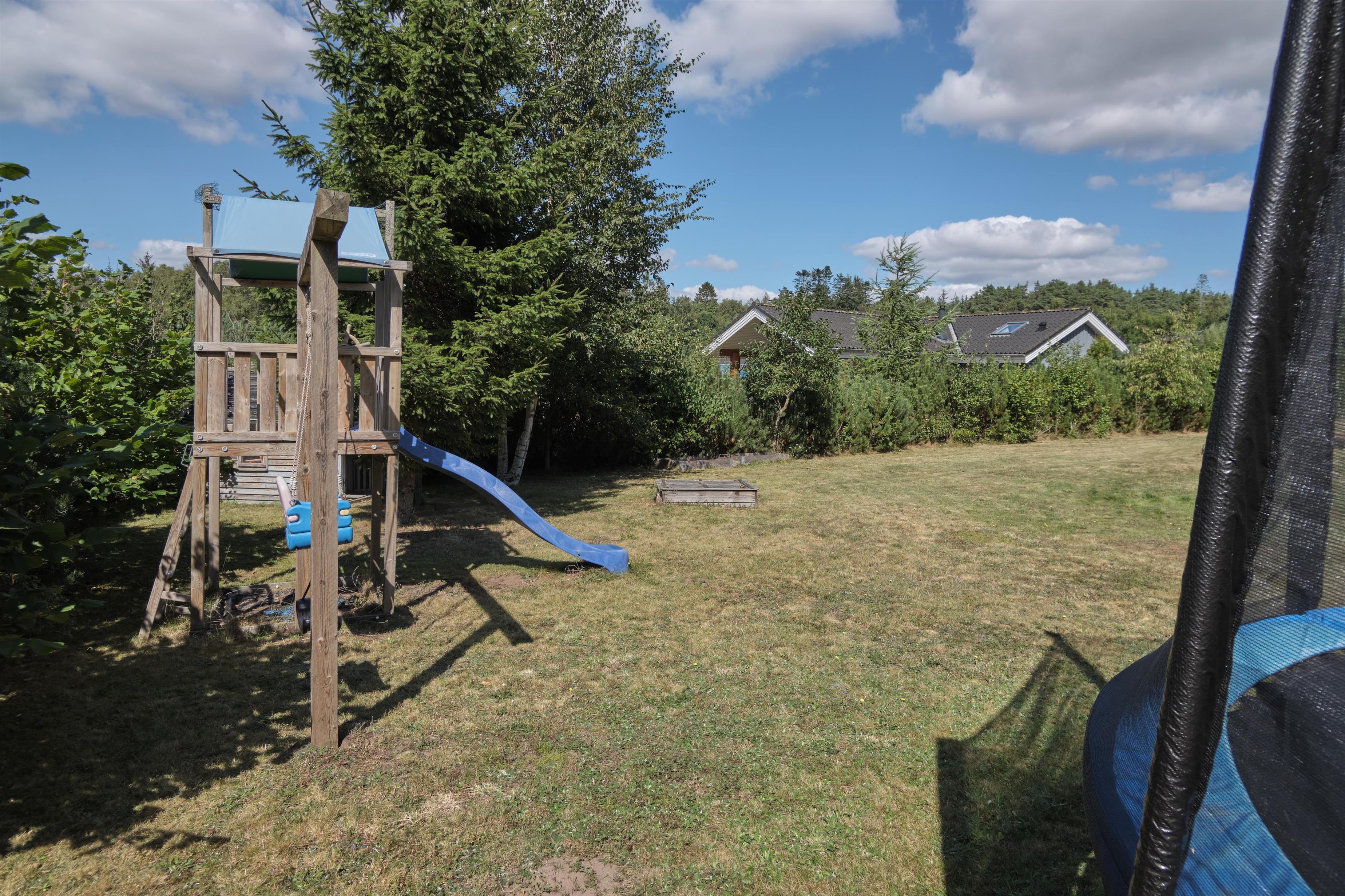 Dette dejlige feriehus er beliggende på stor, afskærmet naturgrund ved Fuglslev nord for Ebeltoft. Stor, flot og delvist overdækket træterrasse mod syd, vest og øst, hvor man kan nyde solen hele dagen. Her er havemøbler, liggestole, parasol og grill, og på grunden er der både sandkasse, trampolin og legeredskaber til børnene. Et rigtig godt valg for børnefamilien.