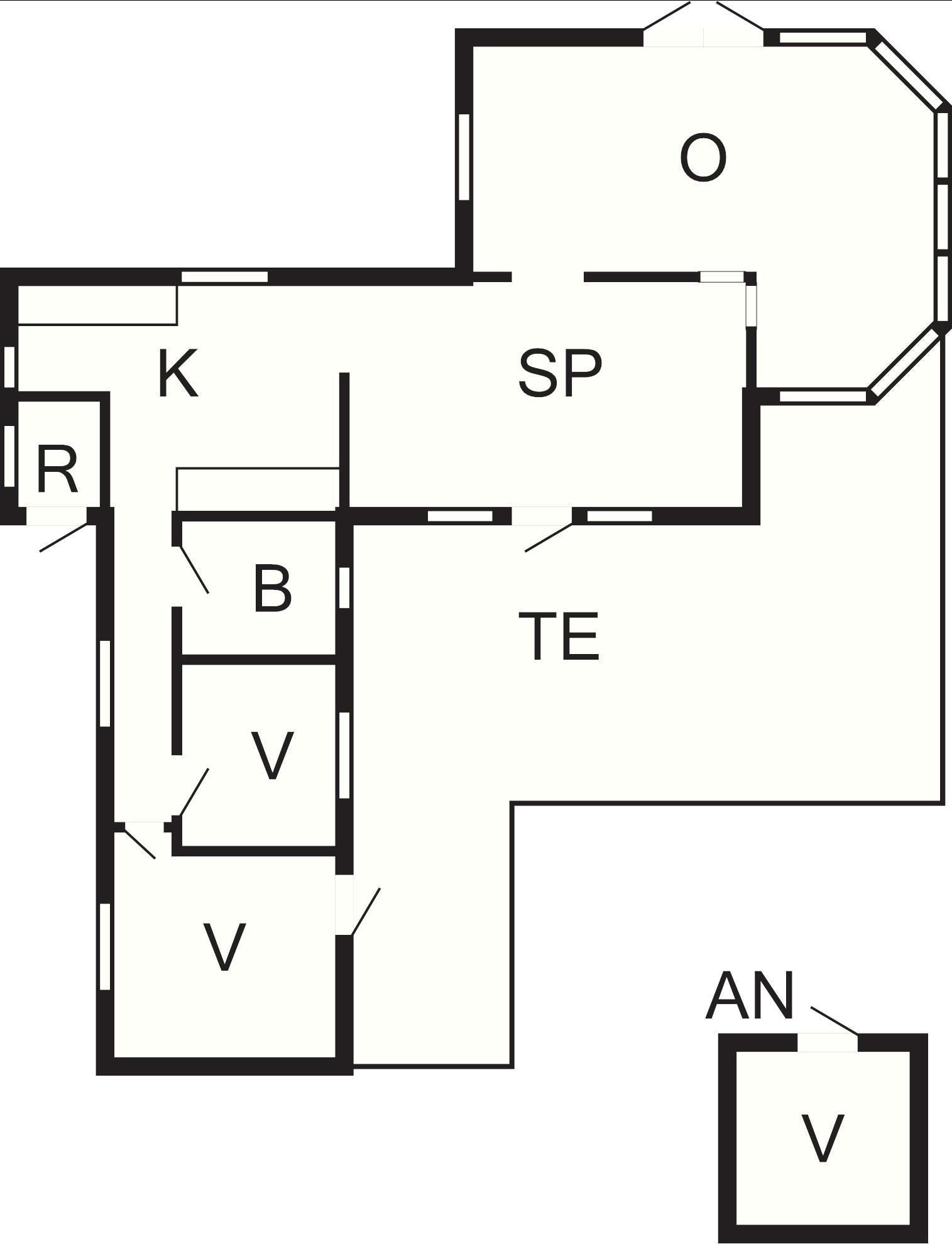 Hovedhuset har to soveværelser, hvoraf det ene har en privat udgang til det fri. For enden af ??gangen er køkkenet åbent til spiseplads og entré, hvilket skaber et lyst og indbydende rum. I tilknytning til køkkenet er en rummelig stue, perfekt til afslapning med familie eller venner.