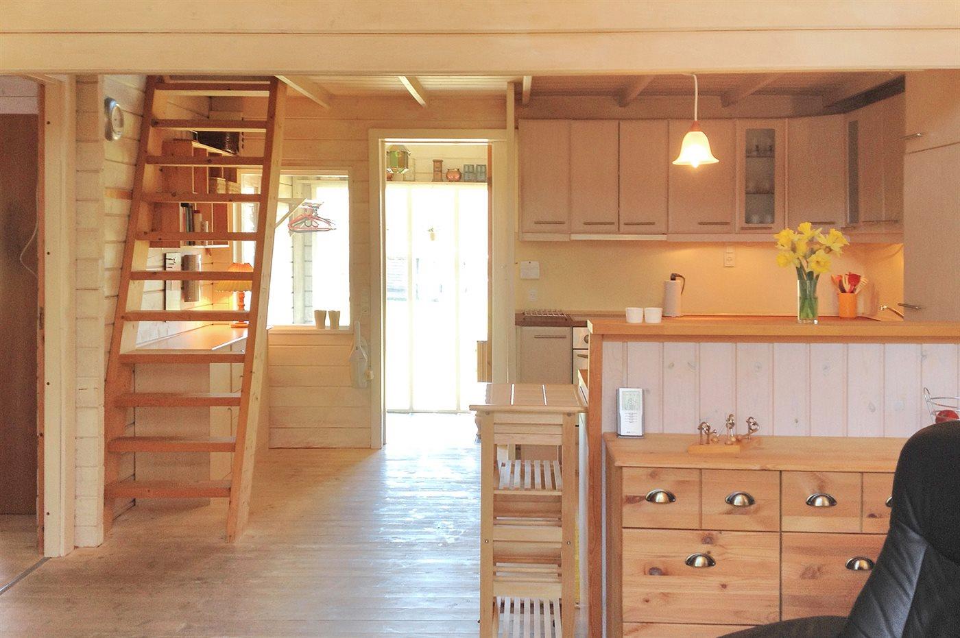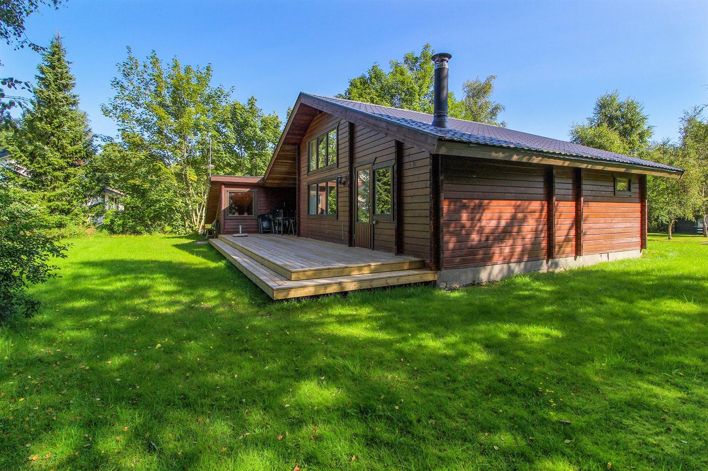 Lyst indrettet bjælkehus beliggende i et naturskønt og roligt område for enden af lukket vej. På husets rummelige hems findes 2 sovepladser i dobbeltseng.