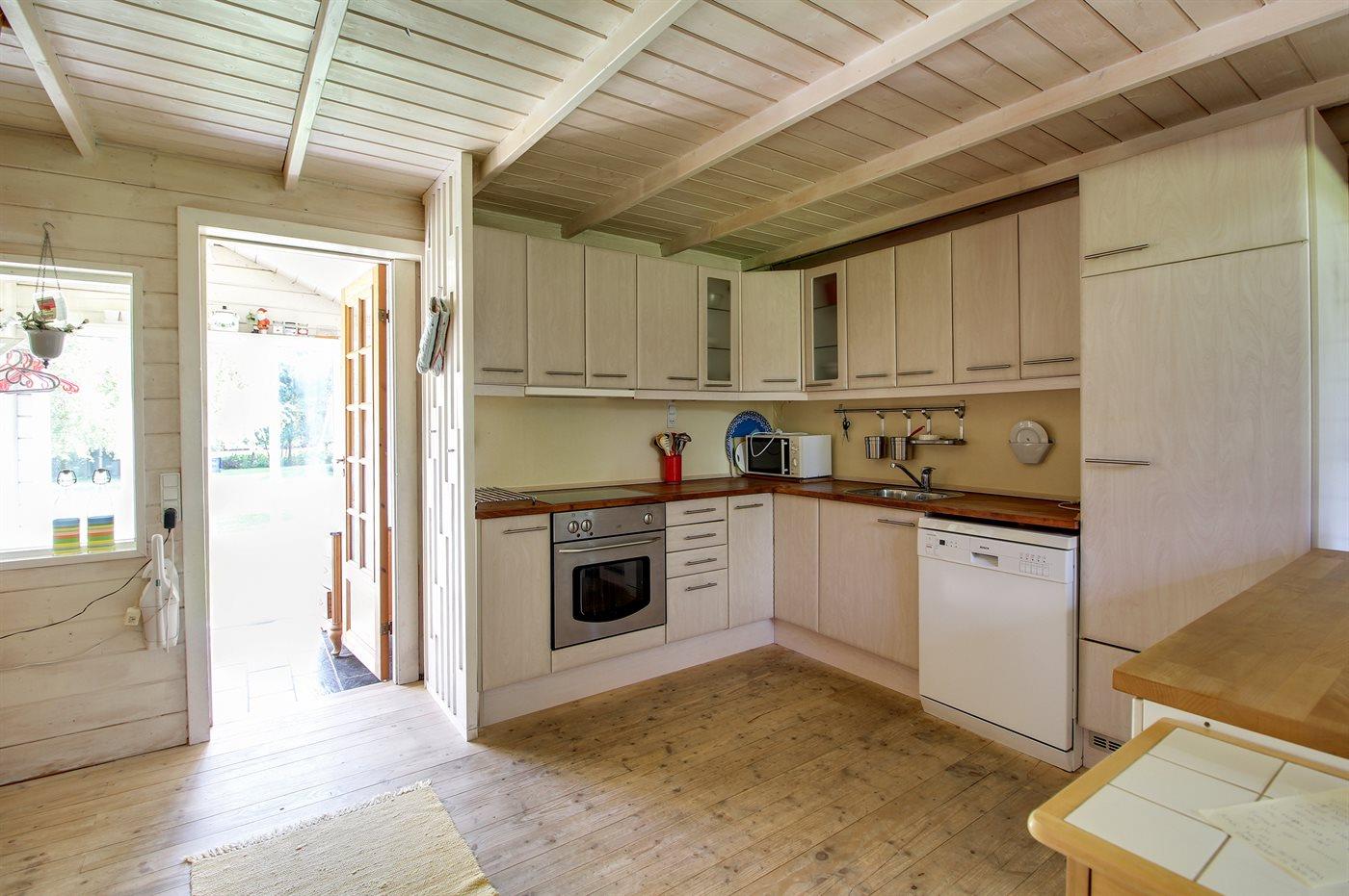 Køkkenet er udstyret med 1 køleskab. Der er 4 keramiske kogeplader, varmluftovn, mikrobølgeovn samt opvaskemaskine.