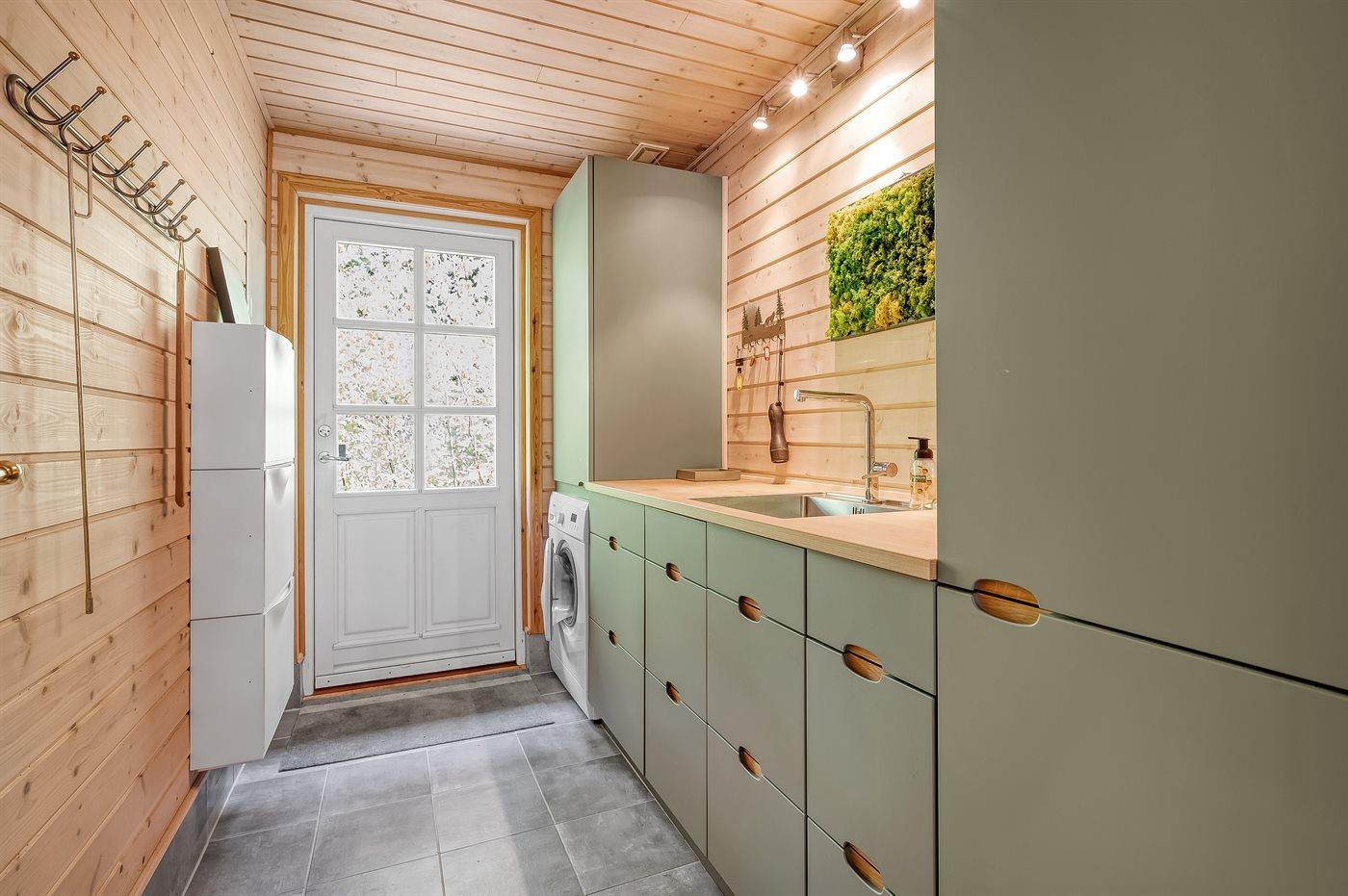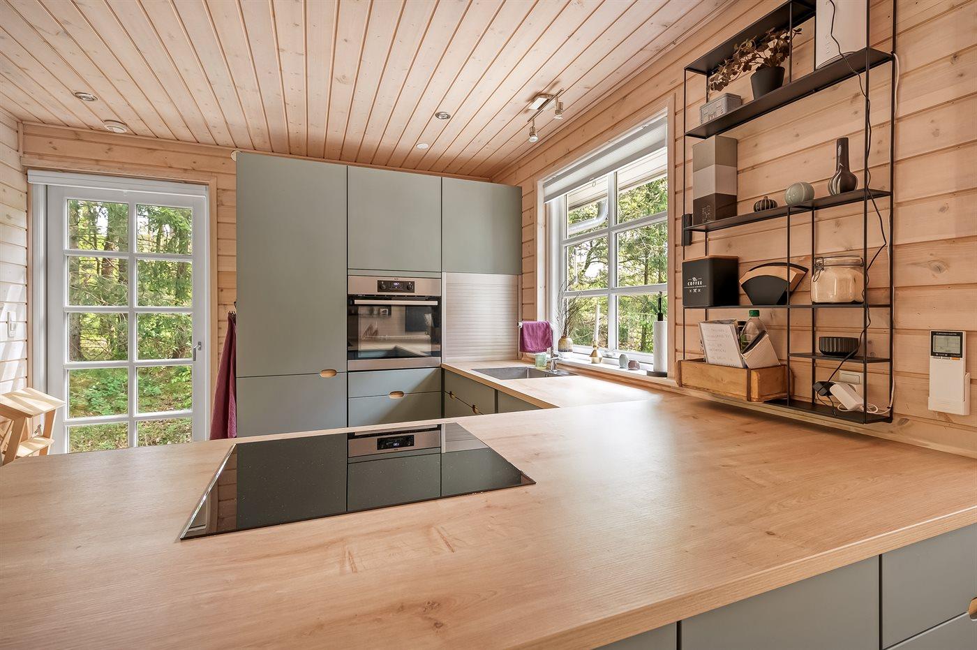 Køkkenet er udstyret med 1 køleskab. Der er 4 gasblus, varmluftovn samt opvaskemaskine.