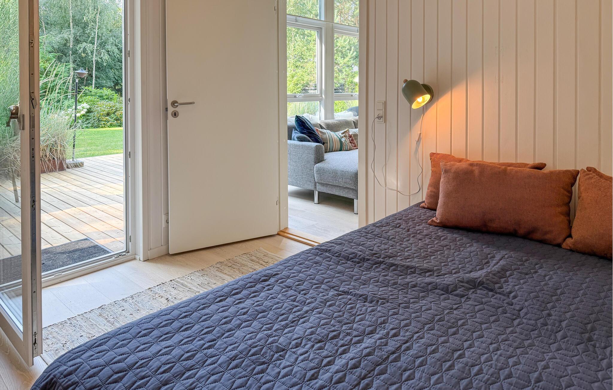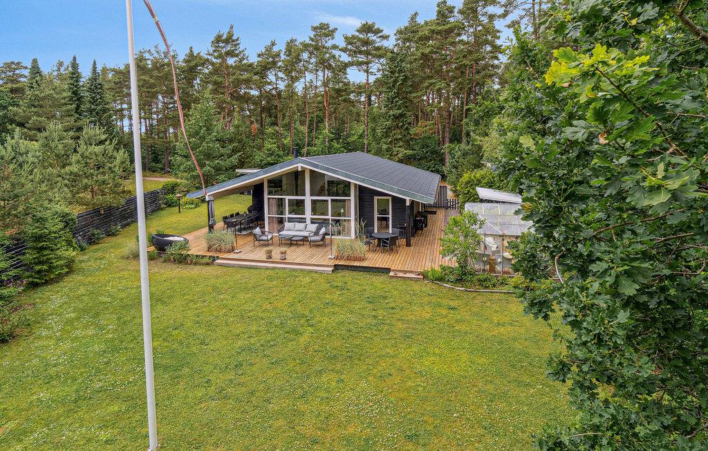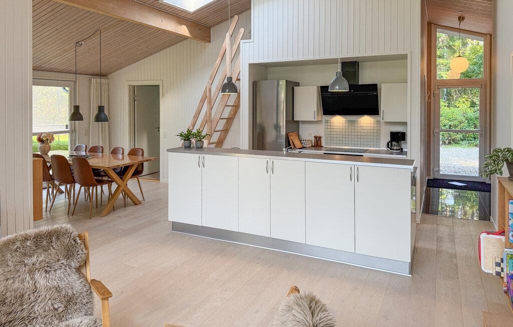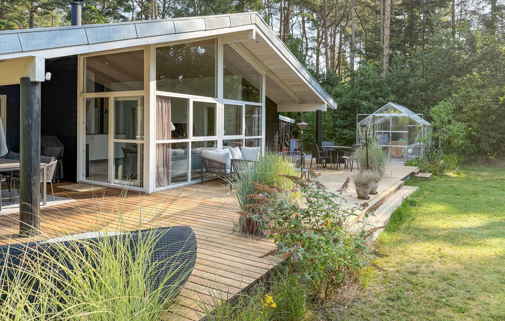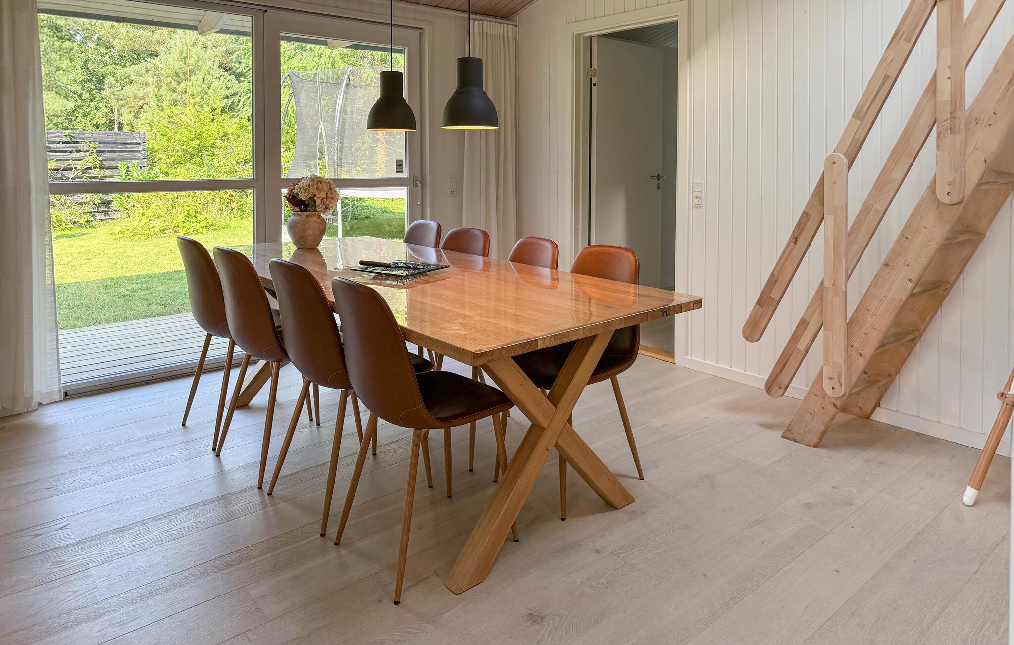 Omkranset af en fortryllende grund og tæt på mange spændende udflugtsmål kan I i dette komfortable feriehus lægge hverdagen langt bag jer. Store vinduespartier giver udsigt til det grønne og fylder den smagfuldt indrettede opholdsstue med masser af naturligt dagslys. Nyd hyggelige måltider ved det stemningsfuldt oplyste spisebord, hold hyggelige spilleaftener, eller lyt til brændeovnens stille knitren under afslappede læsestunder på sofaen.