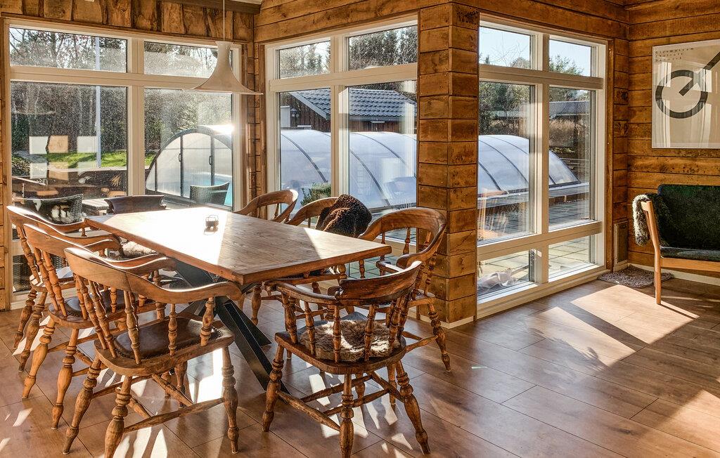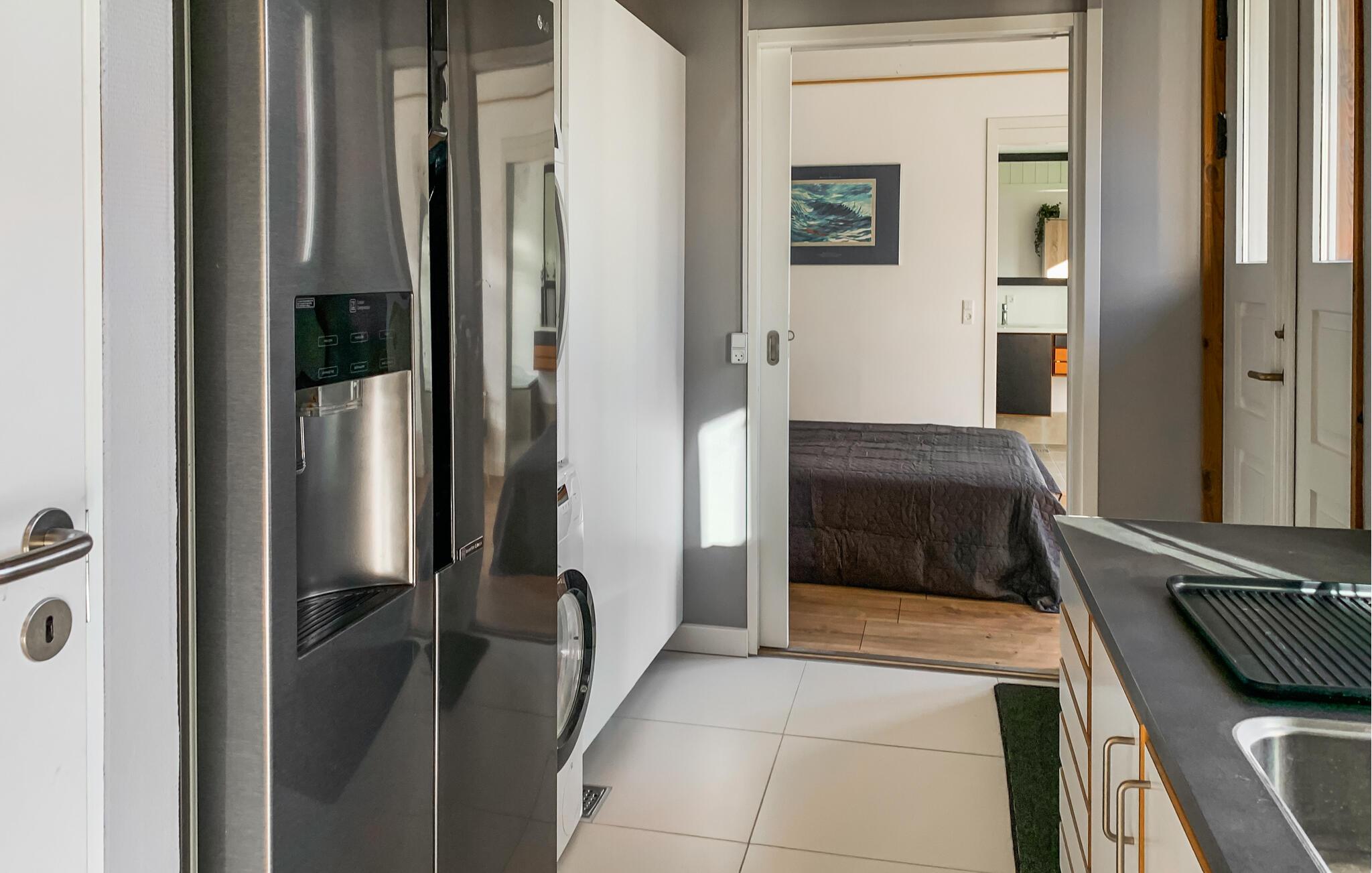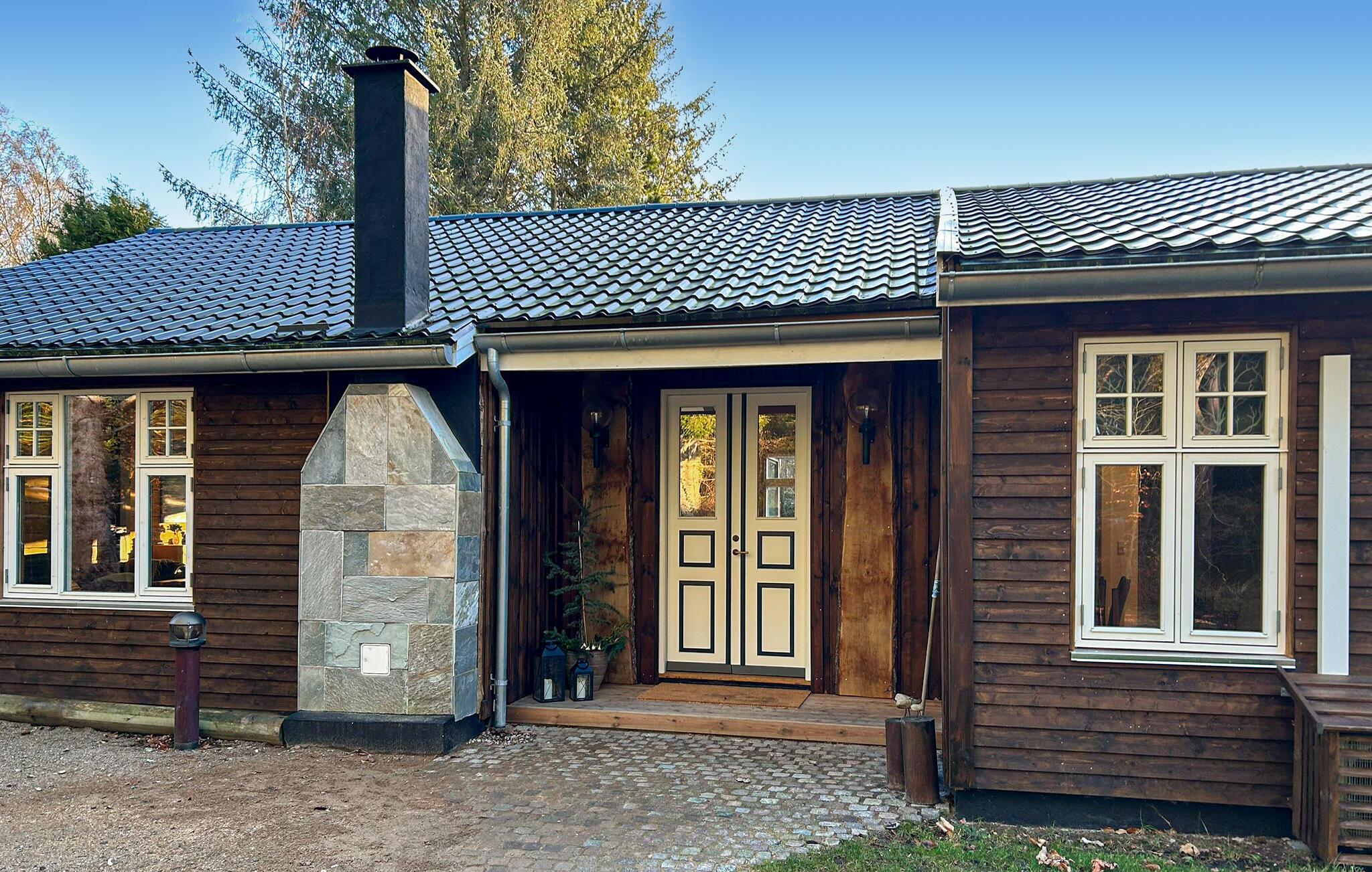 I jeres rummelige feriehus mødes rustik landstil og moderne komfort. Glæd jer til hyggelige aftener i det åbne køkken-alrum, hvor I kan lave mad sammen og nyde jeres måltider ved det store træbord. Slap af med et glas vin i de komfortable sofaer foran den knitrende pejs, eller se jeres yndlingsserie på den store Smart-TV.
