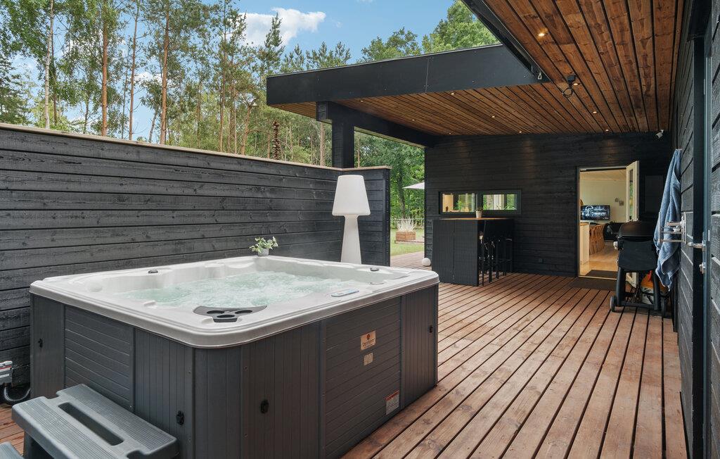 Glæd jer til en ferie i dette indbydende og rummelige feriehus med udendørs wellness.