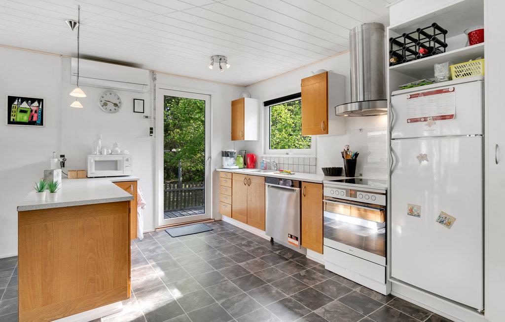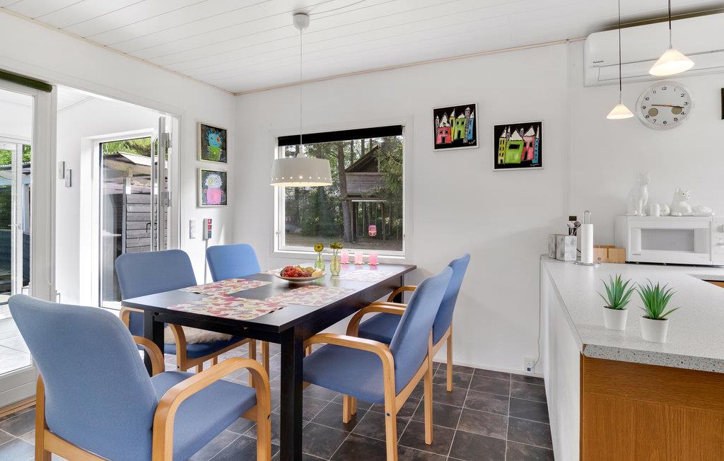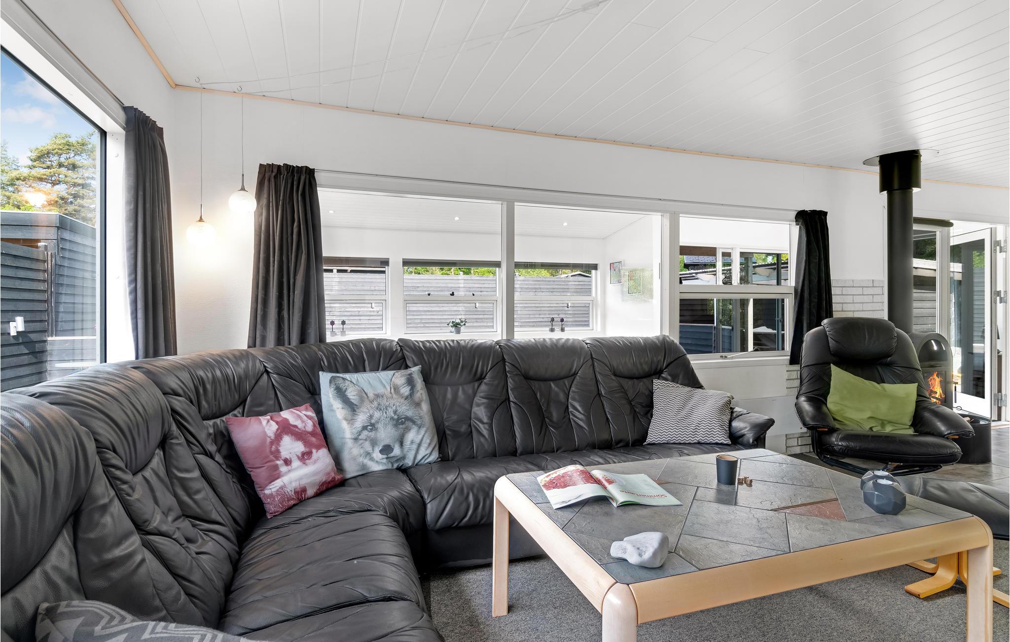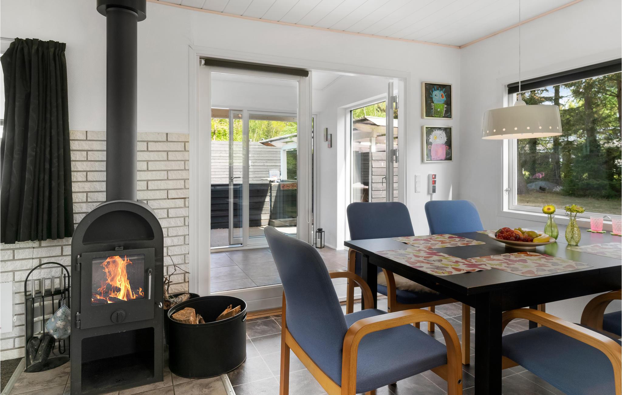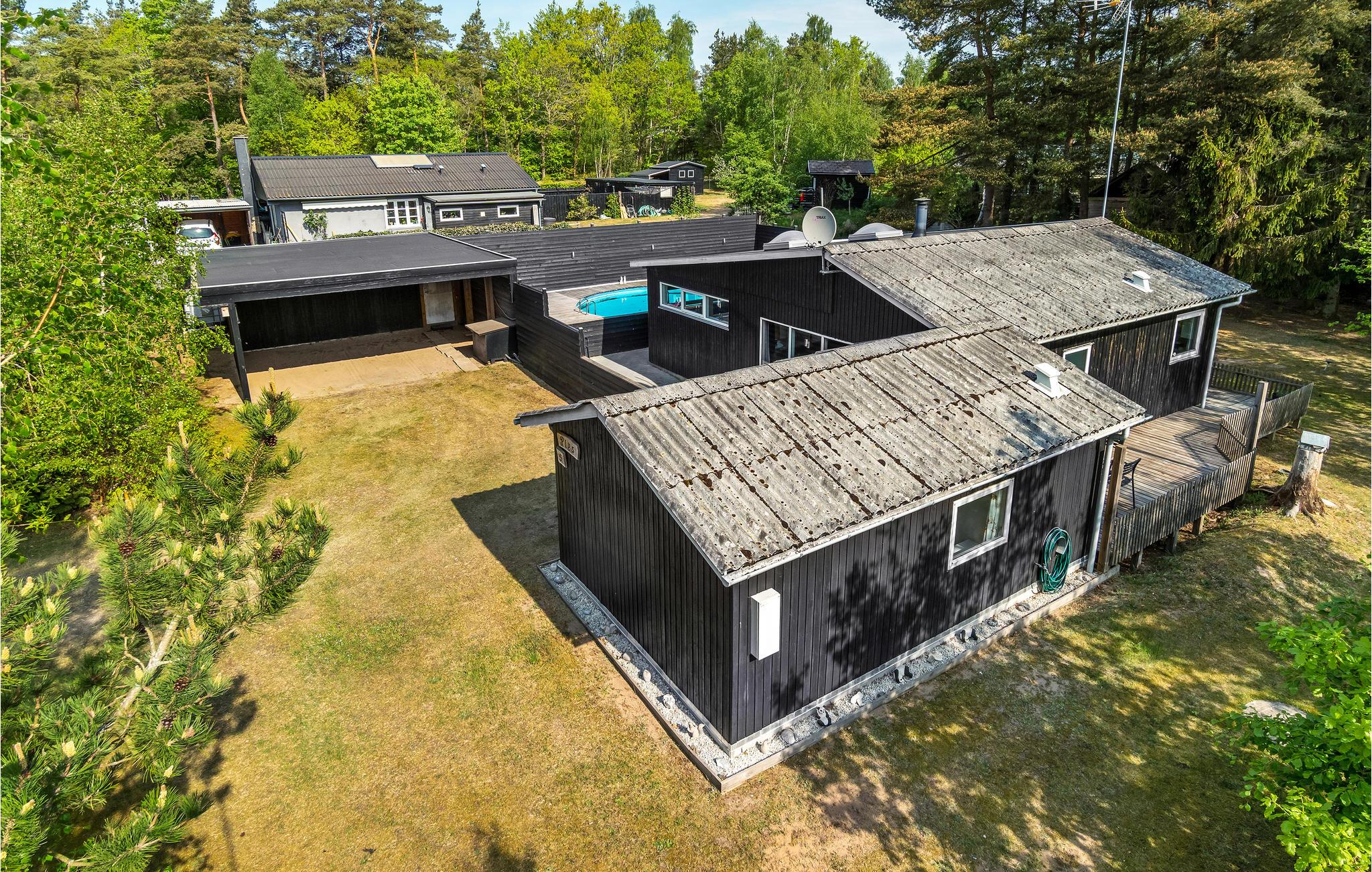 I et dejligt og roligt naturområde er dette feriehus beliggende på en stille, blind vej. Den tætte beplantning omkring huset giver dejlig læ. Huset er indrettet med tre mindre soverum og et åbent køkken-/stueområde med brændeovn, som I kan sidde og hygge jer foran om aftenen. Fra stuen er der udgang til udestuen og videre ud til den 80 m2 store lukkede og ugeneret træterrasse, hvorfra I kan betragte aktiviteterne i poolen. I haven er der også en stor hytte bygget i 3 meters højde med en klatrevæg til børn. Besøg det hyggelige Ebeltoft og gå en tur i de smalle, brostensbelagte gader og tag evt. et stop på en af de mange caféer. TVèt i udestuen er ikke tilslutte antenne, men her kan der streames TV via chromecast.