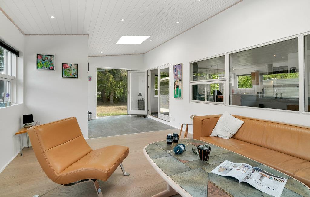 Hyggeligt feriehus i roligt naturområde nær Ebeltoft med udestue, stor terrasse og privat pool.