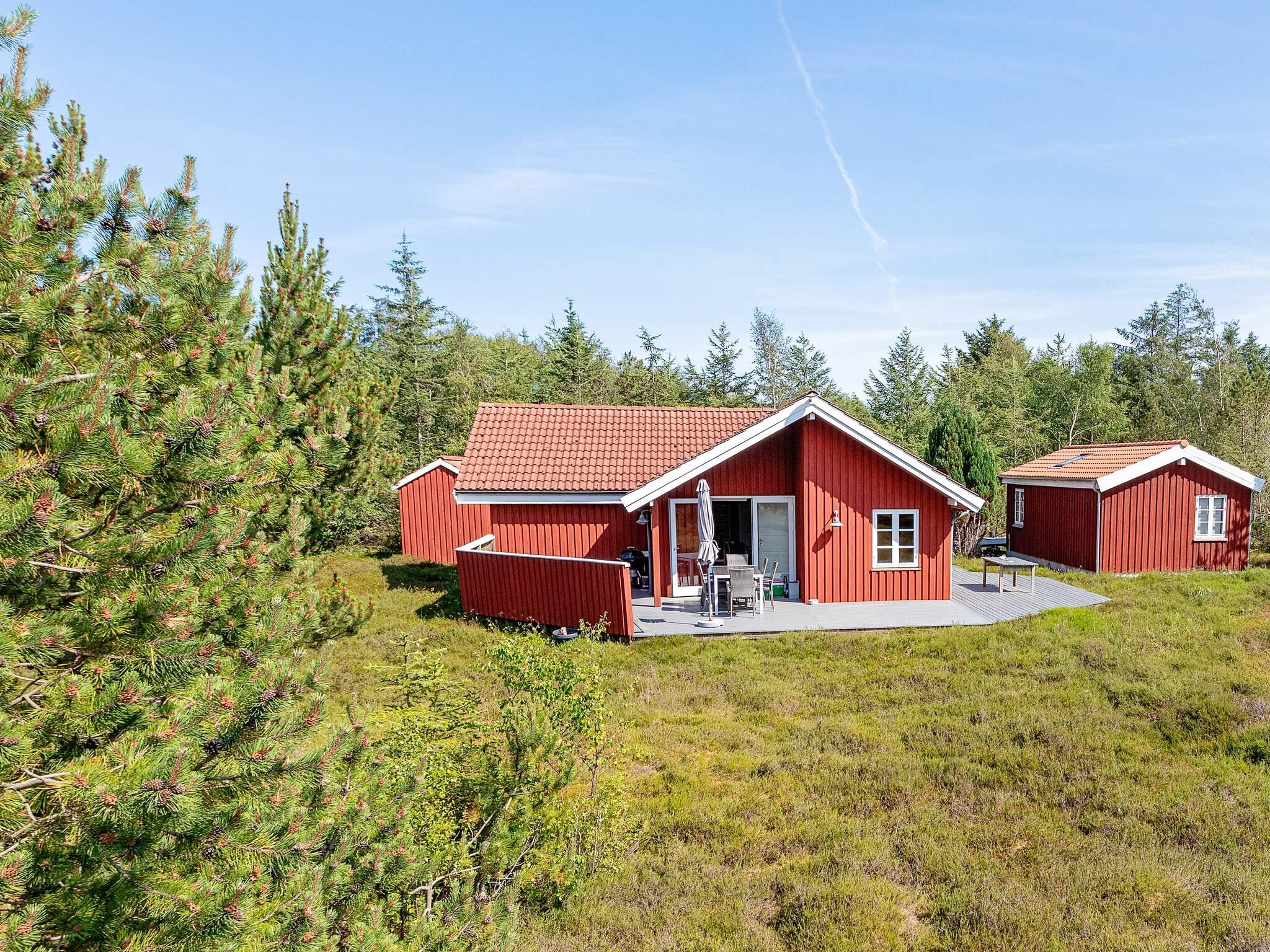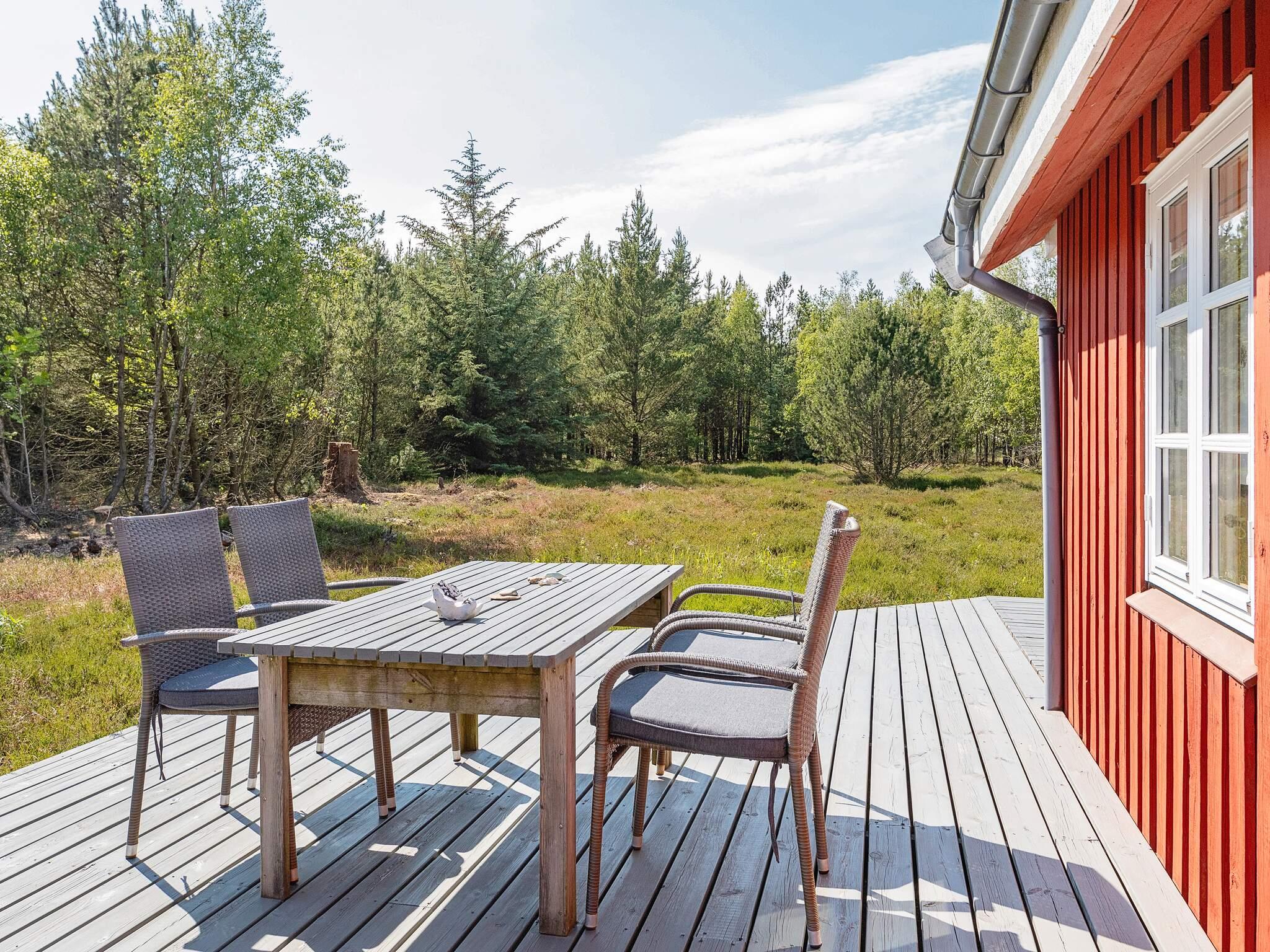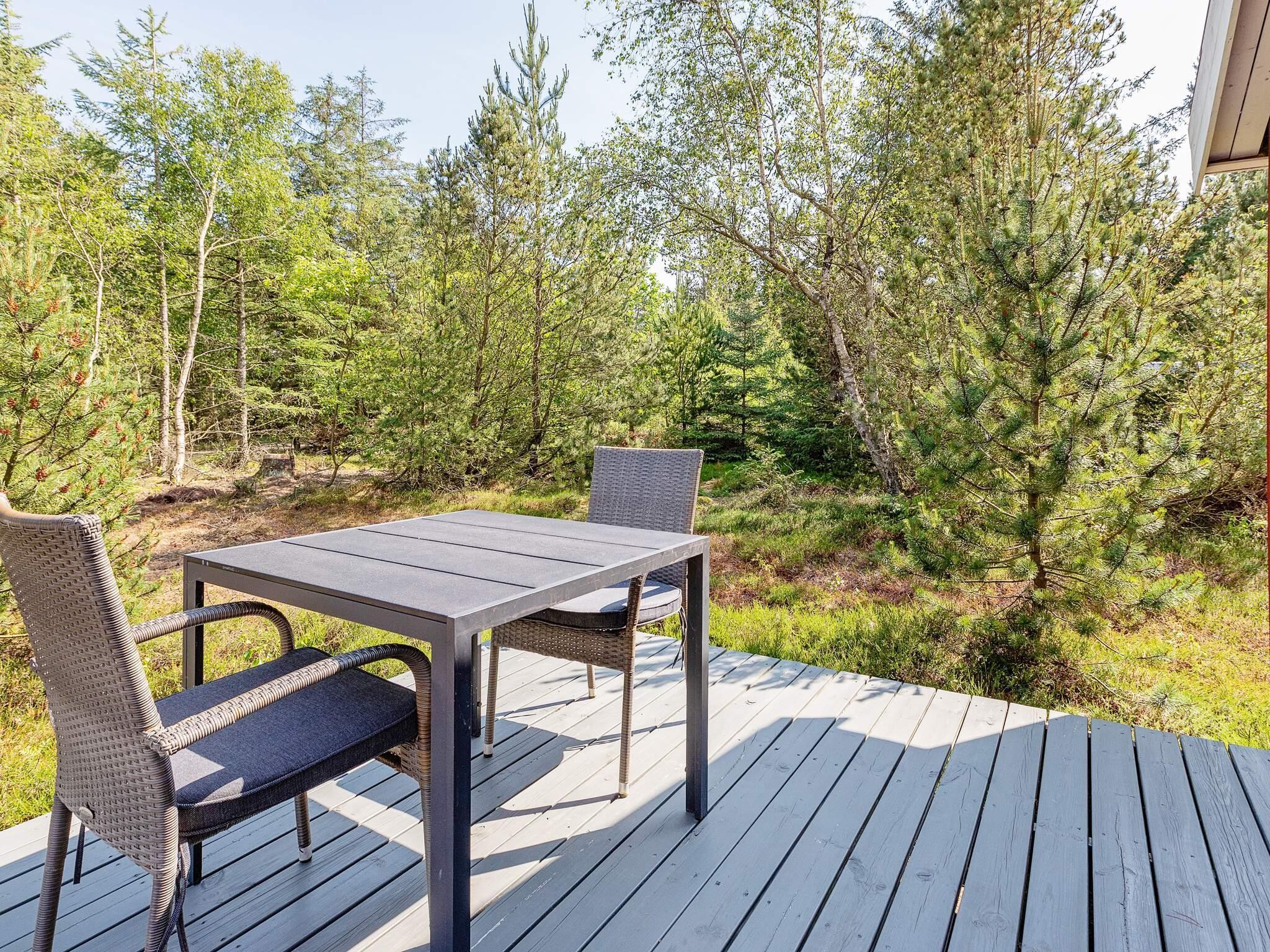 Huset har flere terrasser, herunder en stor 110 m² terrasse langs syd- og vestsiden, en østlig terrasse og en på forsiden. Fra alle terrasser kan du nyde udsigten over den omkringliggende hede og høje træer. Indvendigt er stue og køkken moderne indrettet med keramisk komfur, emhætte, mikroovn, køle/fryseskab og opvaskemaskine. Opholdsstuen indeholder spiseplads, komfortable siddepladser, brændeovn, smart-tv med gratis danske kanaler, tyske kanaler via mobilstreaming, stereoanlæg med cd-afspiller og gratis wi-fi.