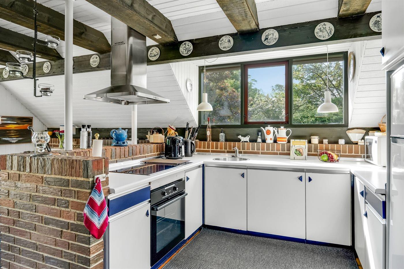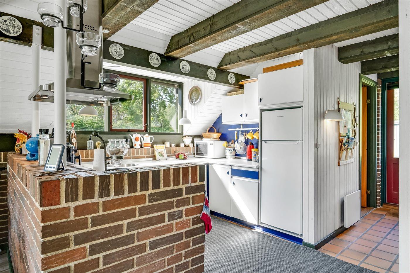 Køkkenet er udstyret med 1 køleskab. Der er 4 elkogeplader, bageovn, mikrobølgeovn.