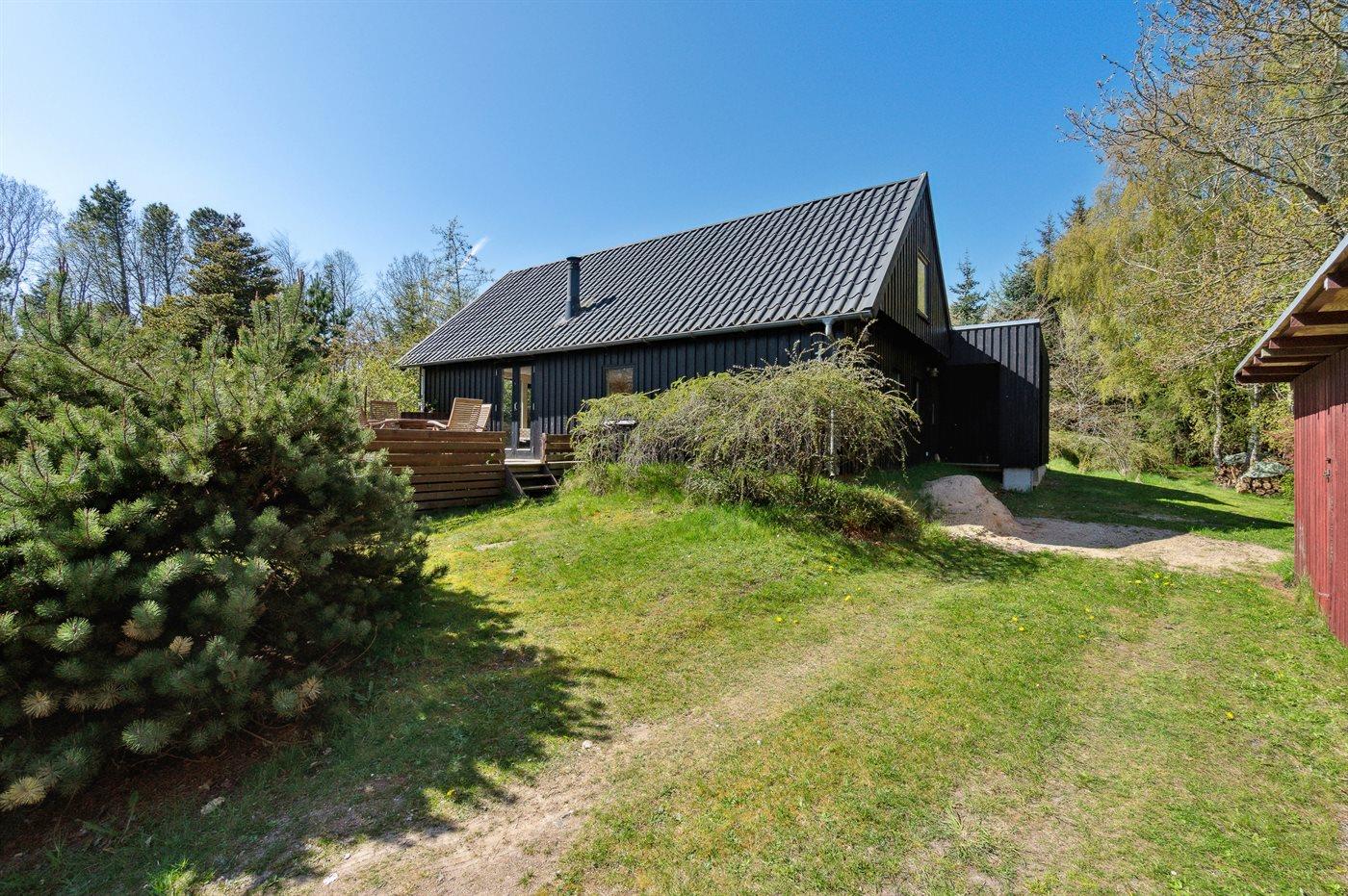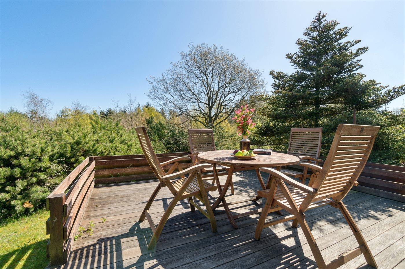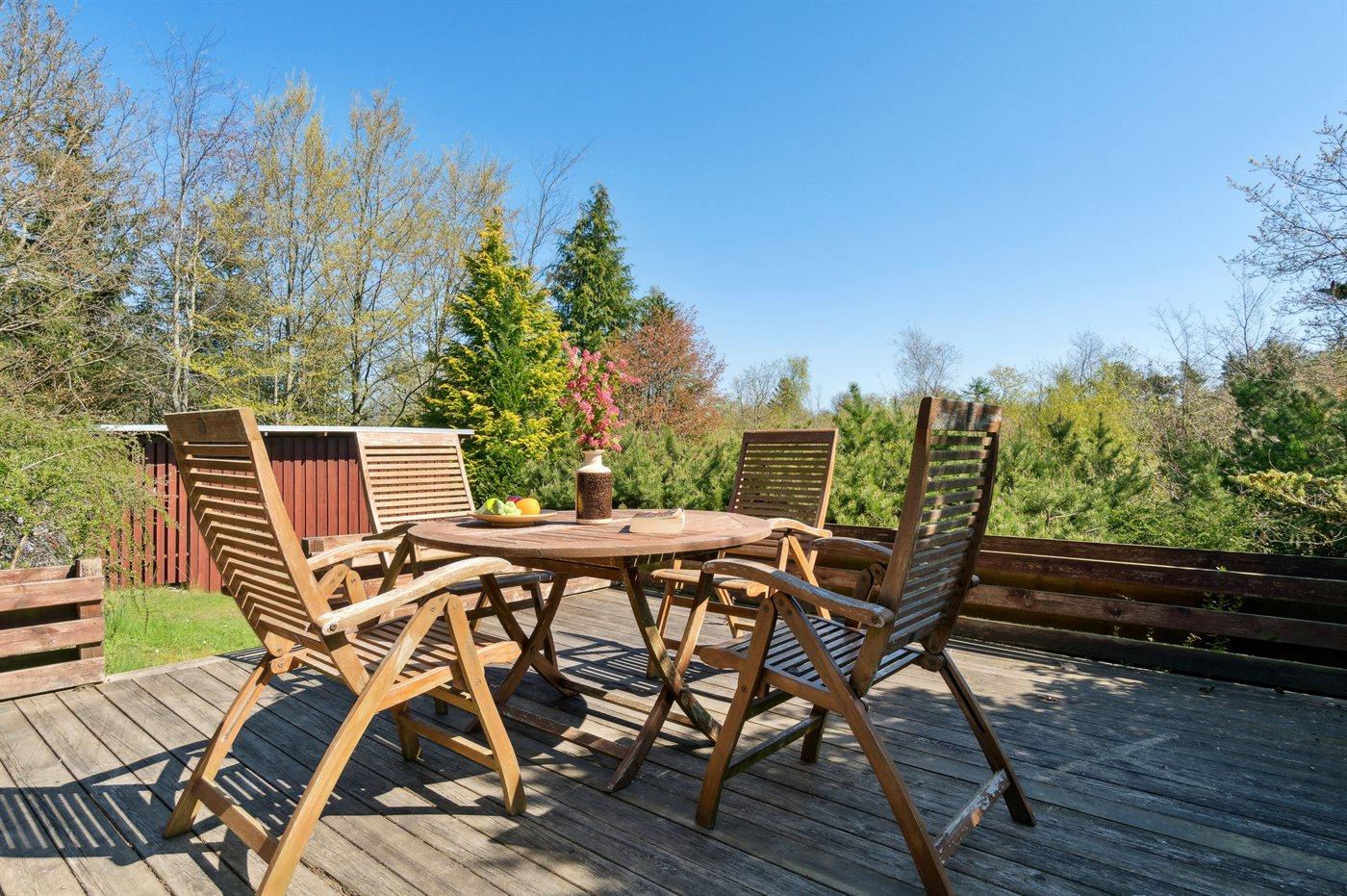 Huset ligger på en særdeles dejlig grund og der findes flere terrasser, så der er gode muligheder for at nyde masser af timer i det fri med en god bog, en kryds og tværs elleret lækkert måltid.