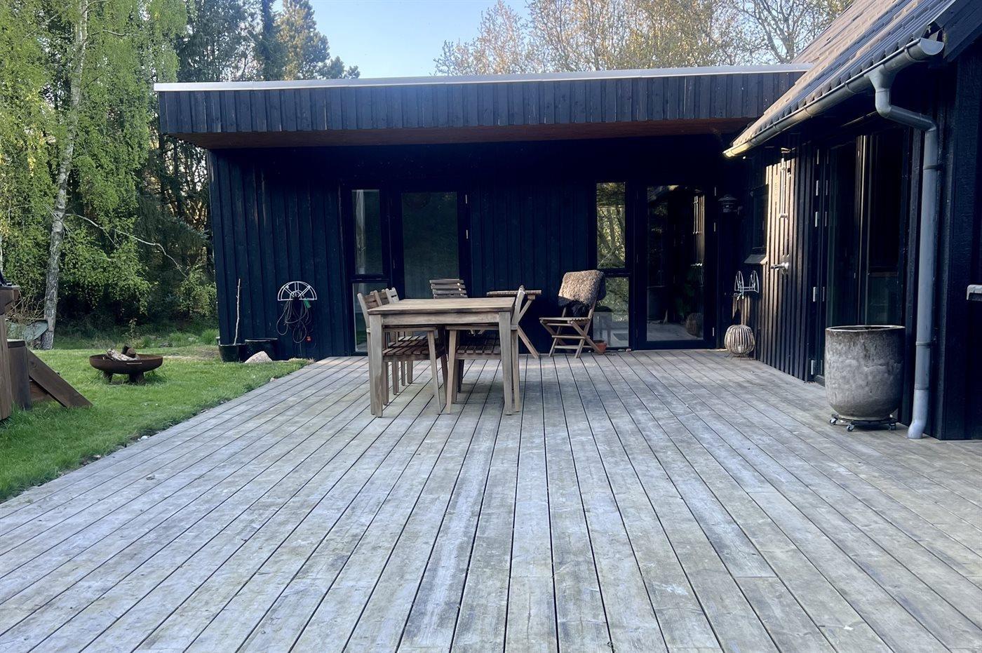 Flot renoveret sommerhus tæt på vandet med vildmarksbad og flere terrasser til afslapning.