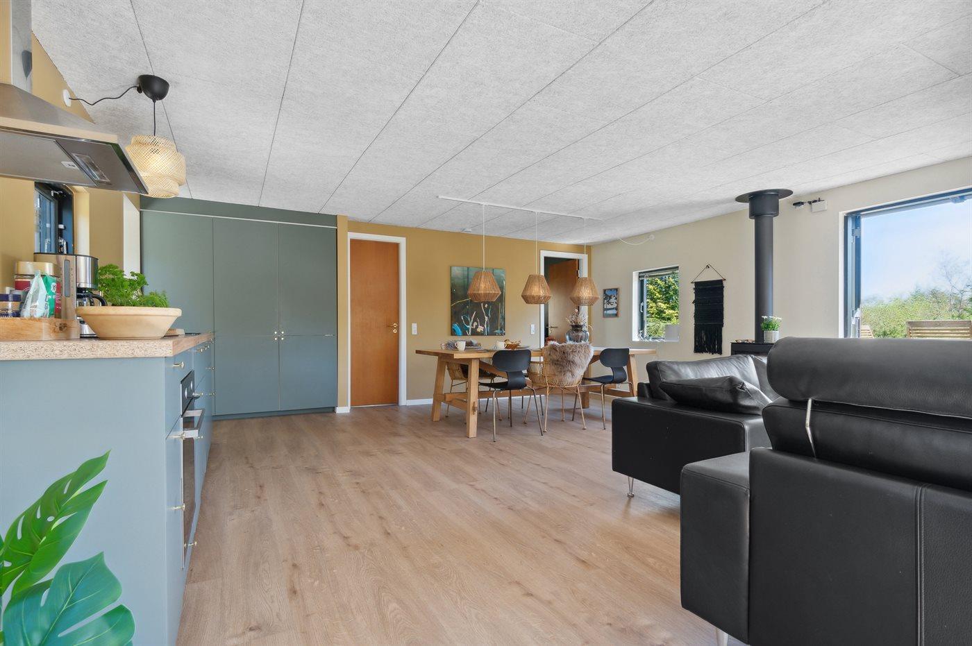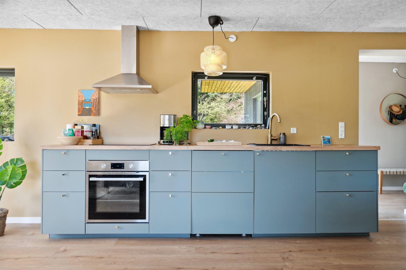 Køkkenet er udstyret med 1 køleskab. Der er 4 induktionskogeplader, varmluftovn samt opvaskemaskine.