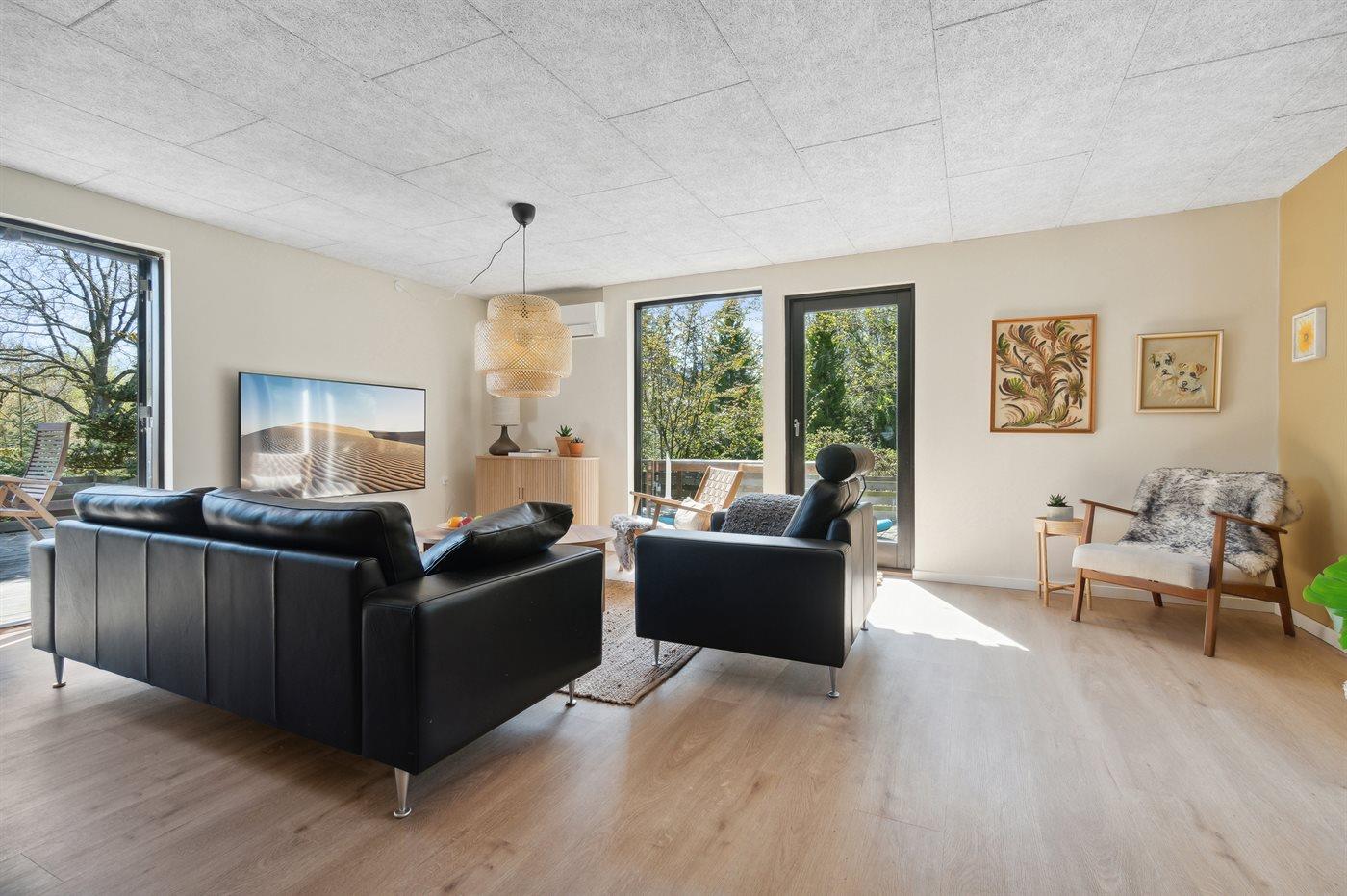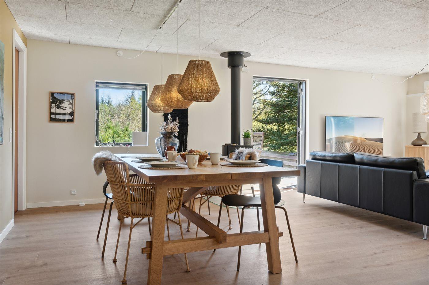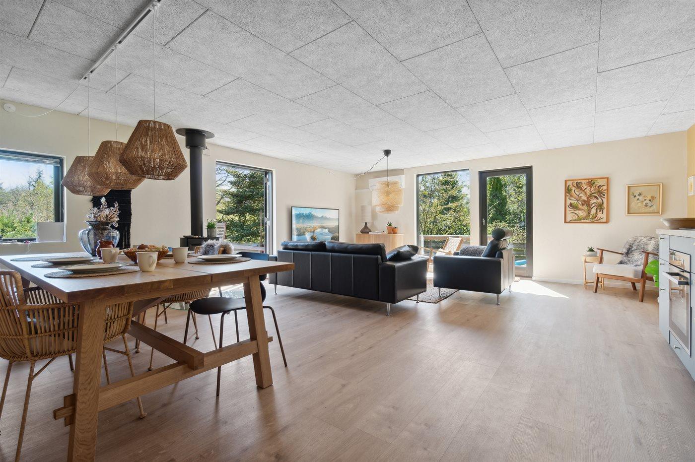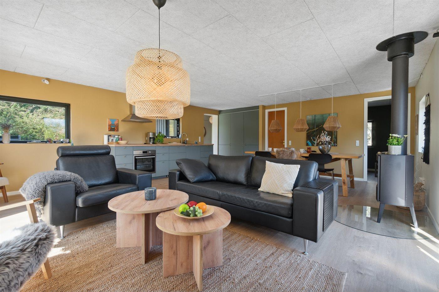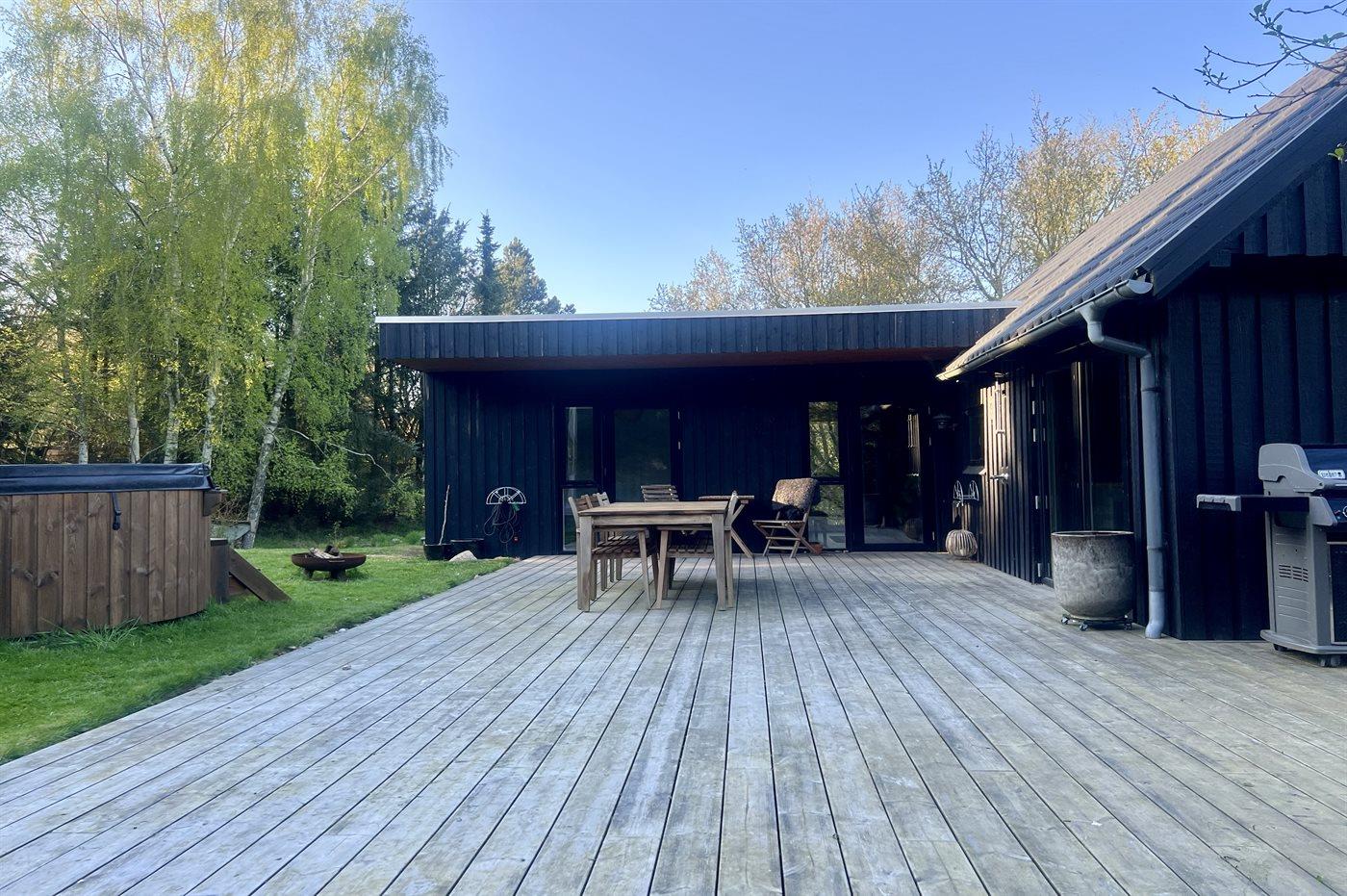 Flot renoveret sommerhus fra 2022 tæt på fjorden med vildmarksbad og store terrasser til udeliv.