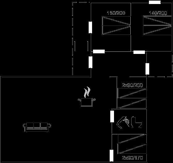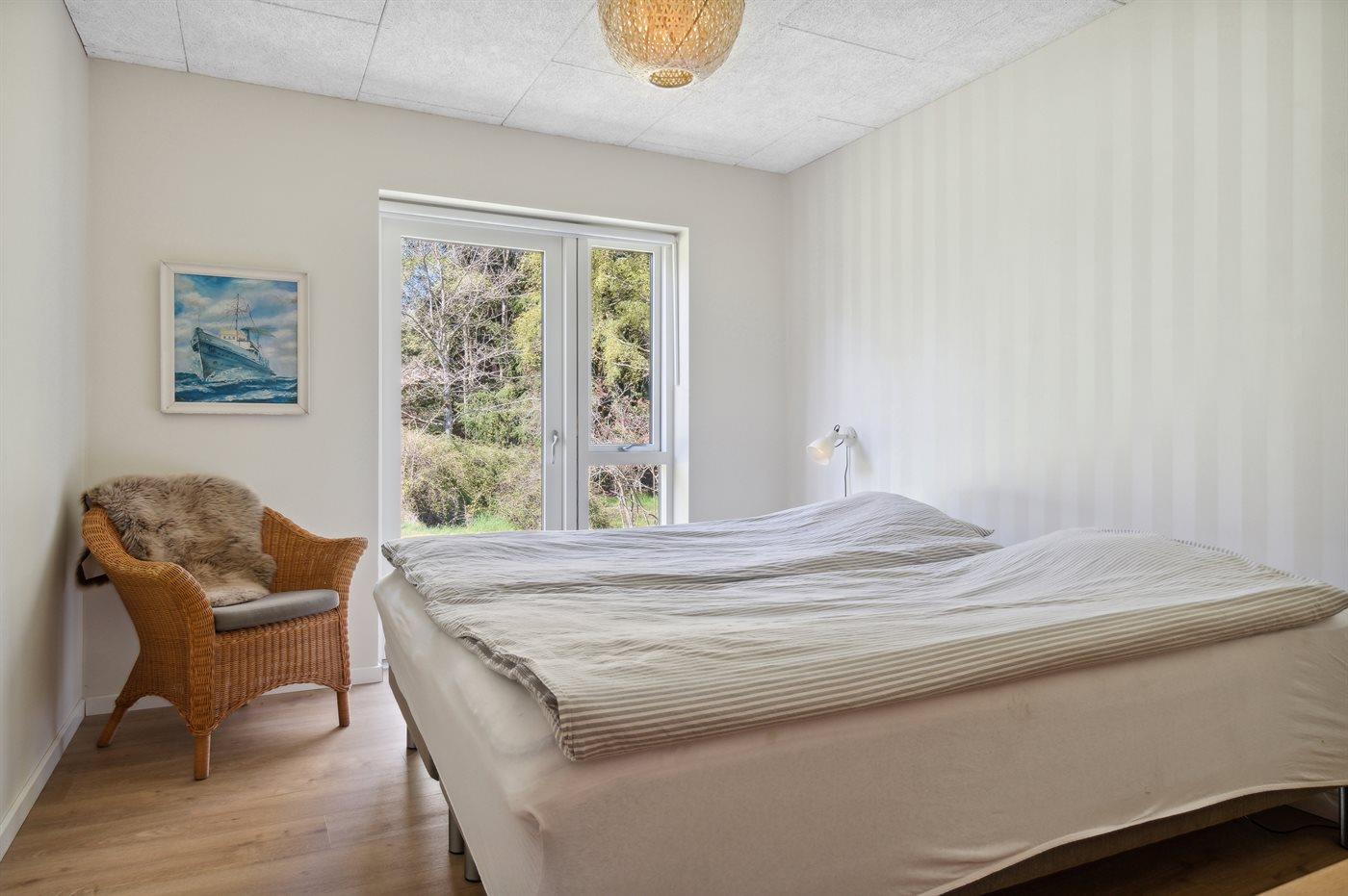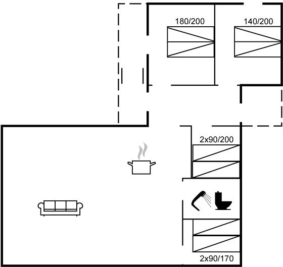 Der er i alt 3 soveværelser. Sovepladserne fordeler sig på: 4 sovepladser i dobbeltsenge. 2 sovepladser i enkeltsenge. 2 sovepladser i alkove. 2 af disse sovepladser befinder sig i gangen.