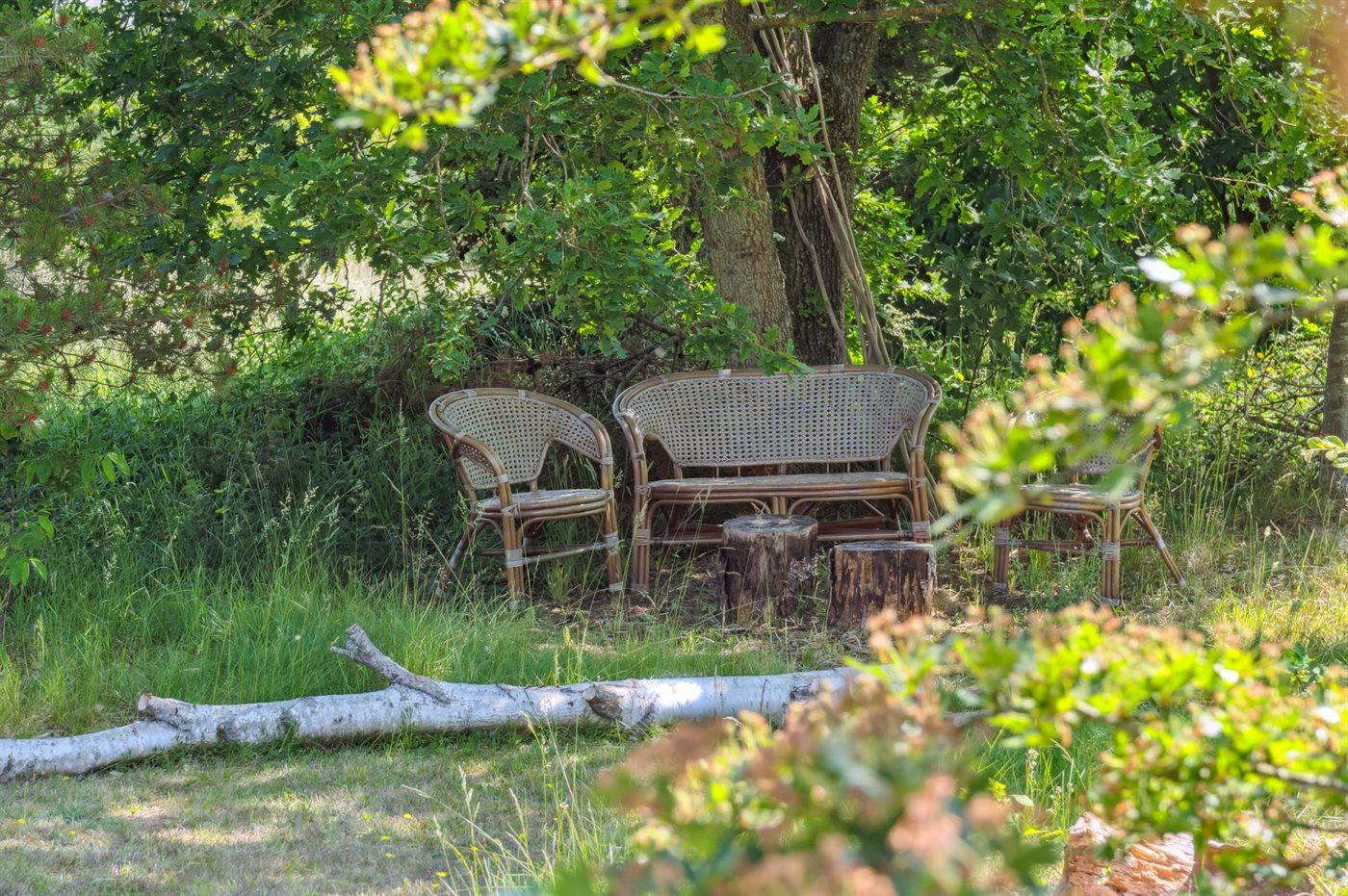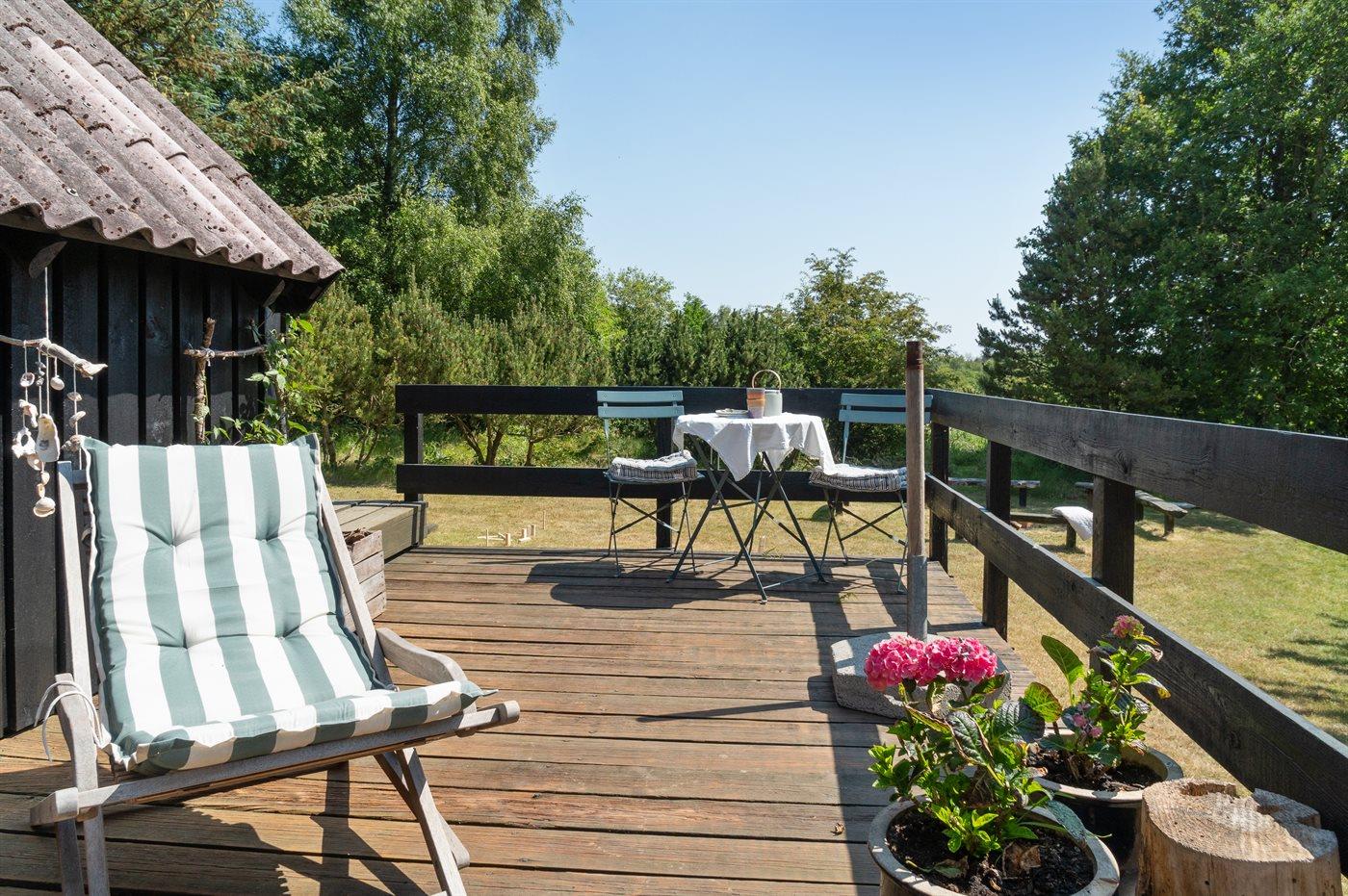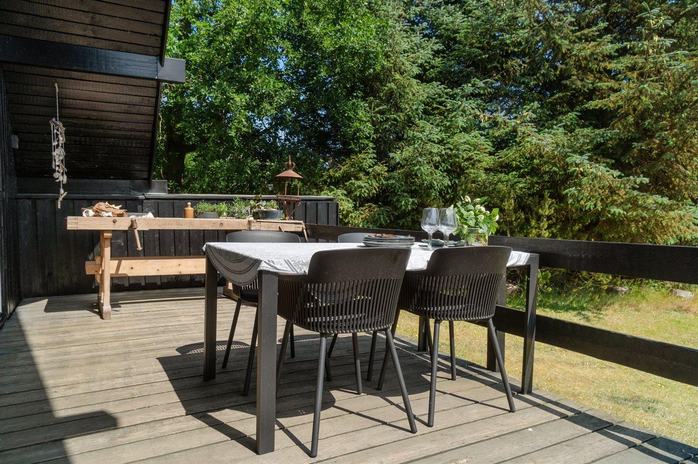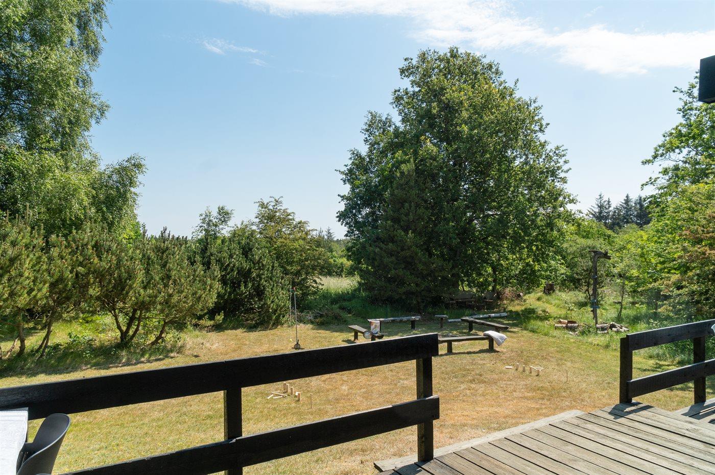 Ferieboligen er beliggende på en 2850 m² stor naturgrund. Der er 300 m til fjorden. Nærmeste forretning er beliggende i en afstand af 4000 m. Der er en golfbane i en afstand af 18000 m. Til ferieboligen hører åbent terrasseareal. Desuden er der overdækket terrasse. Udgang til altan. Der ligger en legeplads i en afstand af 4000 m. Bålsted. Weber gasgrill til rådighed. Parkering ved ferieboligen.