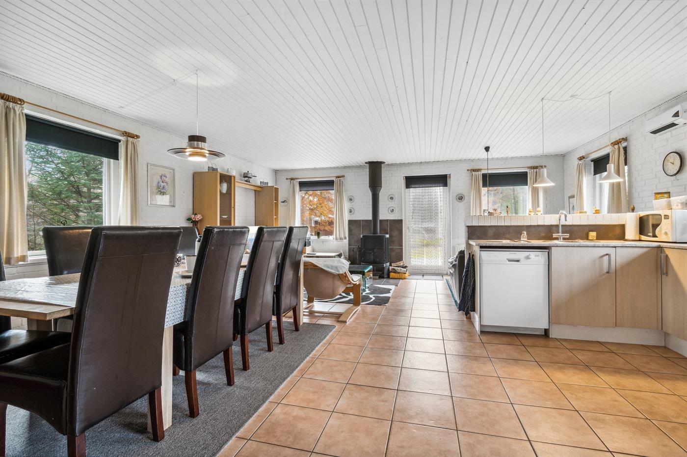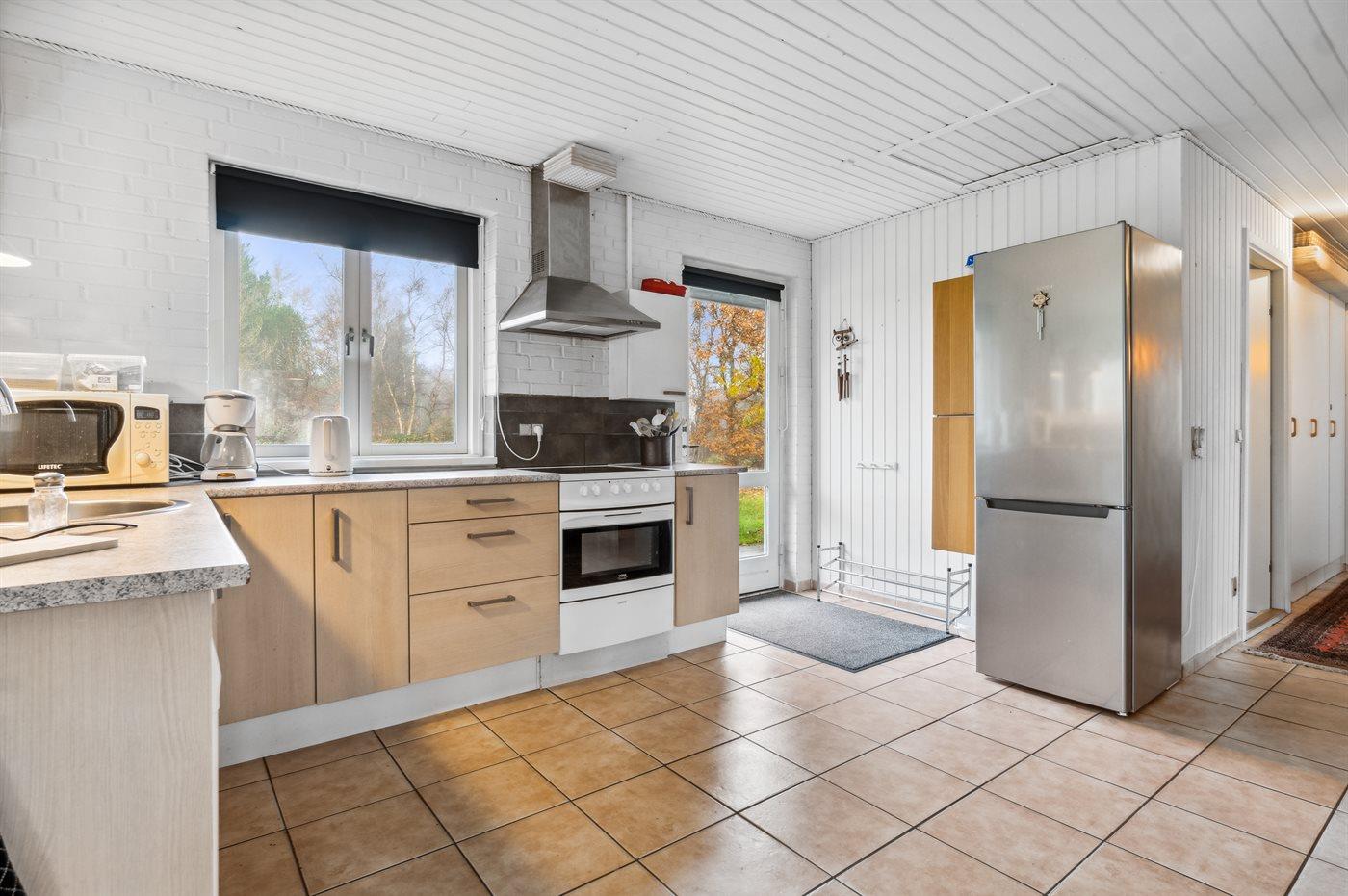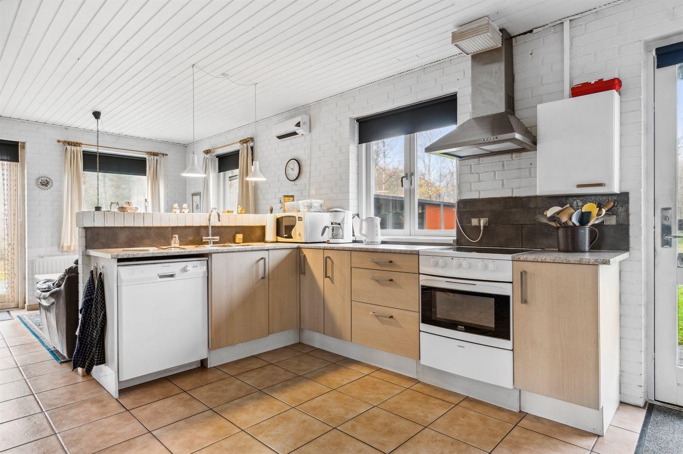 Køkkenet er udstyret med 1 køleskab. Der er 4 keramiske kogeplader, varmluftovn, mikrobølgeovn samt opvaskemaskine.
