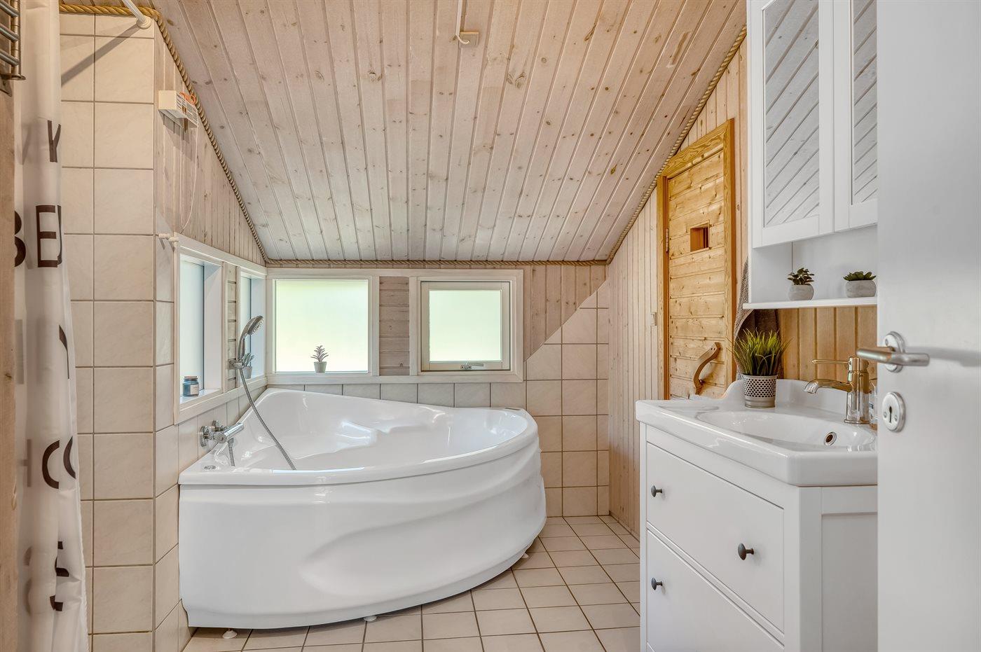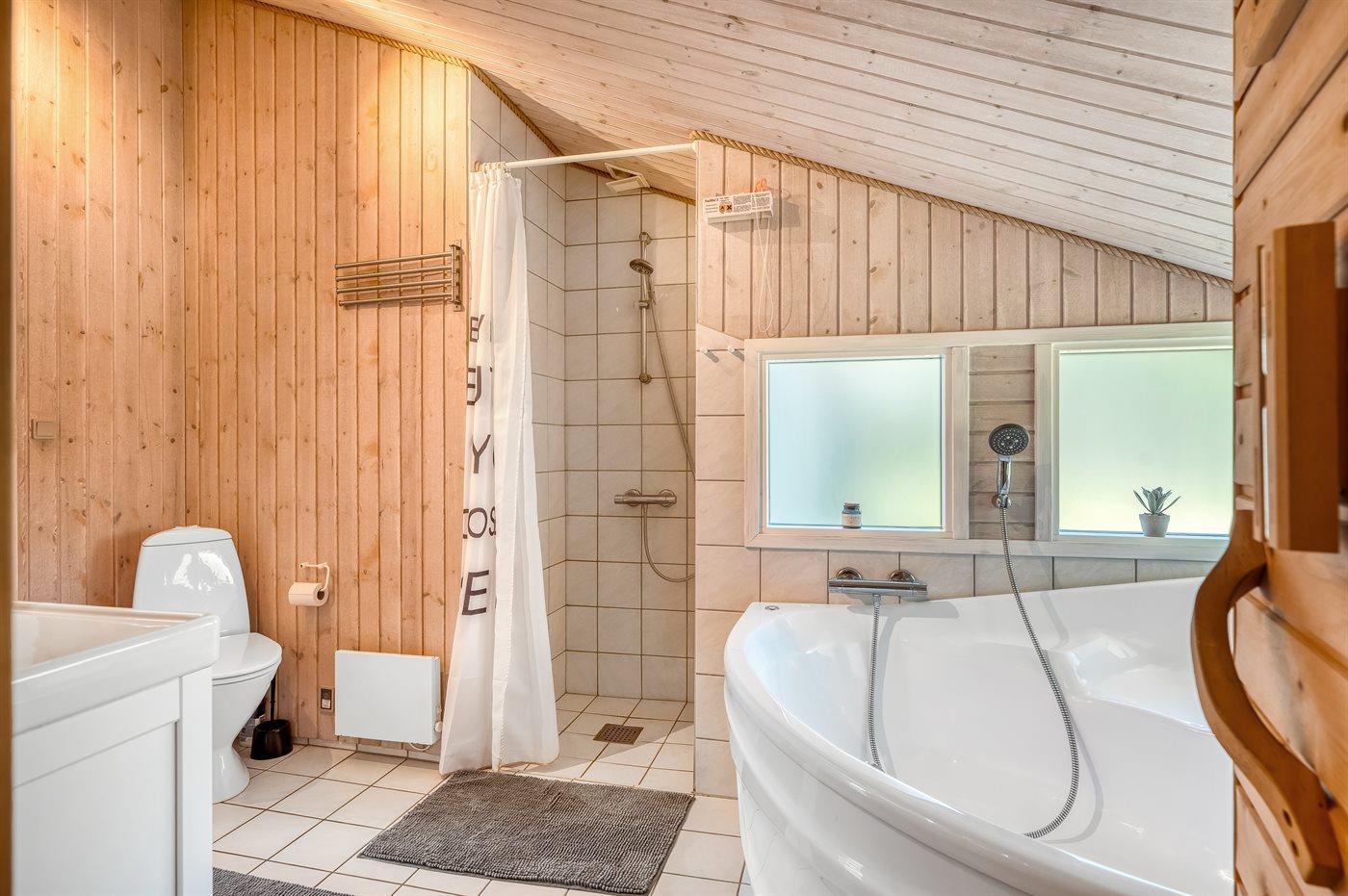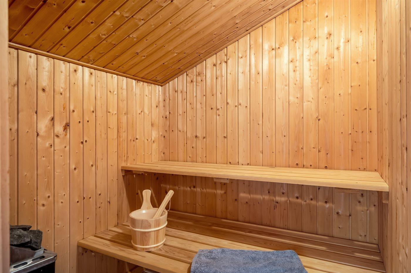 Der er 2 badeværelser med bruser og 2 toiletter. Der er gulvvarme på 2 badeværelser. I saunaen er der mulighed for afslapning.