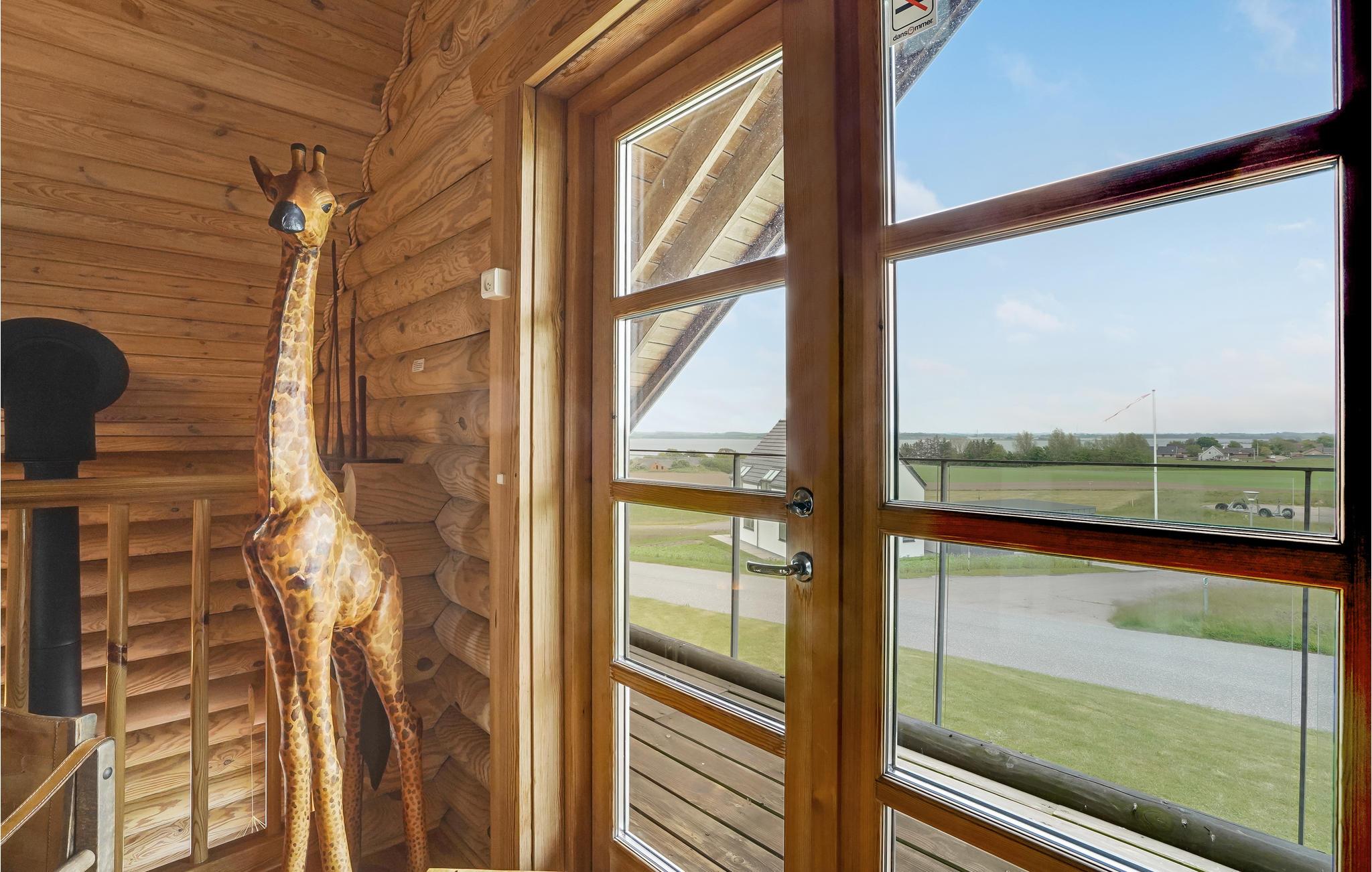 Flot finsk bjælkehus på Fur med panoramaudsigt over fjorden, terrasse og autentisk indretning med afrikanske detaljer.
