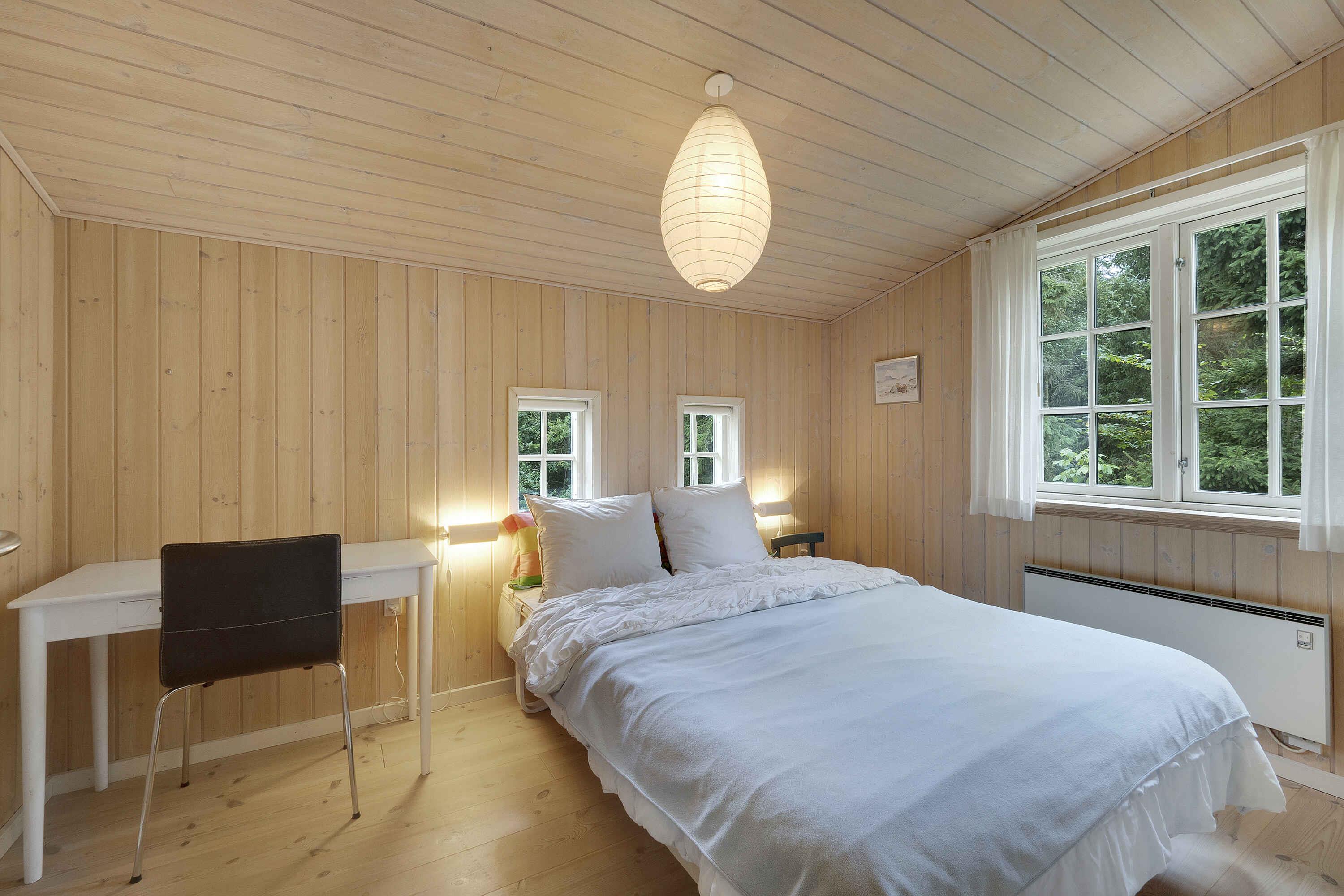 Sommerhuset er naturskønt beliggende på en 5000m2 naturgrund, kun 200 meter fra vandet. Huset er indrettet med et kombineret opholds- og spiserum med veludstyret køkken. Fra spisebordet er der udsigt til vandet, og der er plads til hygge for hele familien i sofagruppen, der er indrettet med flere sofaer, lænestole, små borde og læselamper. I opholdsrummet er der smart-tv, radio samt CD-afspiller. Der forefindes chrome dongle og HDMI-stik for tilslutning til TV'et. Huset har gratis fibernet, som kan anvendes trådløst eller kablet. Der er to soveværelser med 3/4 seng og et værelse med to enkeltsenge. Alle værelser har god skabsplads. Herudover findes der to springmadrasser, som kan lægges på gulvet efter behov. Det ene soveværelse har direkte adgang til et baderum med bruser, håndvask og toilet. Det andet baderum har bruser, spa og adgang til sauna samt toilet i et lille separat rum. Derudover er der kurvemøbler til afslapning efter badet. Indgangspartiet er en vestvendt overdækket terrasse i direkte forbindelse med køkkenet og et oplagt sted for en snack inden aftensmåltidet. Man kan gå på opdagelse i den lille skov i grundens nordlige ende, eller man kan nyde det dramatiske landskab samt solnedgangen over Limfjorden og Mors fra egen bænk. Flere steder på grunden findes enestående udsigter over vandet og kysten. Da huset ligger i Bakkerne og direkte ud til nordkysten af Fur, er man straks i forbindelse med mange af Furs flotte vandreruter, så snart man træder ud af døren. Flere strande er også indenfor gåafstand. Den nærmeste ligger 700 m ned af Emmelstenvej, der er en tyndt befærdet lille skovvej. Fur er meget eget til cykelture. Der kan lejes cykler ved Turist Informationen ved havnen, afstand 6km. Indenfor køreafstand findes Jesperhus Blomsterpark, der foruden blomsterparken har både indendørs og udendørs vandforlystelser. Vil man berige besøget med et besøg i den vilde Nationalpark Thy, er den også indenfor køreafstand med eksempelvis 78 km til Stenbjerg Ladeplads. For de musikinteresserede ligger Fur Bryghus mindre end 5 km væk. Her foregår både intimkoncenter og større koncerter igennem sæsonen. Følg med på stedets hjemmeside. Udlejes ikke til ungdomsgrupper. Særligt vedr. trådløst netværk. Der findes ingen trådløse målere eller lignende i selve huset. Disse er indbygget i skur 30m fra selve huset. Slukker man for det trådløse netværk i huset, er det således muligt at nyde ferien med relativt svag elektromagnetisk påvirkning. Obs, udlejes ikke til erhversmæssigt brug.