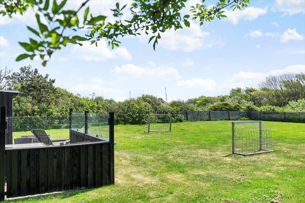 Både foran og bagved huset er en dejlig have med store græsplæner til leg, boldspil og fodboldmål. Hele grunden er indhegnet og børn og hunde kan derfor boltre sig frit i haven. Fra udestuen går man ud på en sydvestvendt terrasse, hvor man kan færdes helt ugeneret, og derudover kan man bruge den østvendte terrasse ved et af værelserne, hvor der også findes en udendørsvask. Til børnene er her en sandkasse, og om aftenen kan man hygge sig med gode grillmåltider og udnytte de lange og forhåbentligt lune sommertimer.