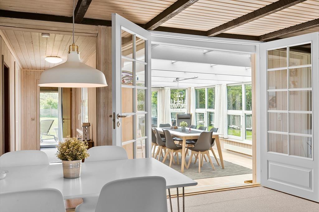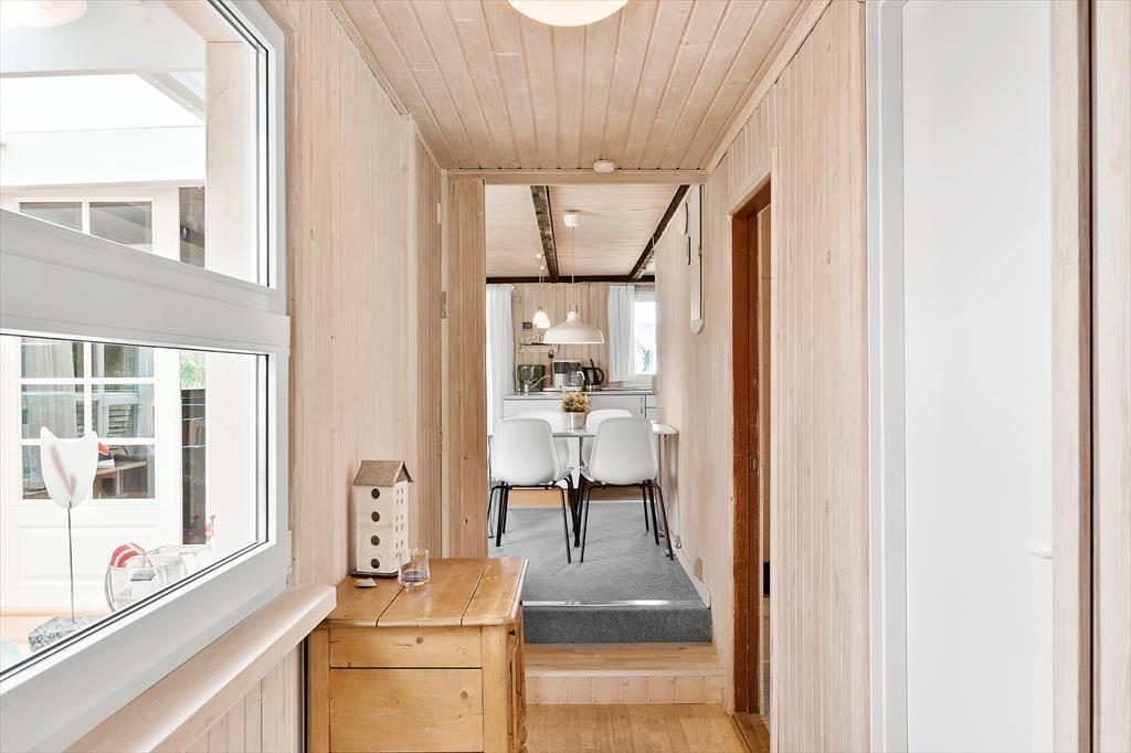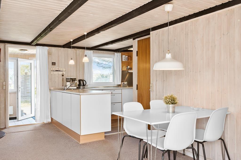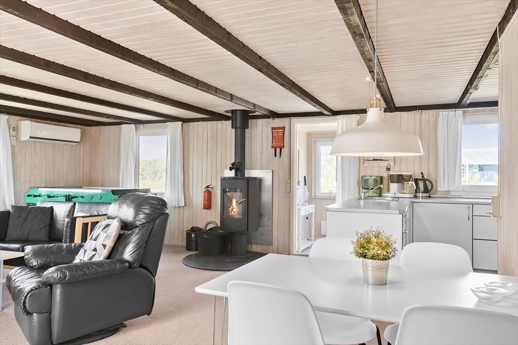 Dette fine sommerhus på knap 100m2 er i rigtig god stand og kommer til at danne rammen om mange gode ferier ved Løkken. Huset er løbende blevet moderniseret og fremstår i dag med synlige loftsbjælker og en nyere udestue med masser af lys fra de store loft-til-gulv vinduer, som fungerer som et lille aktivitetsrum og med udgang til en af terrasserne. Alle rum er indrettet i en varm og personlig stil, og af teknisk udstyr finder man både parabol, trådløst internet, dvd/blu ray og PlayStation 2, så der også er lidt at lave, hvis vejret en dag driller. Køkkenet ligger i hjørnet af det store opholdsrum og giver nem adgang til stuen.På badeværelset er brusekabine,puslebord, vaskemaskine og tørretumbler, og langs entreen finder man meget praktisk de tre værelser samlet i en soveafdeling, her er i alt plads til seks overnattende personer. Alt i alt et absolut skønt og brugbart hus for både familier og par. Hele huset opvarmes med varmepumpe og brændeovn.