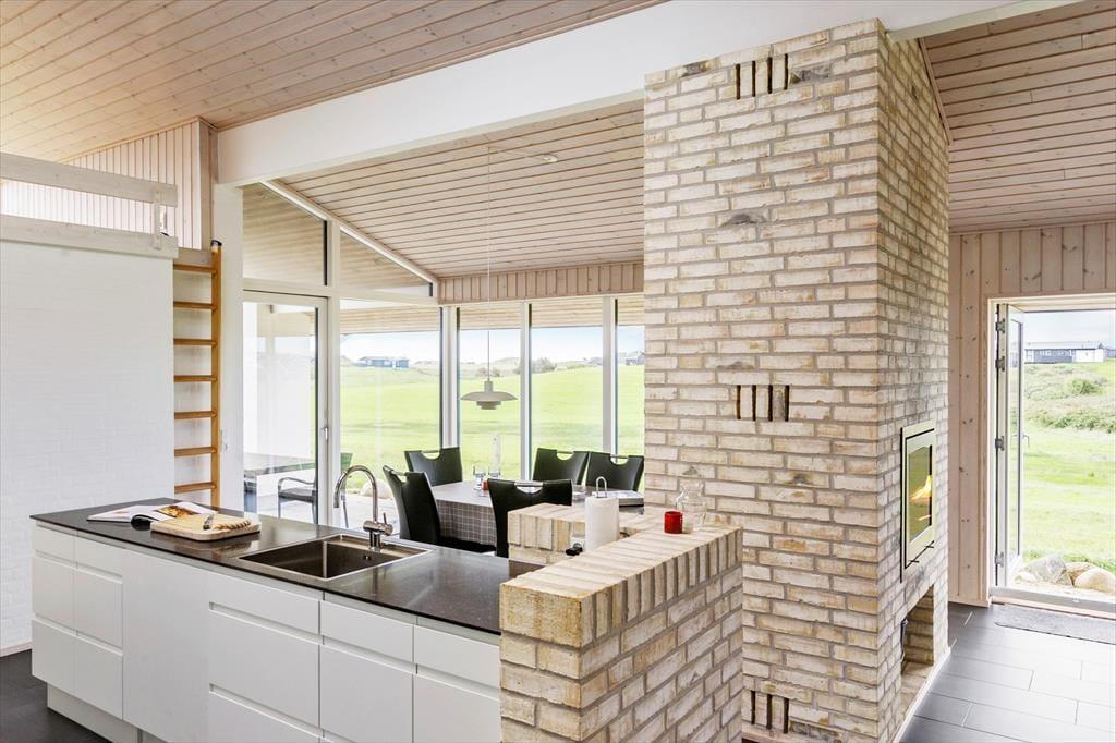 Når du træder ind i Bræmmen 8, bliver du mødt af en lys og indbydende indretning, der sætter tonen for din ferie. Det moderne sommerhus er bygget med fokus på kvalitet og funktionalitet, og den åbne planløsning mellem køkken, spiseplads og stue skaber en harmonisk og rummelig atmosfære. Store vinduespartier lader dagslyset strømme ind og giver et dejligt lysindfald i hele huset, så du kan nyde den smukke udsigt over landskabet. Køkkenet er pænt og veludstyret, og det åbner op til spisepladsen, hvor du kan samles omkring bordet og hygge dig med god mad og samtale. I stuen er der en brændeovn, som indbyder til hygge på de kølige aftener, og du kan også finde et roligt hjørne til afslapning. Sommerhuset har desuden to badeværelser, hvilket giver ekstra komfort, og forstuen med vaskemaskine og tørretumbler gør praktiske opgaver lettere under ferien.