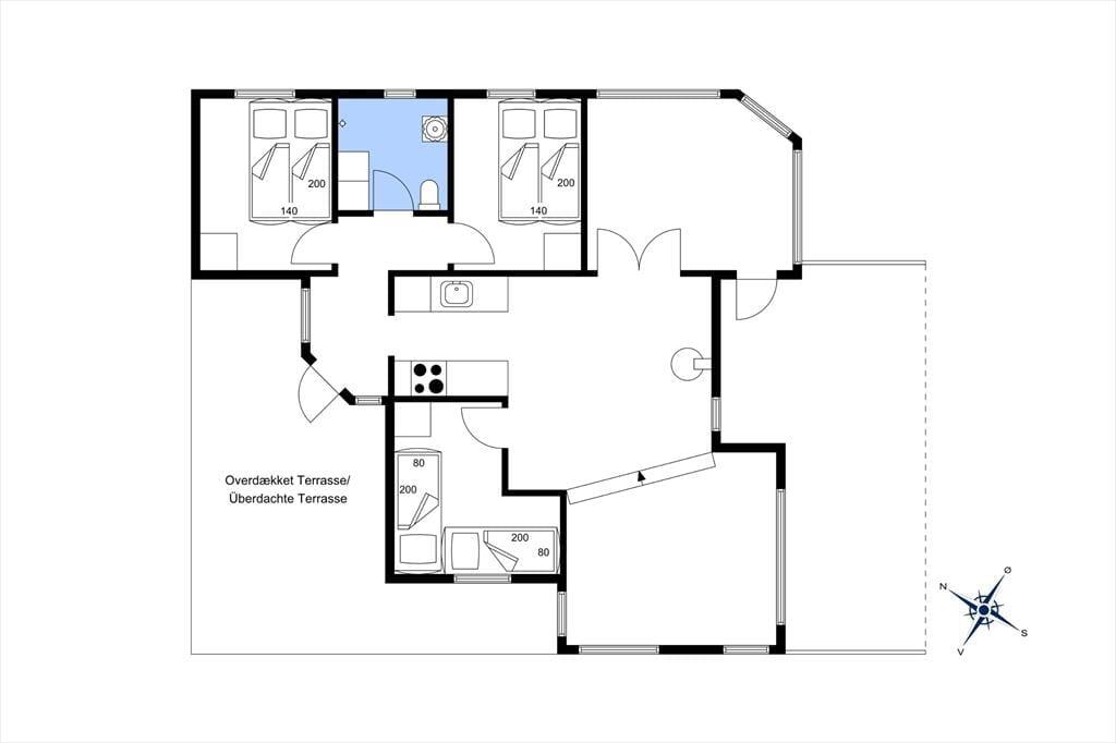 Den hyggelige sommerhusstemning underbygges af husets brændeovn, som står centralt placeret mellem stueafdelingerne og køkkenet i en mellemstue. Her fra er der et trin ned til dagligstuen med godt lysindfald, sofagruppe og fjernsyn. Fra mellemstuen til spisestuen er der ligeledes et trin ned, og her er der tilmed en dør, som kan lukkes, hvis man vil dele den ellers meget åbne stueafdeling op. Huset har flere hyggelige kroge, hvor det er oplagt at sidde med en god bog. Der er to soveværelser med dobbeltsenge og ét værelse med enkeltsenge i huset, som også har opvaskemaskine og vaskemaskine for at gøre ferien så bekvem og afslappende som muligt.