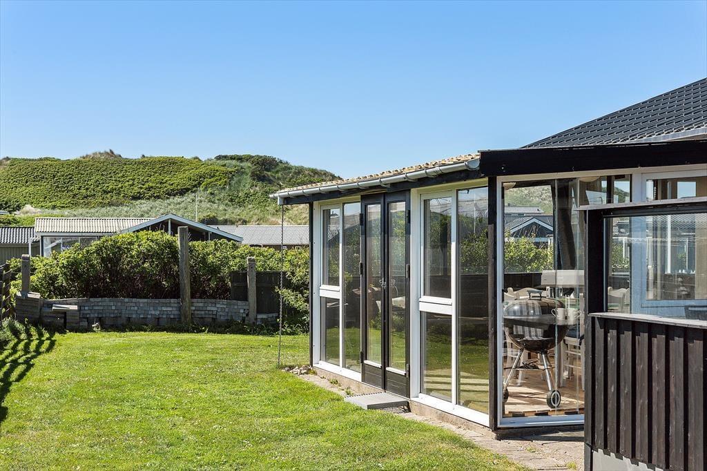 Vågner I op til solskin og lune temperaturer, kan I overveje, om morgenmaden skal serveres ude i det fri. Sommerhusets terrasse er orienteret mod syd og ligger i læ af udestuen, så der er skønt at være det meste af dagen. En del af den 1.063 m2 store grund er helt lukket af med stakit, og det er rart, hvis I har hund med på ferie. Hele grunden er for øvrigt enkelt anlagt med græsplæne, og så er der garage til bilen.