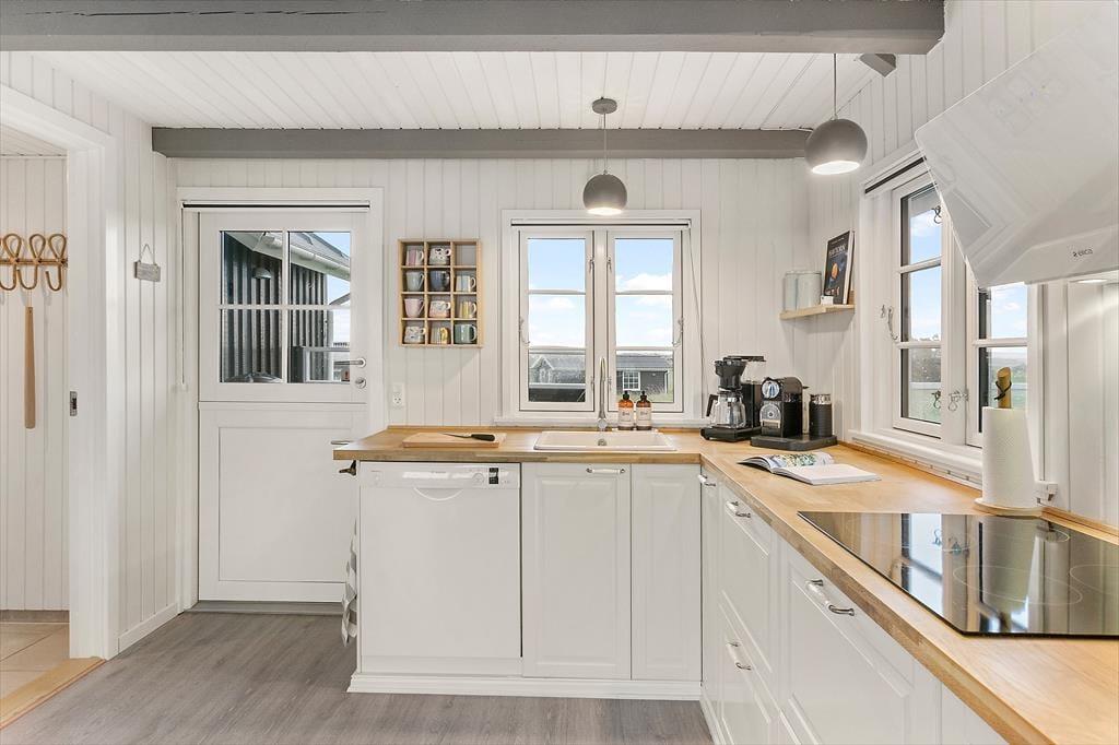 Atmosfæren er lys og venlig overalt i det 89 m2 store sommerhus, der er opført i 2015. Det pæne møblement passer godt til de lyse trævægge og loftet, der går helt til kip, og stuens brændeovn er med til at understrege hyggestemningen. I stuen hænger for øvrigt et fladskærms-tv, og så er der åben forbindelse til et pænt og veludstyret køkken, hvor I sagtens kan være flere om at kræse om maden. Et godt brusebadeværelse og en entré med vaskesøjle hører med til planløsningen, og endelig er der to gode soveværelser, der i alt har sengepladser til fire voksne og to børn.