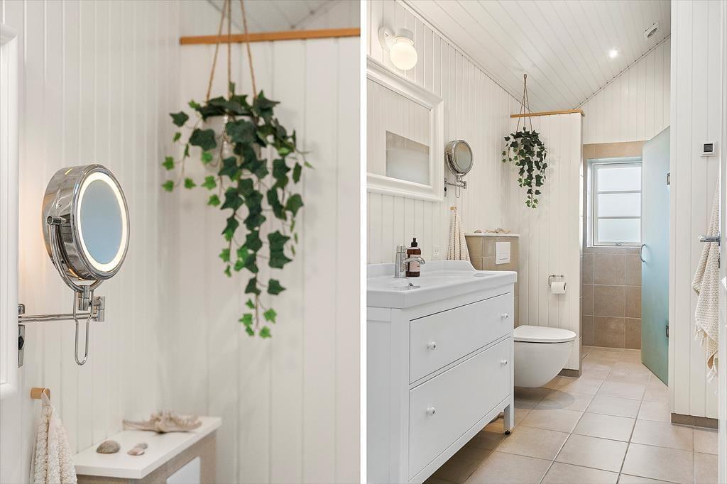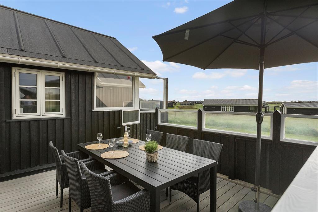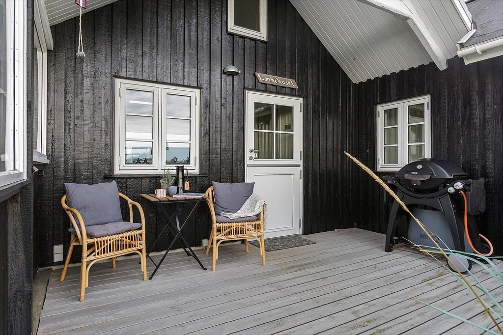 Terrasserne er smart placeret på begge sider af sommerhuset, og derfor kan I finde en solrig opholdsplads hele dagen lang. Afskærmningen sørger for læ, og der er også et overdækket areal, hvis I får brug for at finde ly for en forbipasserende byge. Grunden er enkelt anlagt med en god græsplæne, og der er også en udendørs bruser, så I nemt kan skylle sand og saltvand af efter strandturen.