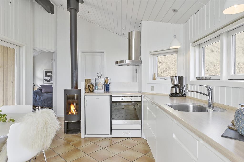 Sommerhuset er indrettet med gode kvalitetsmøbler og er velegnet to personer. Huset byder på en flot opholdsstue med brændeovn, et soveværelse med dobbeltseng og et lille lækkert badeværelse med brusekabine og gulvvarme. Køkkenet ligger i åben forbindelse til stuen og entreen, og tænder man op i brændeovnen spreder hyggen sig lynhurtigt. Sommerhuset er en virkelig perle!