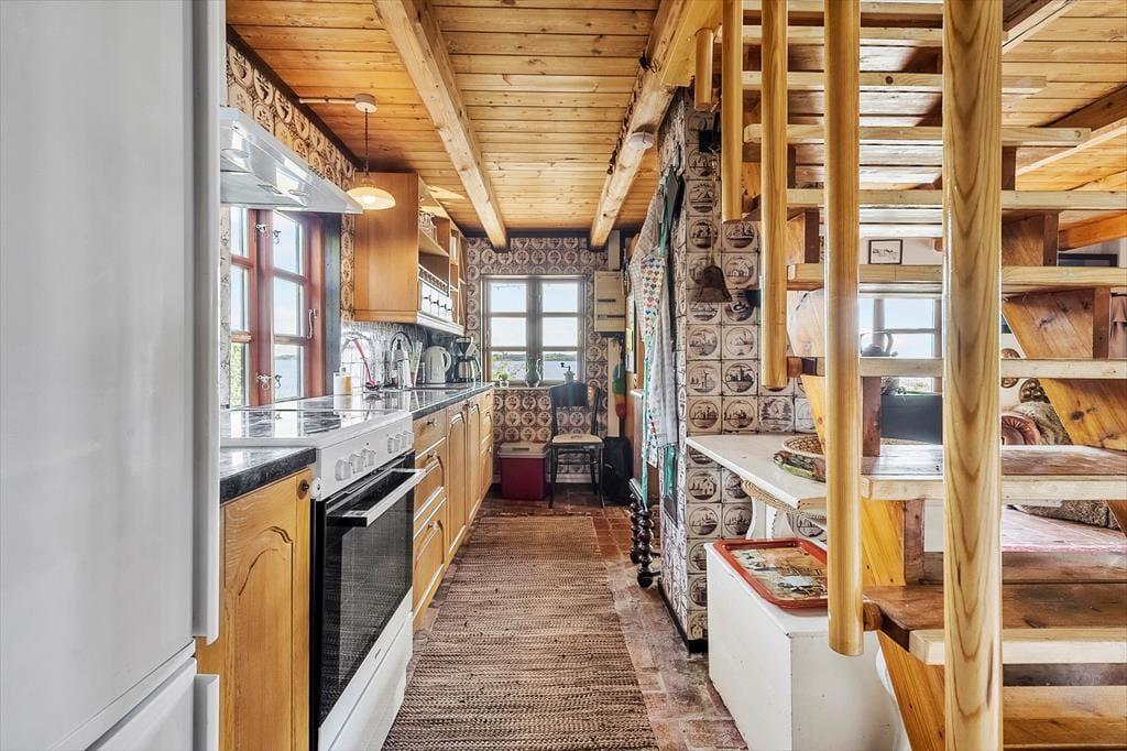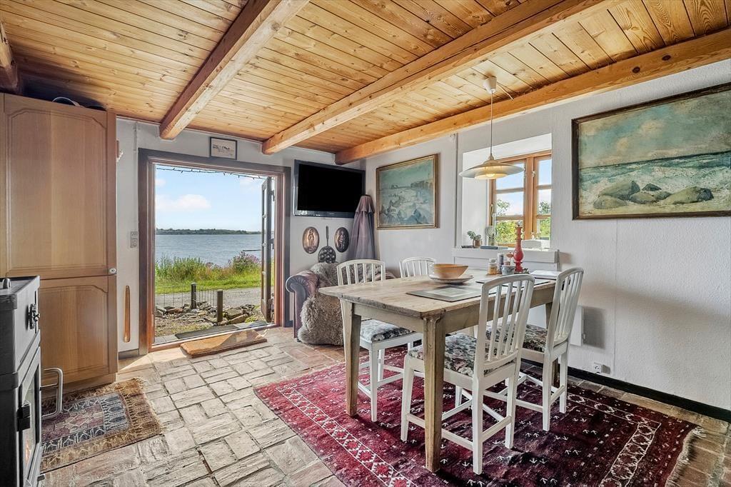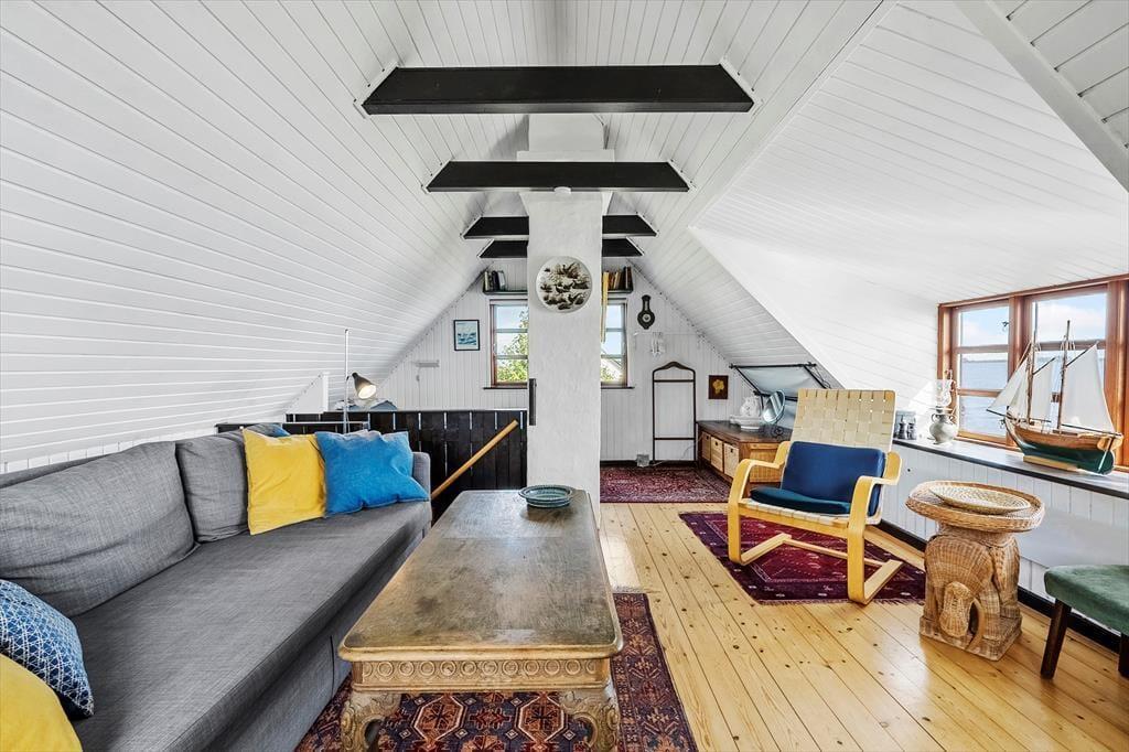 I stueetagen finder man spisestue med plads til samvær og ro, mens køkkenet fremstår funktionelt og charmerende – med alt det nødvendige til feriens måltider. Fra flere af rummene og især fra den hyggelige have og terrasse kan du nyde panoramisk udsigt over havet, som ligger blot få skridt væk. Der er intet som lyden af bølger og duften af salt luft, der strømmer ind gennem de åbne vinduer.