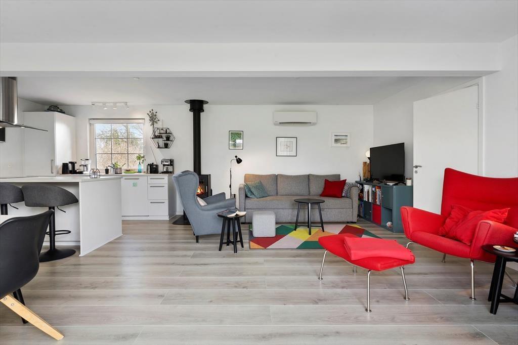 Sommerhus i Fyns Hoved, Fyn med øer, med plads til 6 voksne og 2 husdyr. Der er en hyggelig indretning med bl.a. brændeovn, og du finder desuden vaskemaskine, opvaskemaskine og tørretumbler i boligen.