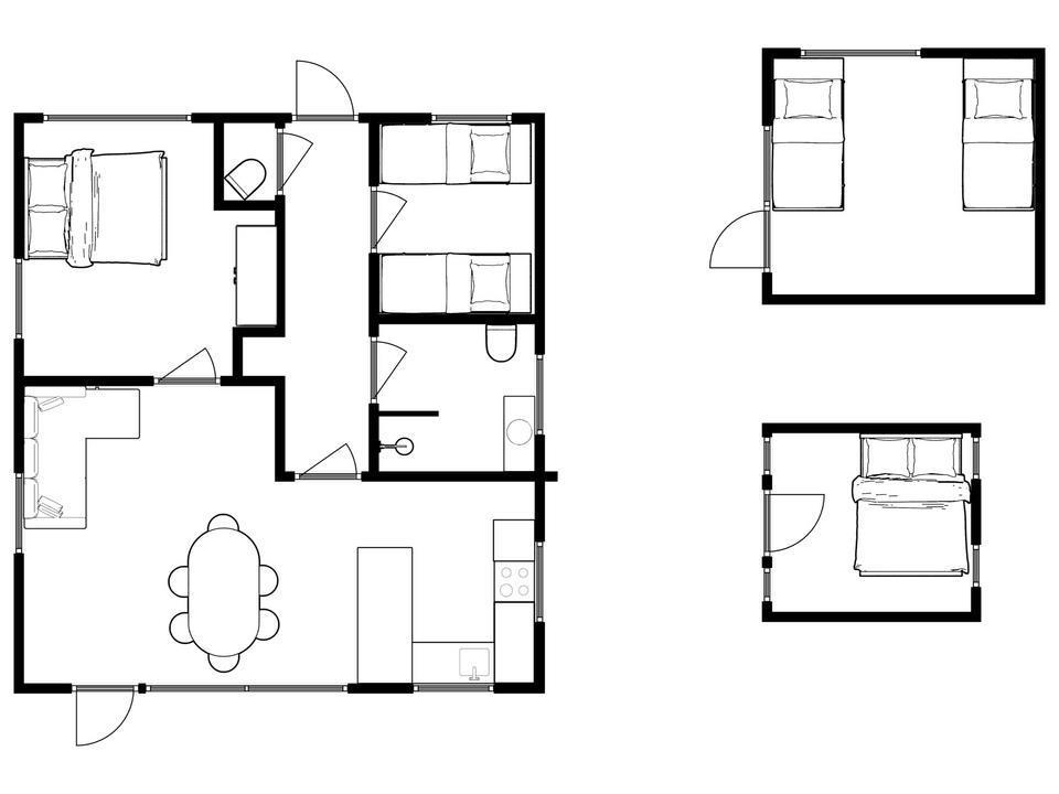 Sommerhuset rummer i alt fire soverum. Hovedhuset har 2 soverum, et stort værelse med dobbeltseng og panoramaudsigt til vandet samt et værelse med to enkeltsenge. Herudover er der to separate annekser, det ene på 16 m² med to enkeltsenge og det andet på 9 m² med dobbeltseng, begge med udsigt til vandet. Huset har desuden et rummeligt badeværelse med brusekabine og vaskemaskine samt et praktisk gæstetoilet.