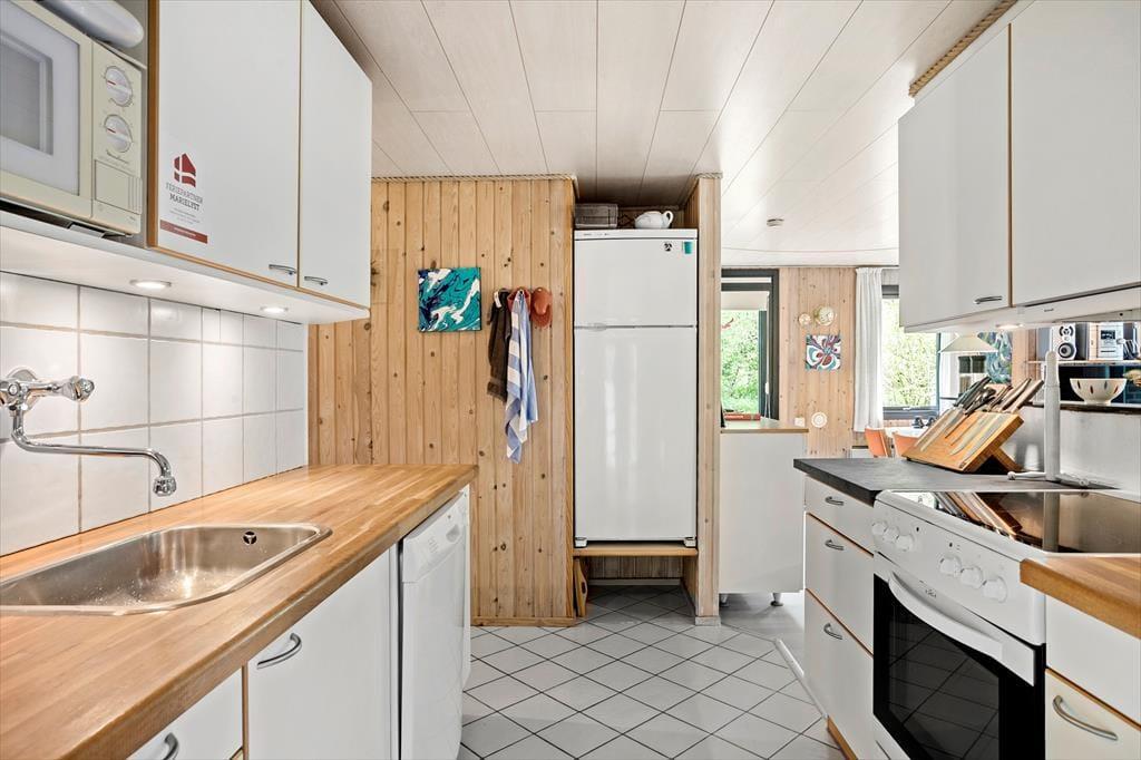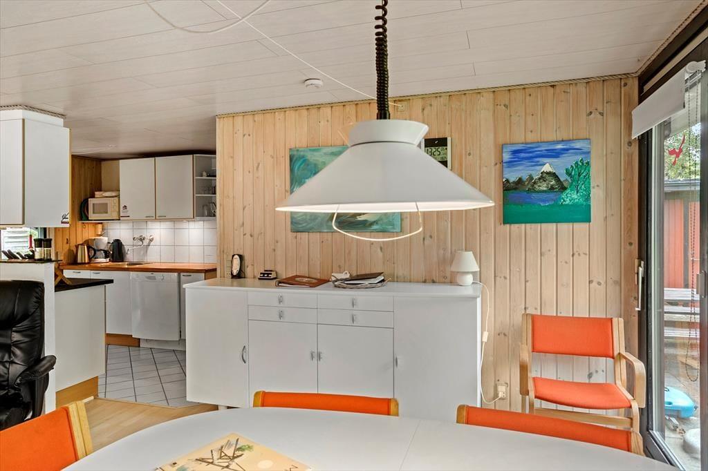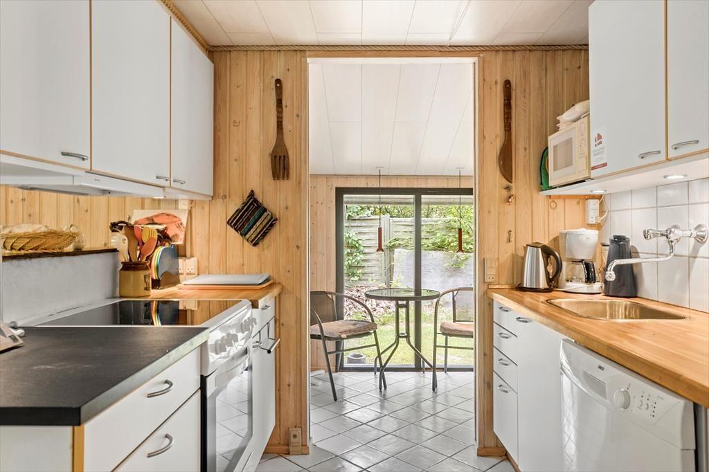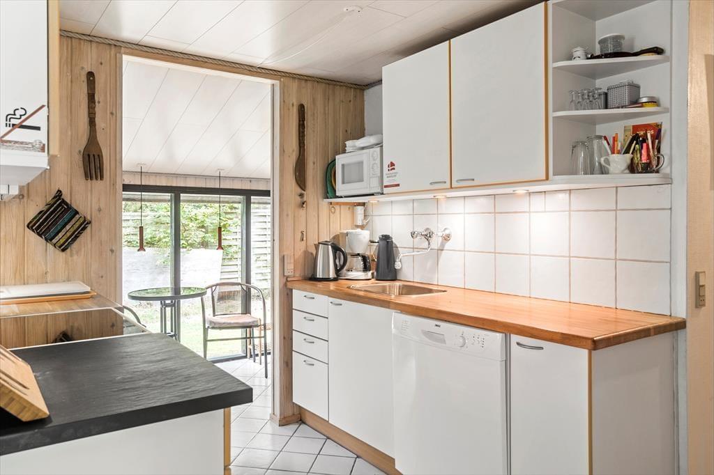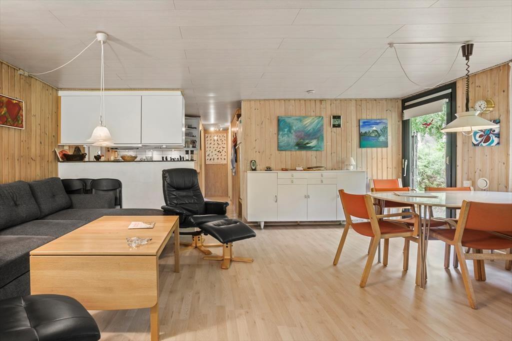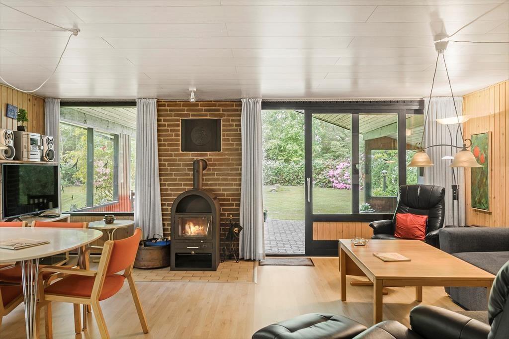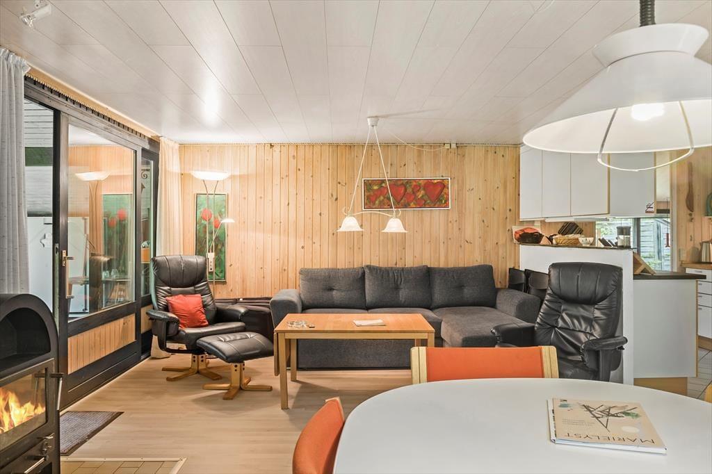 Fra entreen kommer man til køkkenet, som ligger i delvis åben forbindelse med spiseafdelingen samt resten af stuen. Stuen tilbyder en sofaafdeling med brændeovn i den ene side. Fra stuen er der ligeledes udgang til skønne terrasse, samt store vinduespartier ud mod haven som giver et godt lysindfald i stuen.