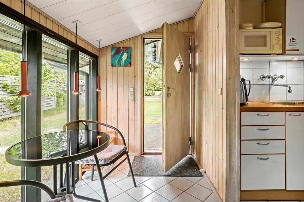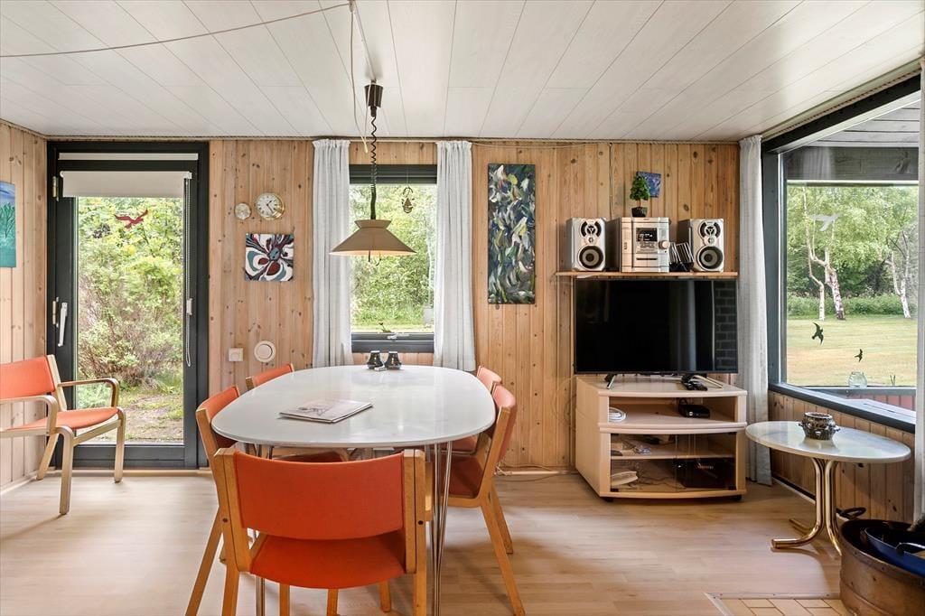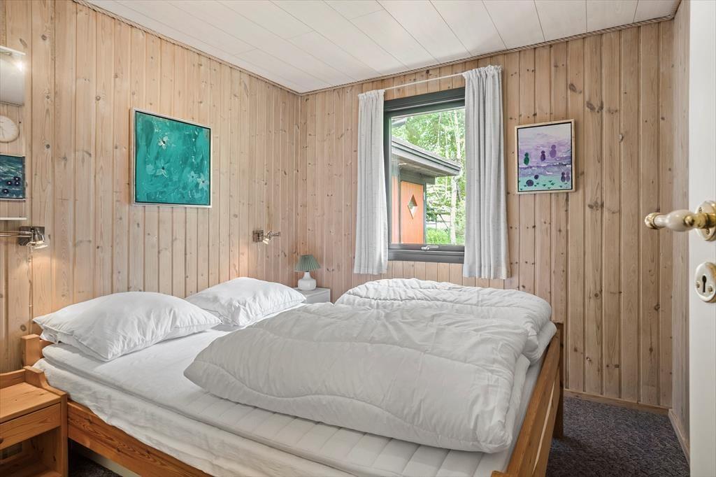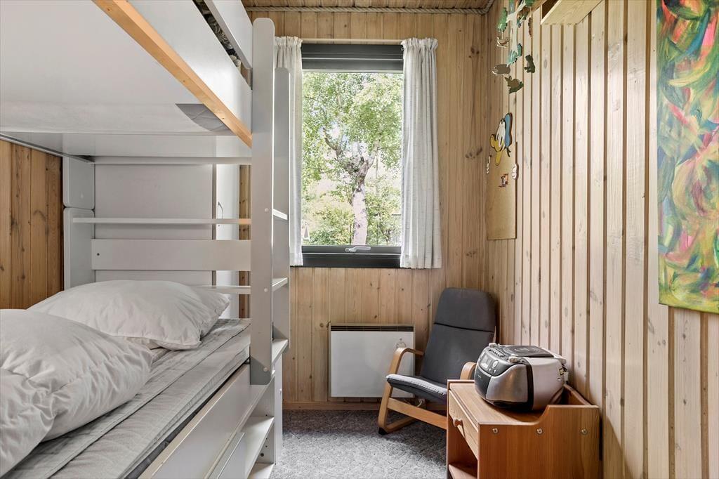 Fritidshuset indeholder: entré, 3 soveværelser, 2 af soveværelserne med dobbeltseng og 1 soveværelse med køjeseng samt badeværelse med bruser og WC.