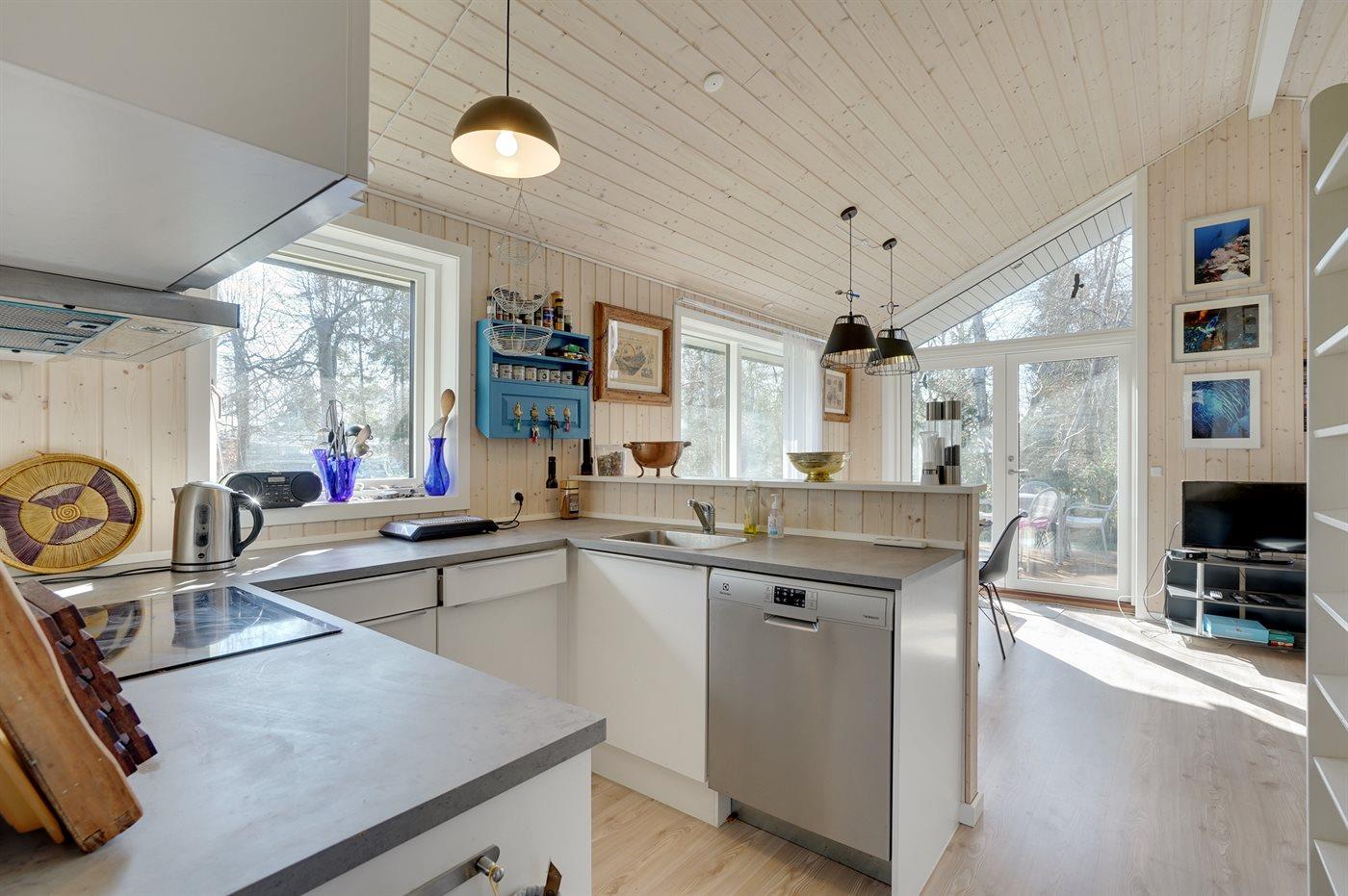 Køkkenet er udstyret med 1 køleskab. Der er 4 induktionskogeplader, varmluftovn samt opvaskemaskine.