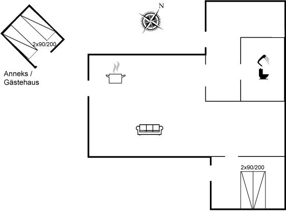 Der er i alt 2 soveværelser. Sovepladserne fordeler sig på: 2 sovepladser i dobbeltseng. 2 sovepladser i enkeltsenge. 2 sovepladser i sovesofa (dobbelt). 2 af disse sovepladser befinder sig i et anneks og 2 af dem befinder sig i opholdsstuen.