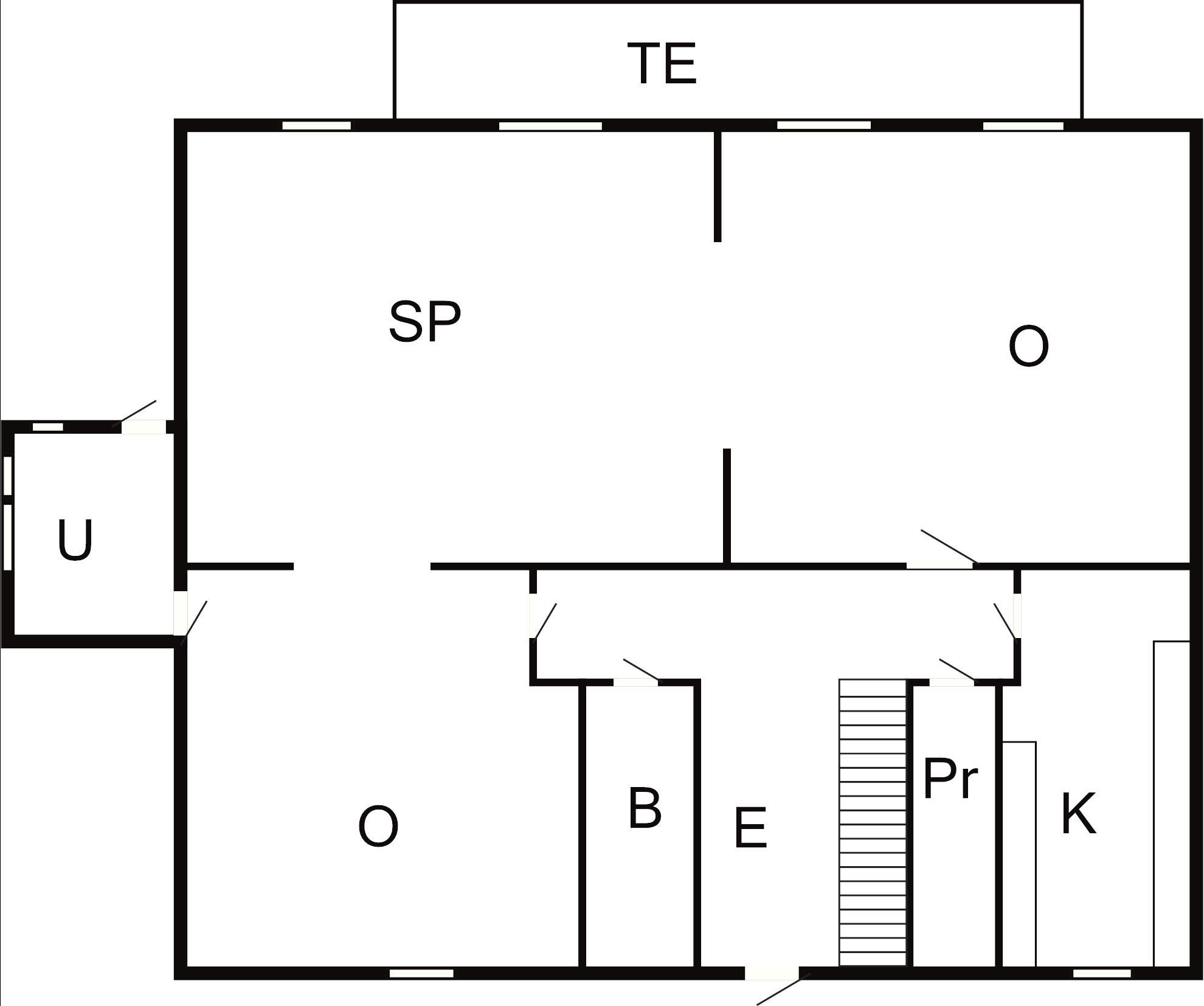 Feriehuset har to etager. I stueplan er der entré, køkken, lille toilet, stue, samt en lille udestue. På første sal er der soveværelser bestående af et værelse med dobbeltseng, et værelse med to enkeltsenge og et værelse med dobbeltseng. Der er også et badeværelse med toilet, håndvask og bruser. Køkkenet har elektriske kogeplader, separat ovn og køleskab med fryser. I stuen er der tv med Chromecast, internet og brændeovn.