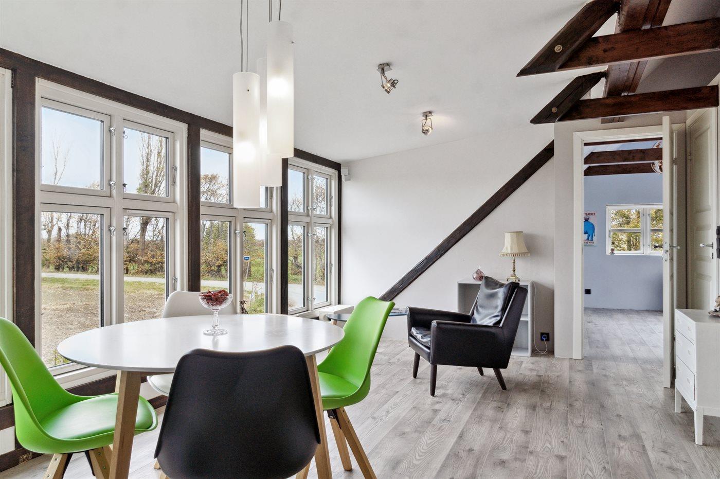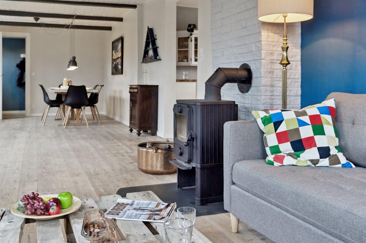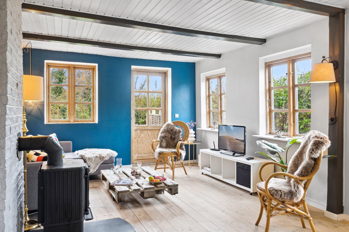 Stuen er stor, luftig og lys. Det åbne rum er inddelt i en spiseplads til 6-8 personer og et hyggeligt sofa-hjørne med TV og brændeovn til de kolde dage. Imellem de to områder er der desuden rigeligt med gulvplads til at spille Twist eller rulle yogamåtten ud.