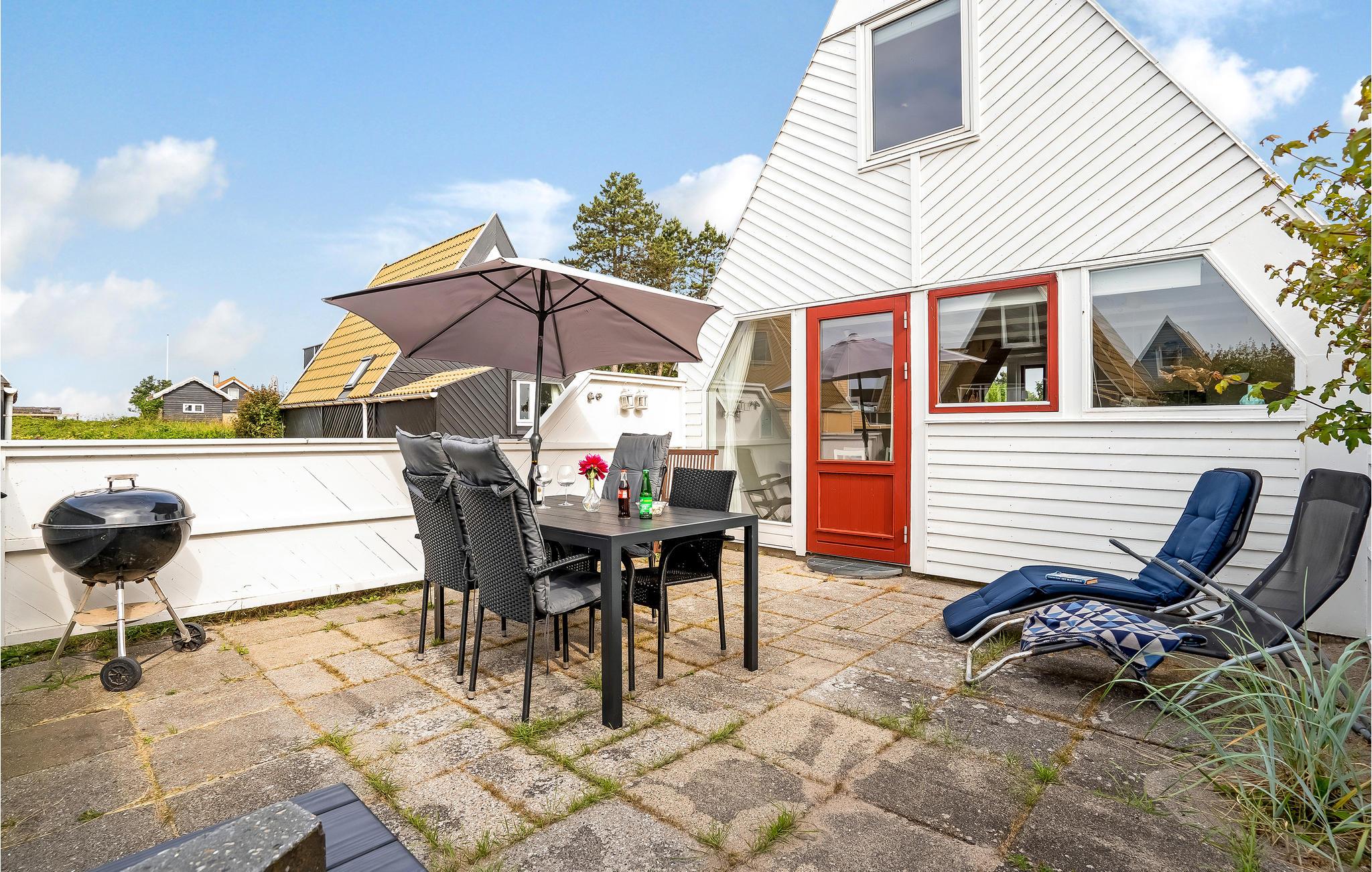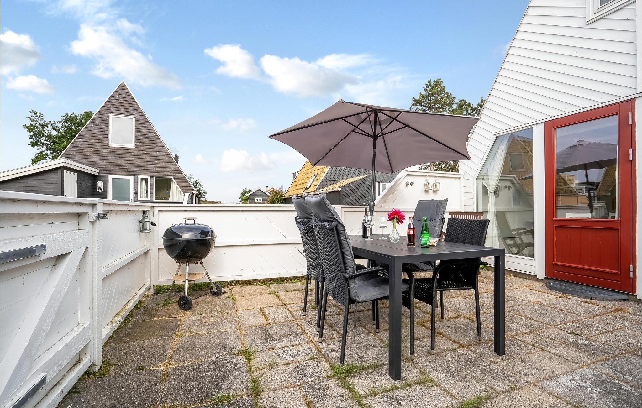 Hyggeligt feriehus ved vandet med havudsigt, terrasse og adgang til legeplads og tennisbane.