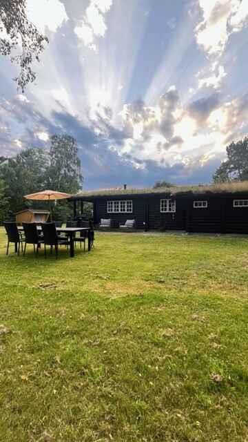 Hyggelig norsk bjælkehytte med græs på taget, 800 m fra Gedesby strand, perfekt til ro og nærvær.