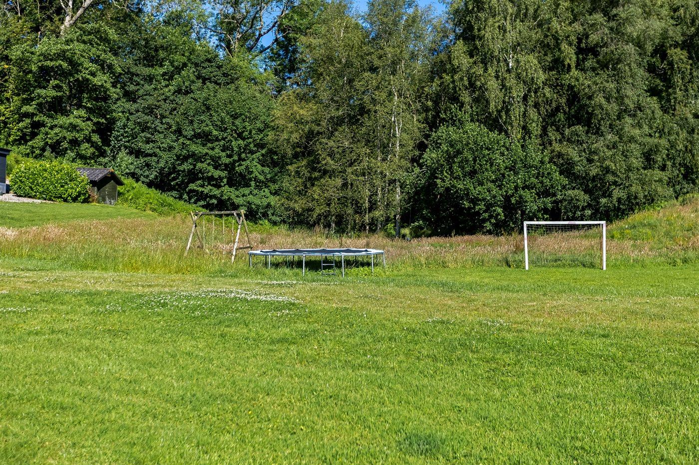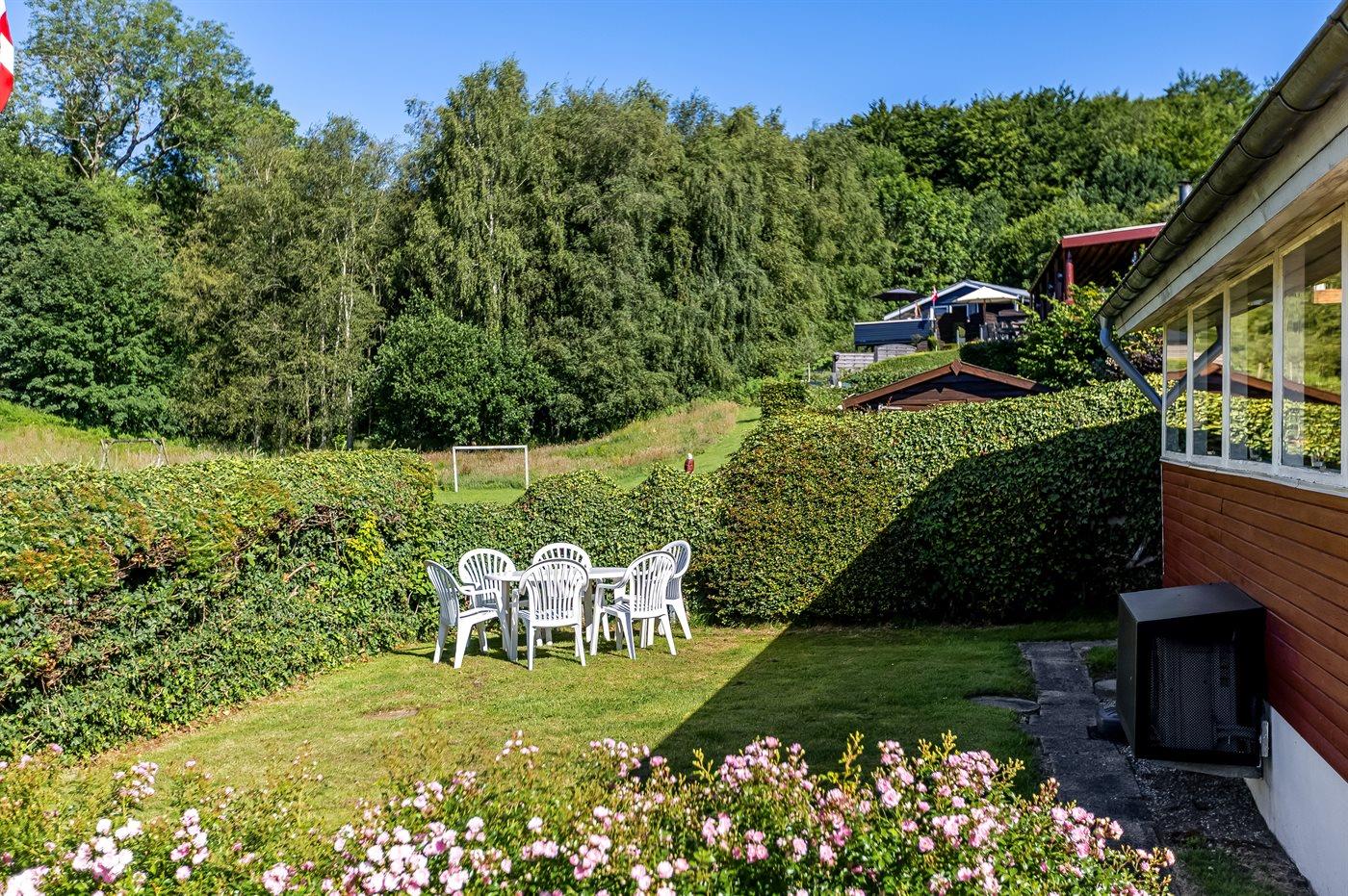 Ferieboligen er beliggende på en 221 m² stor havegrund. Grunden er indhegnet. Der er 100 m til havet. Nærmeste forretning er beliggende i en afstand af 6000 m. Til ferieboligen hører 7 m² terrasseareal. Desuden er der 14 m² overdækket terrasse. Der er redskabsrum. Gynge. Trampolin. Fodboldmål. Der er installeret stik til opladning af elbil. Parkering ved ferieboligen.