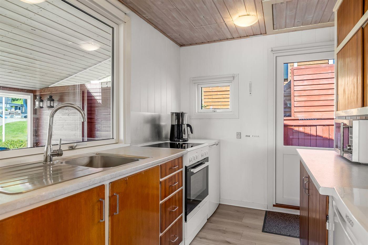Køkkenet er udstyret med 1 køleskab. Der er 4 keramiske kogeplader, varmluftovn, mikrobølgeovn.