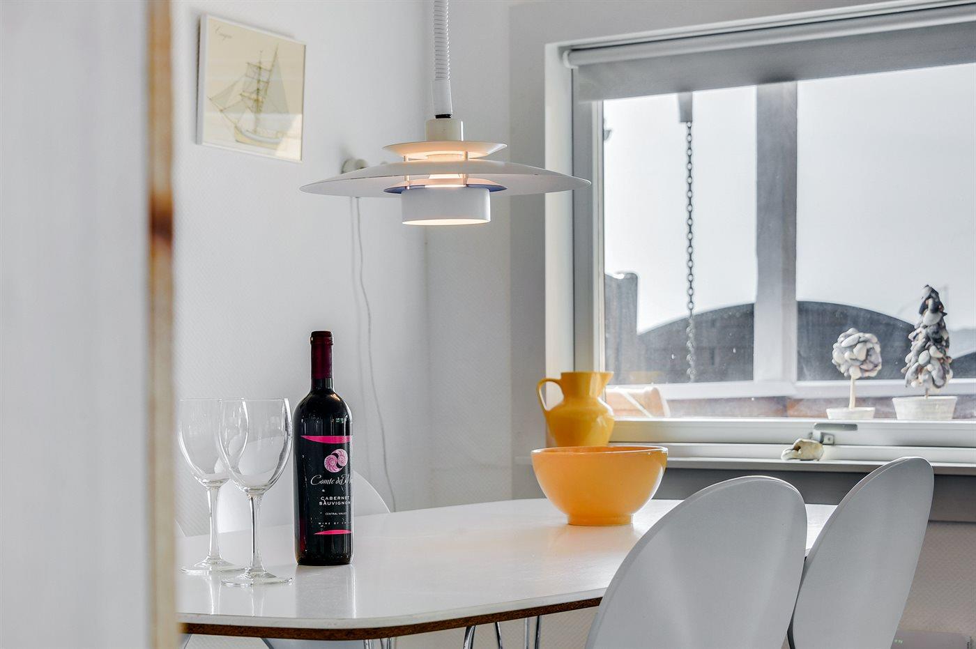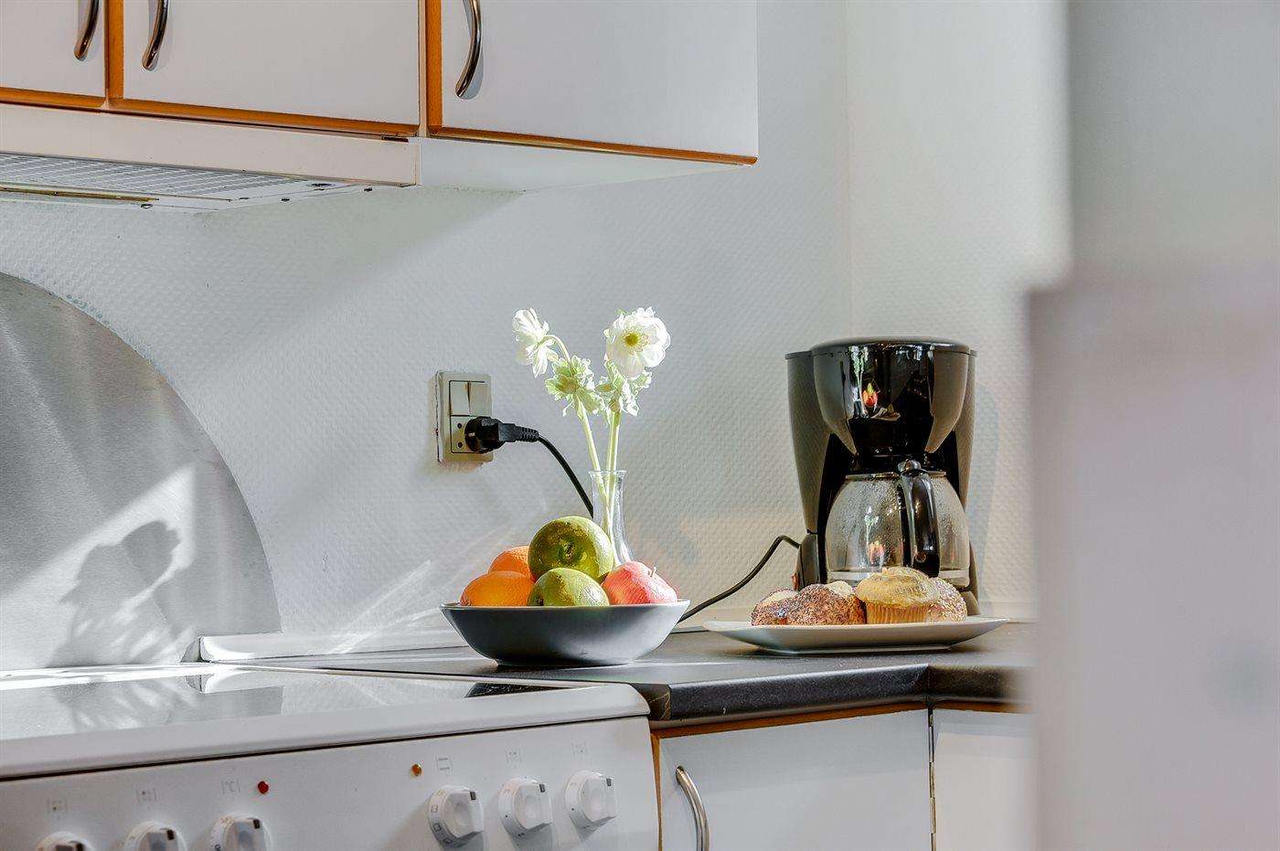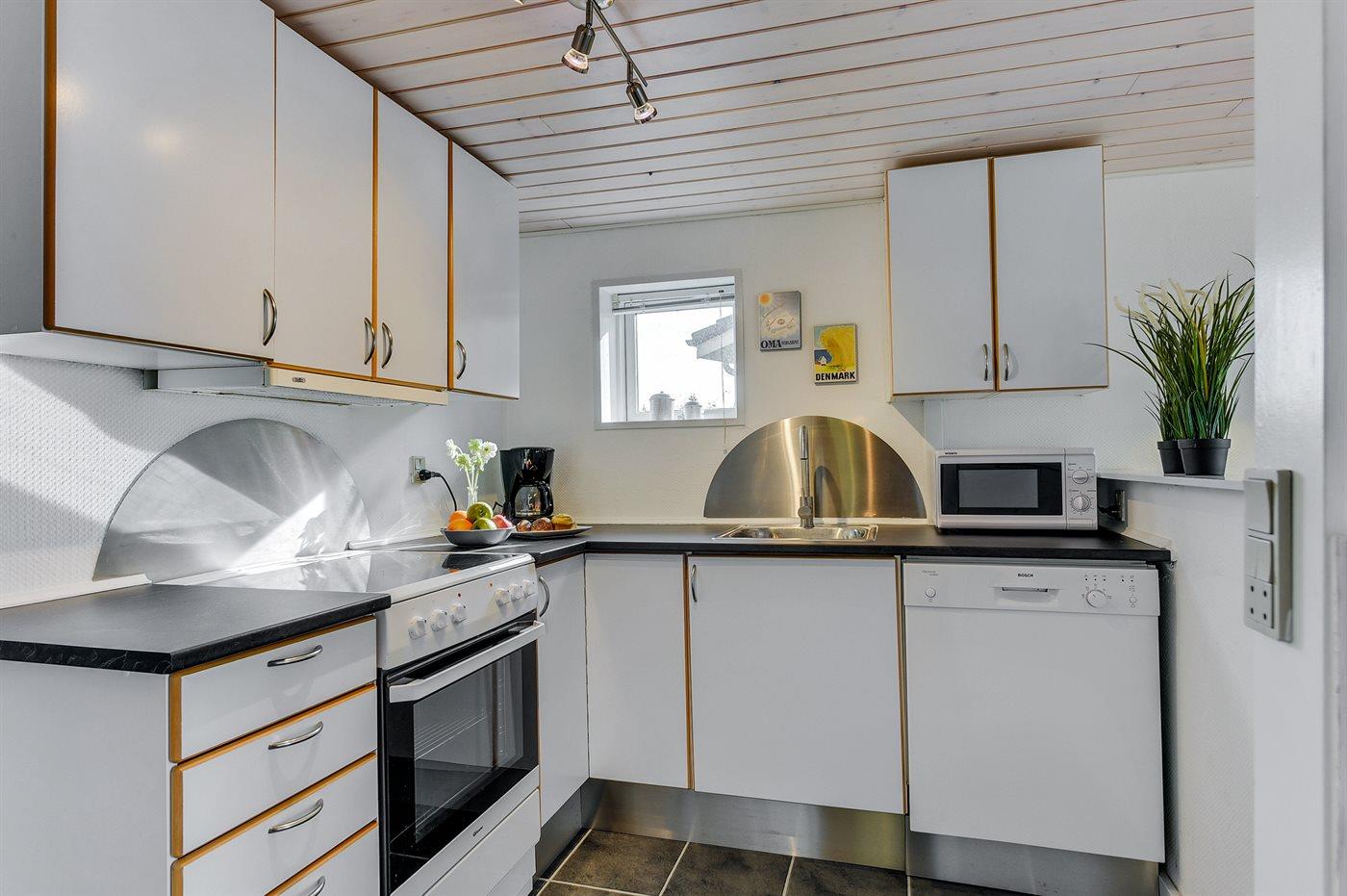 Køkkenet er udstyret med 1 køleskab. Der er 4 keramiske kogeplader, varmluftovn, mikrobølgeovn samt opvaskemaskine.