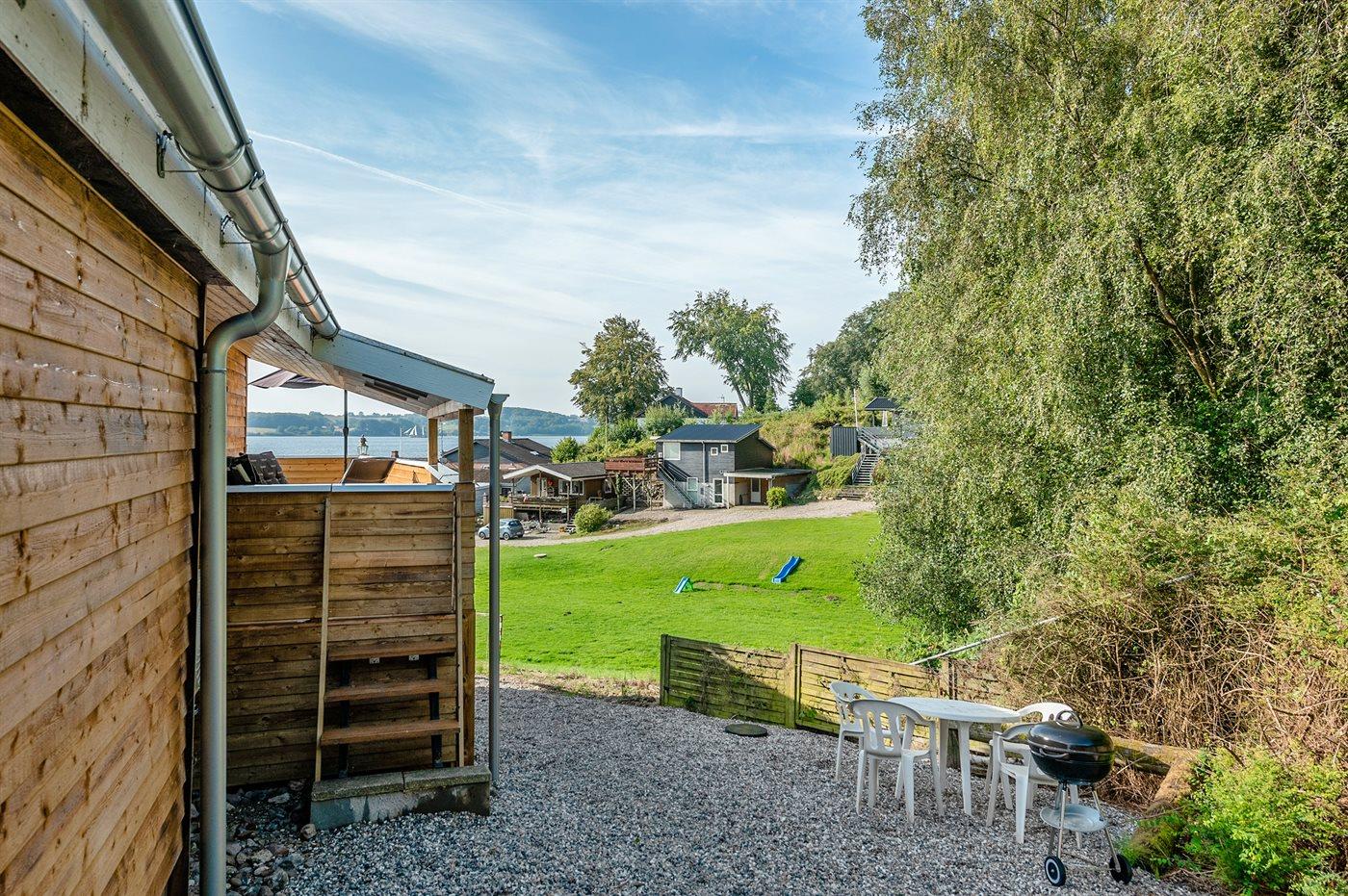 Ferieboligen er beliggende på en 220 m² stor naturgrund. Der er 100 m til havet. Der er en badebro i nærheden. Nærmeste forretning er beliggende i en afstand af 6000 m. Til ferieboligen hører 60 m² terrasseareal. Desuden er der 10 m² overdækket terrasse. Heraf i alt 50 m² lukket terrasse.